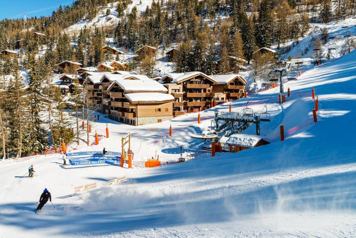 Diese Residenz „Les Chalets d'Edelweiss" besteht aus 83 Wohnungen in 7 Chalets mit 3 Stockwerken (mit Aufzug) im Herzen des Ferienortes Plagne 1800. Sie ist im traditionellen Stil aus Stein und Holz mit Schieferdächern gebaut. Zu Ihrer Verfügung: ein kostenloses beheiztes Hallenbad (ca. 9,5 x 4 m). Fläche von ungefähr 51 m². Niveau 0 : Wohnzimmer mit Klappschlafcouch. Kochnische mit Wasserkocher, Kaffeemaschine, Toaster, Dunstabzugshaube, Geschirrspülmaschine, Mikrowellenherd, Glaskeramikkochfelder, Kühlschrank. Badezimmer mit WC. Waschräume mit Dusche. Niveau 1 : Schlafzimmer mit Doppelbett. Schlafzimmer mit 2 Einzelbetten. offener Schlafbereich mit 2 Stockbetten. Die oberen Betten sind nicht für Kinder unter 6 Jahren geeignet.