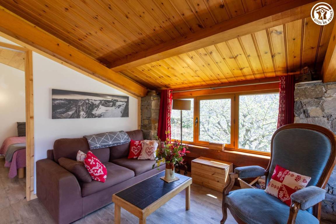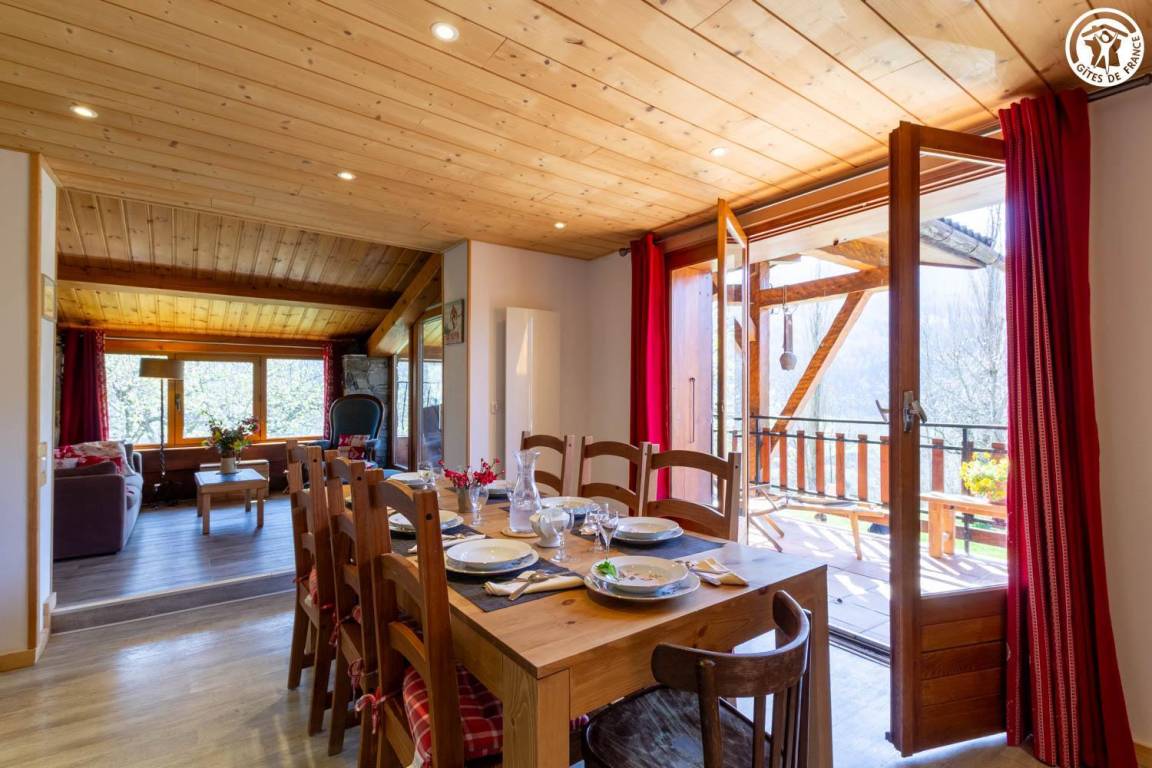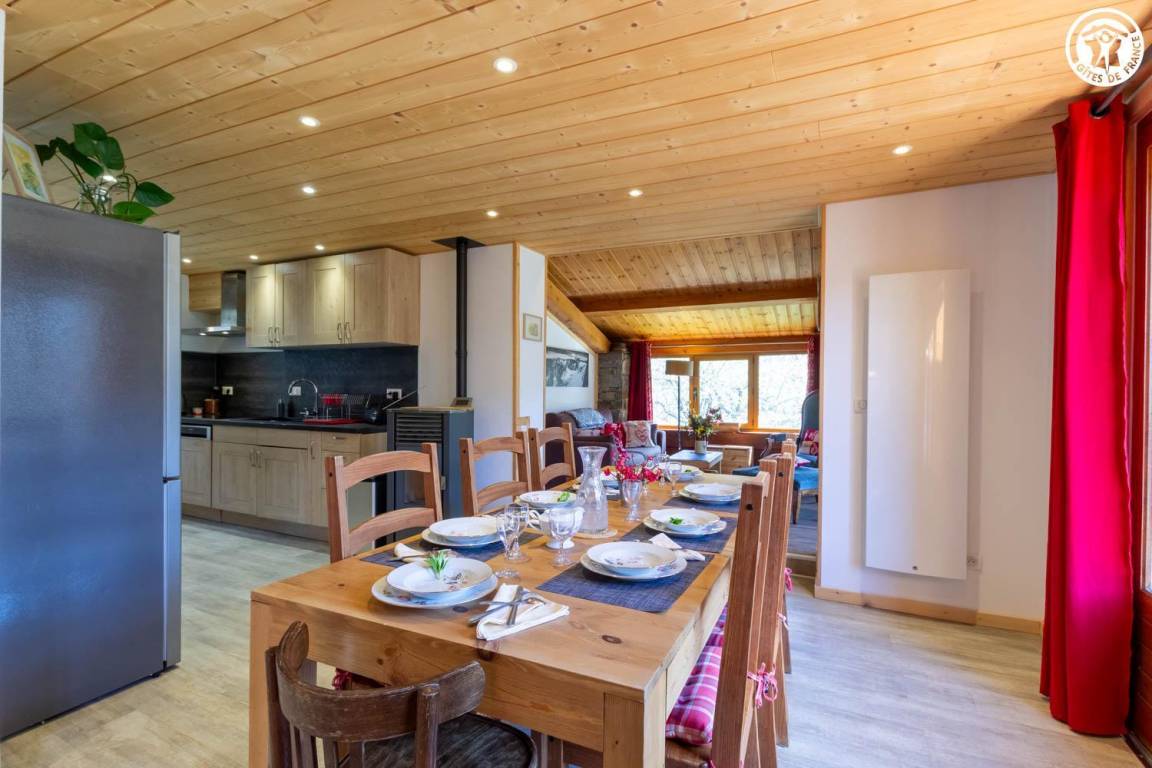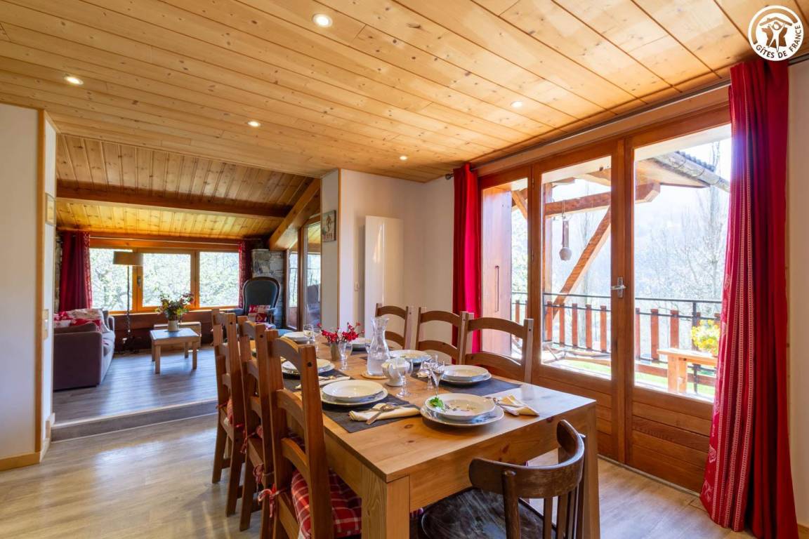 Geräumiges und komfortables zweistöckiges Haus für bis zu 8 Personen. Große, überdachte Terrasse in Südlage mit atemberaubender Aussicht auf den Ferienort La Plagne. Großer privater Garten. Helles Wohnzimmer mit freiliegenden Balken und Steinwänden, die dem Raum Charakter verleihen.