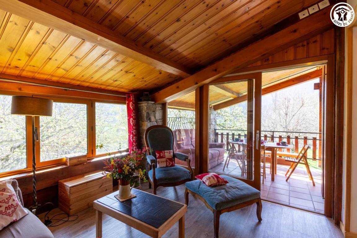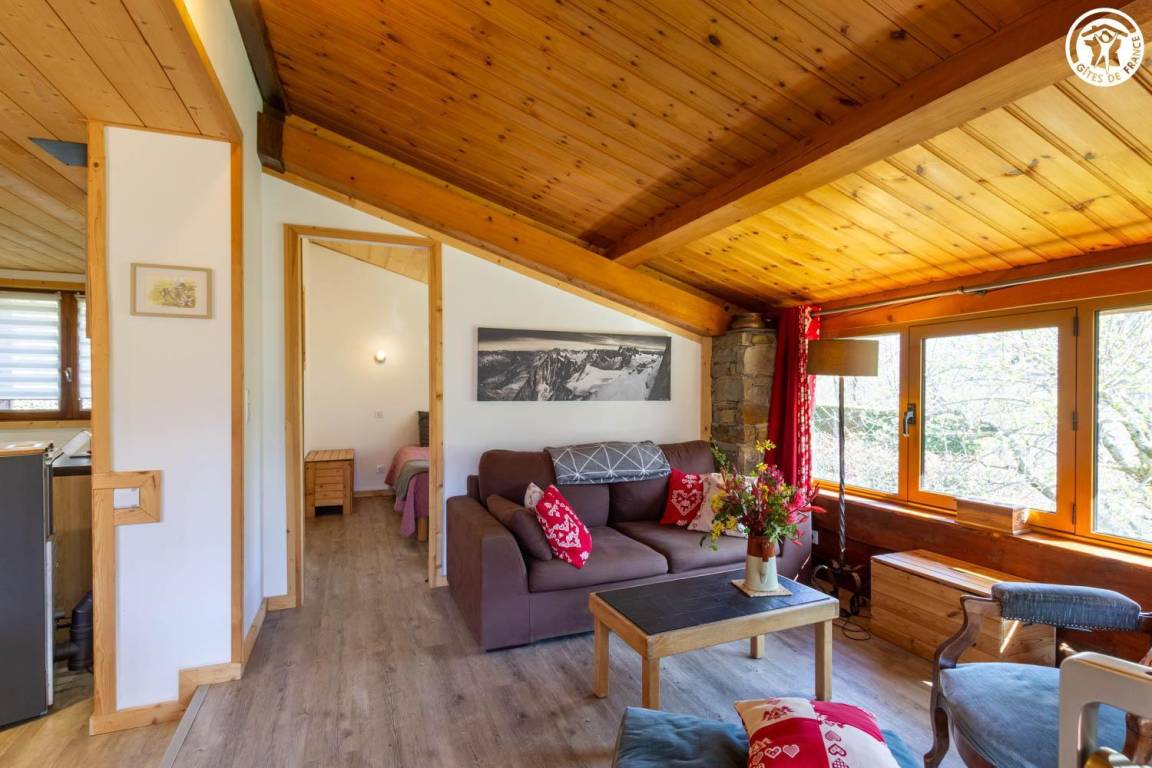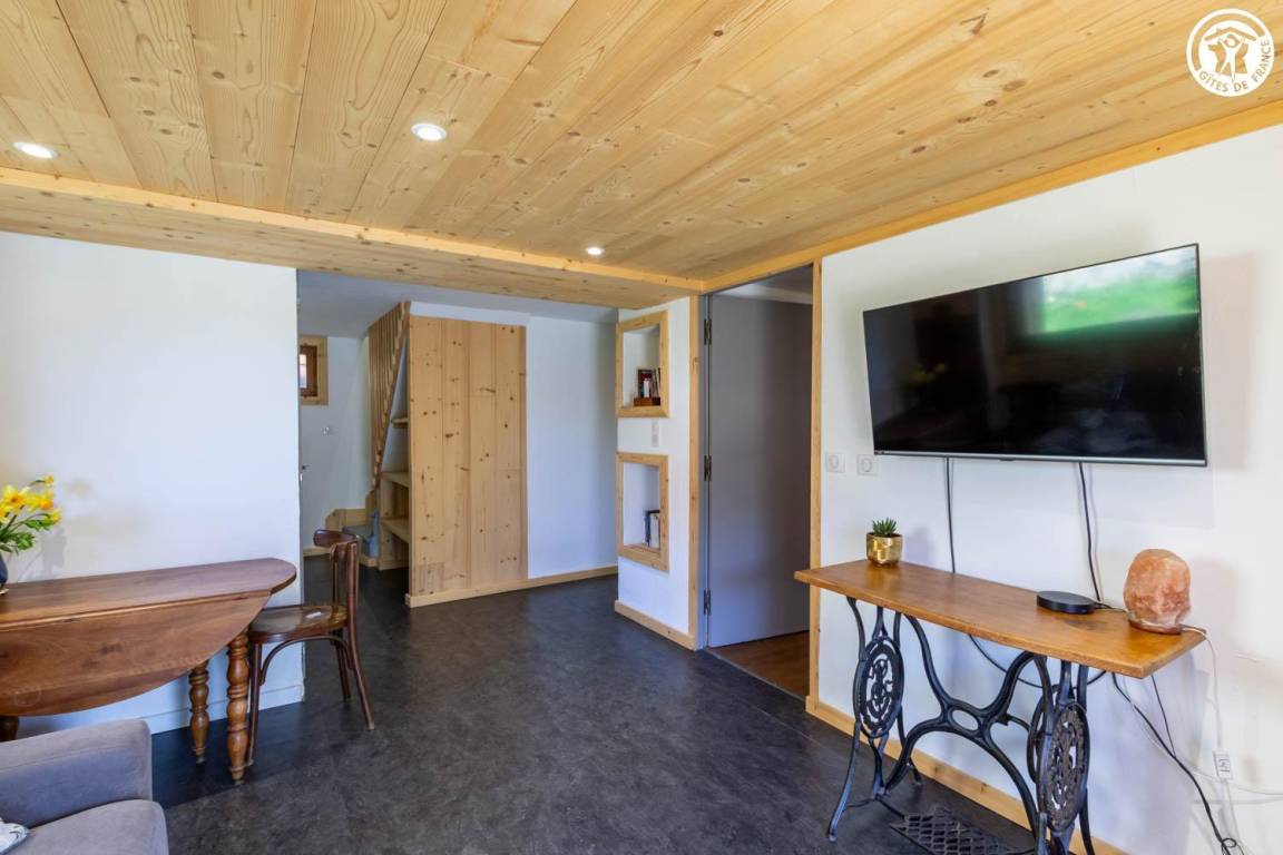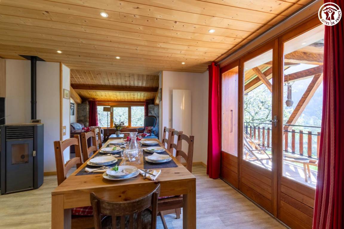 Geräumiges und komfortables zweistöckiges Haus für bis zu 8 Personen. Große, überdachte Terrasse in Südlage mit atemberaubender Aussicht auf den Ferienort La Plagne. Großer privater Garten. Helles Wohnzimmer mit freiliegenden Balken und Steinwänden, die dem Raum Charakter verleihen.