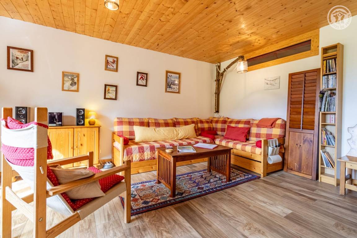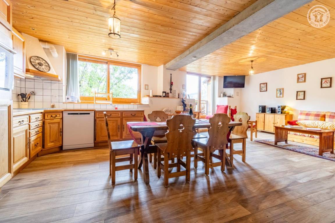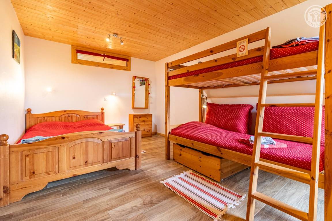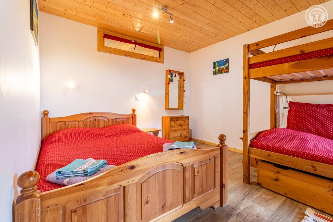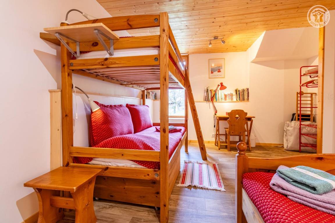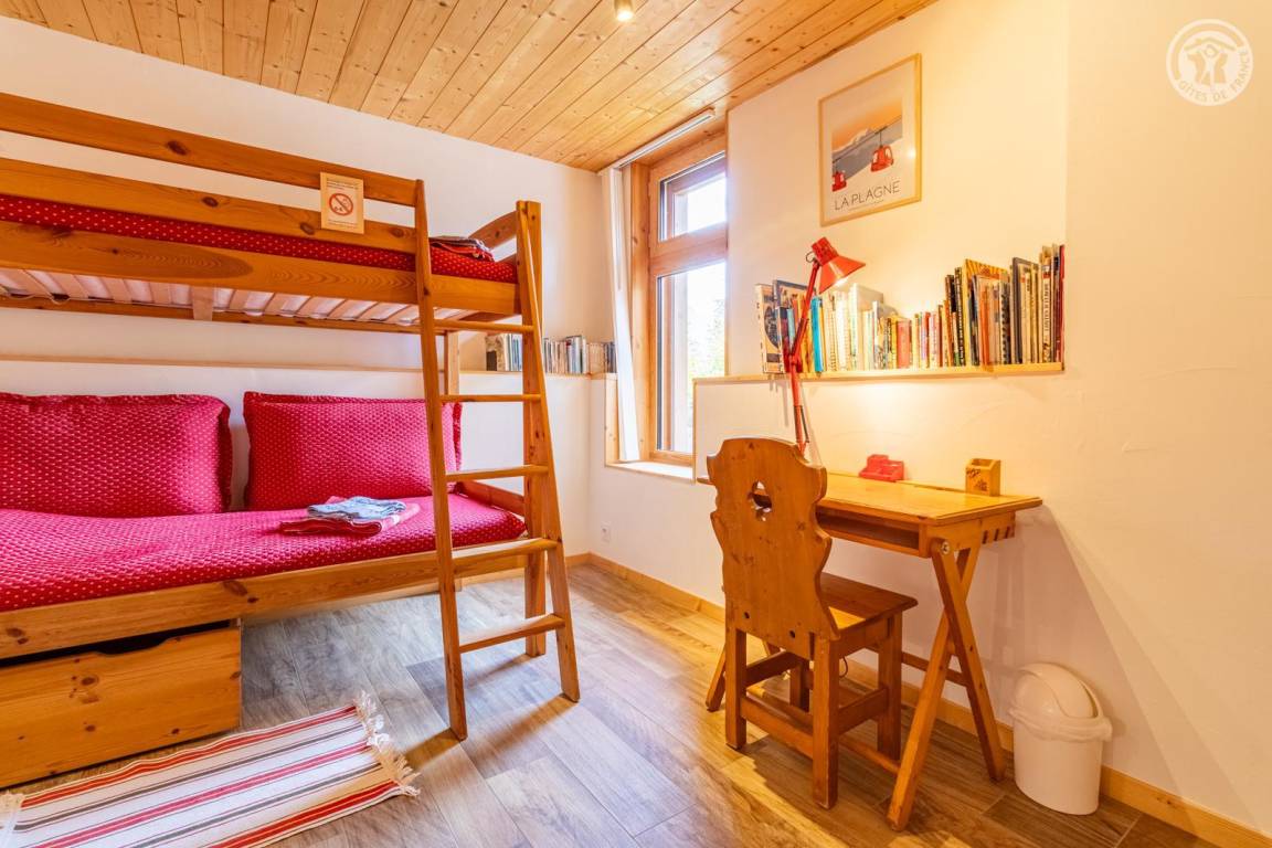 Im 1. Stock des Hauses der Eigentümer, darunter auch eine weitere Touristenunterkunft. Zugang über eine gemeinsame Eingangshalle mit den Eigentümern (2 Stufen), ebener Rasenweg vom Parkplatz (1 Stellplatz, unter Carport). Balkon mit Sonnenliegen und Tisch für 4 Personen, Gemeinschaftsgrundstück vor der Unterkunft (Gemeinschaftsweg mit sehr wenig Verkehr zwischen Haus und Grundstück). Eingang, Waschküche (Schuhtrockner), Wohnzimmer-Küche-Wohnbereich mit Zugang zum Balkon, 1 Schlafzimmer (1 Doppelbett 140x200 cm + 2 Etagenbetten 90x190 cm und Arbeitsbereich), Badezimmer (Dusche), separates WC. Ski- und Fahrradkeller. Skiverbindung nach La Plagne 4 km. Langlaufloipe 4 km. Gewässer 6 km. Schwimmbad 10 km.