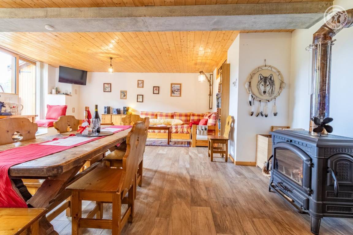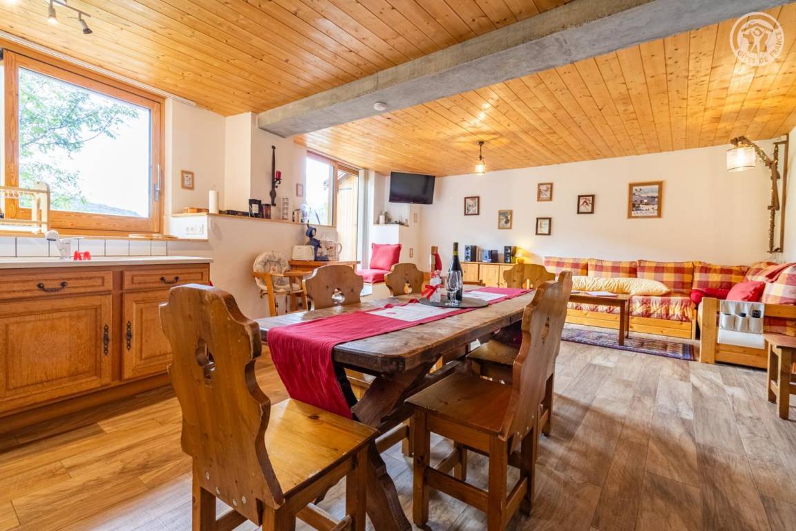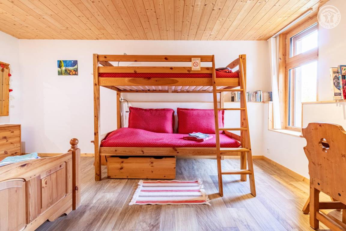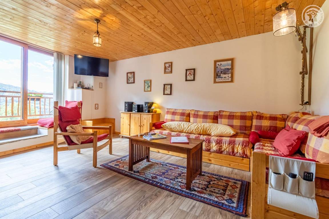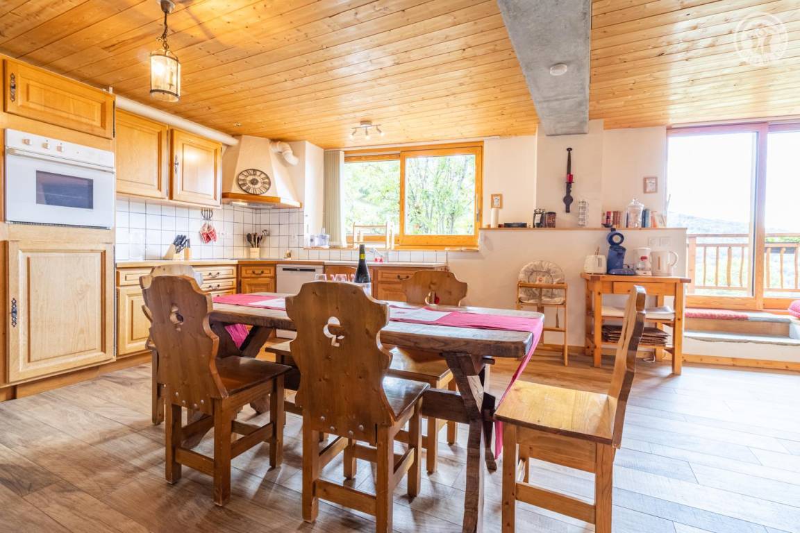 Im 1. Stock des Hauses der Eigentümer, darunter auch eine weitere Touristenunterkunft. Zugang über eine gemeinsame Eingangshalle mit den Eigentümern (2 Stufen), ebener Rasenweg vom Parkplatz (1 Stellplatz, unter Carport). Balkon mit Sonnenliegen und Tisch für 4 Personen, Gemeinschaftsgrundstück vor der Unterkunft (Gemeinschaftsweg mit sehr wenig Verkehr zwischen Haus und Grundstück). Eingang, Waschküche (Schuhtrockner), Wohnzimmer-Küche-Wohnbereich mit Zugang zum Balkon, 1 Schlafzimmer (1 Doppelbett 140x200 cm + 2 Etagenbetten 90x190 cm und Arbeitsbereich), Badezimmer (Dusche), separates WC. Ski- und Fahrradkeller. Skiverbindung nach La Plagne 4 km. Langlaufloipe 4 km. Gewässer 6 km. Schwimmbad 10 km.