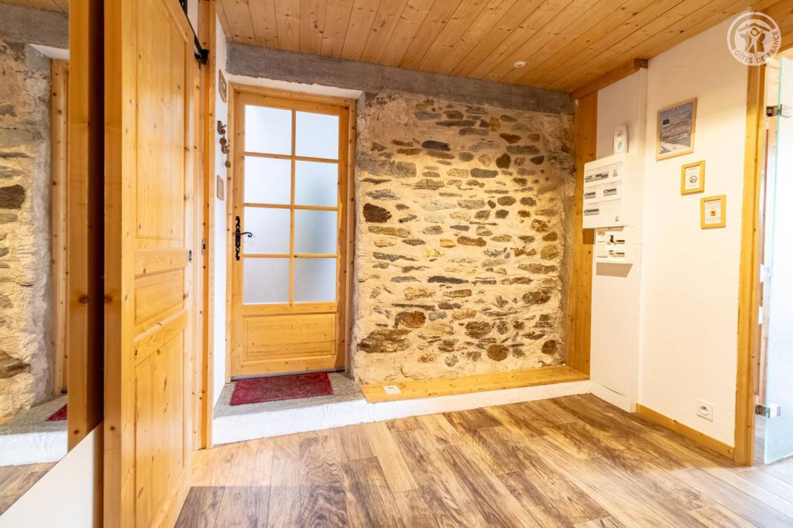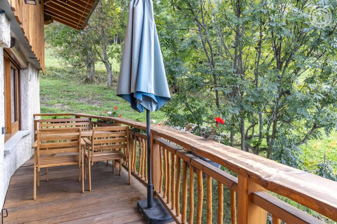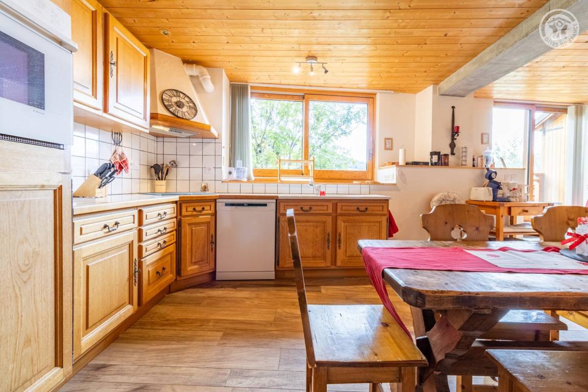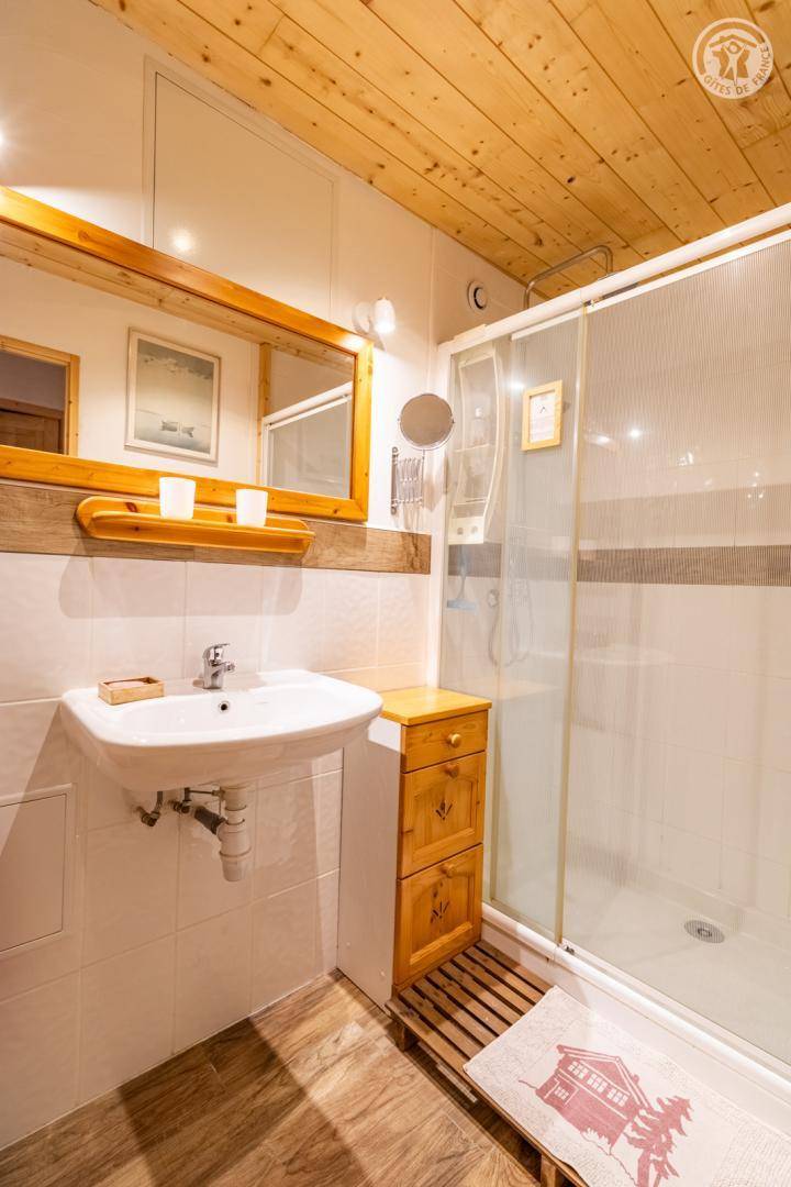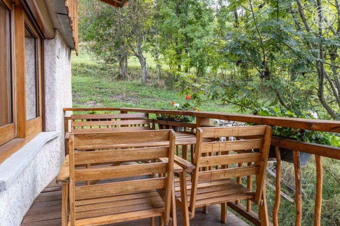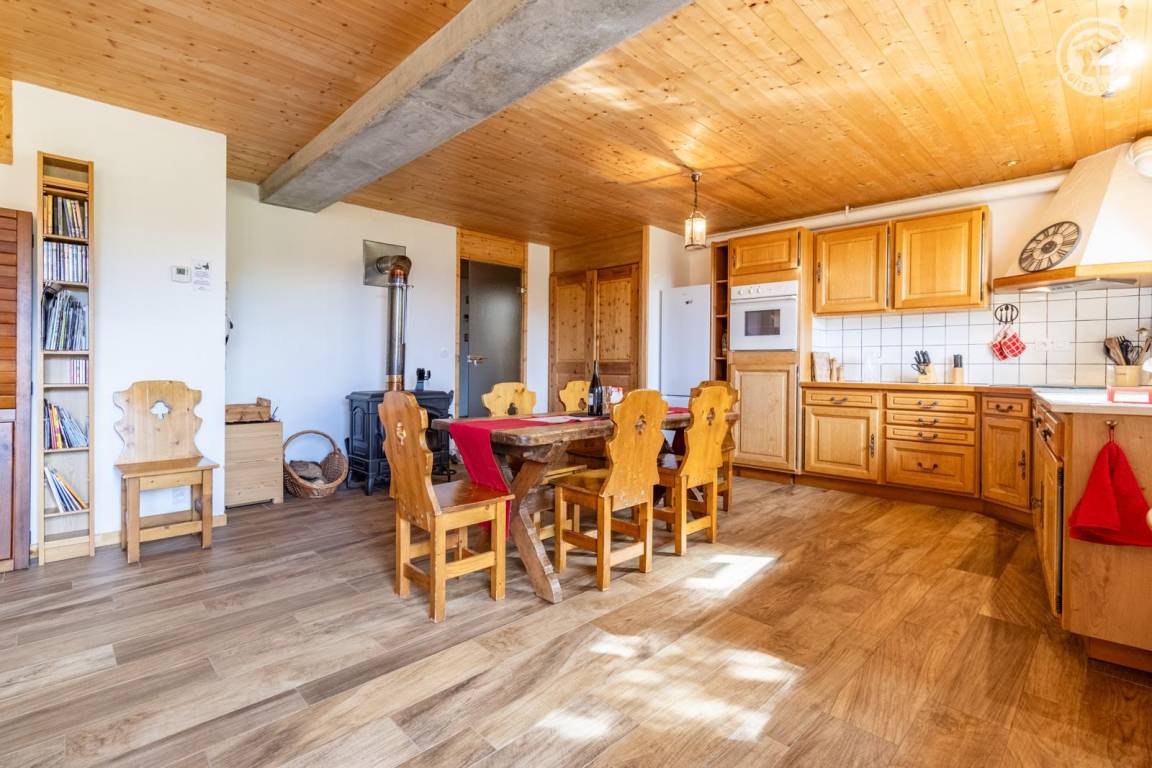 Im 1. Stock des Hauses der Eigentümer, darunter auch eine weitere Touristenunterkunft. Zugang über eine gemeinsame Eingangshalle mit den Eigentümern (2 Stufen), ebener Rasenweg vom Parkplatz (1 Stellplatz, unter Carport). Balkon mit Sonnenliegen und Tisch für 4 Personen, Gemeinschaftsgrundstück vor der Unterkunft (Gemeinschaftsweg mit sehr wenig Verkehr zwischen Haus und Grundstück). Eingang, Waschküche (Schuhtrockner), Wohnzimmer-Küche-Wohnbereich mit Zugang zum Balkon, 1 Schlafzimmer (1 Doppelbett 140x200 cm + 2 Etagenbetten 90x190 cm und Arbeitsbereich), Badezimmer (Dusche), separates WC. Ski- und Fahrradkeller. Skiverbindung nach La Plagne 4 km. Langlaufloipe 4 km. Gewässer 6 km. Schwimmbad 10 km.