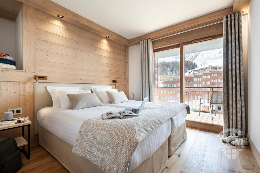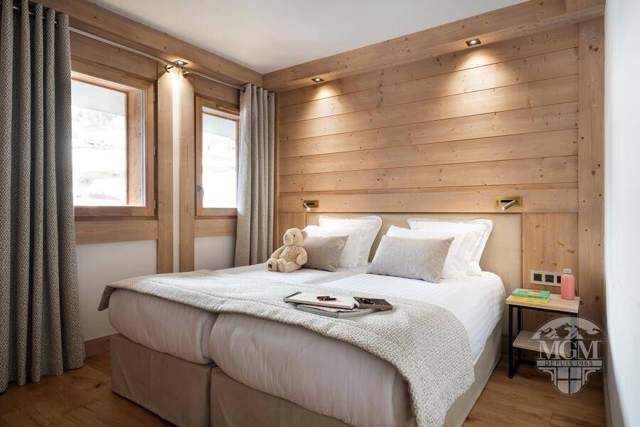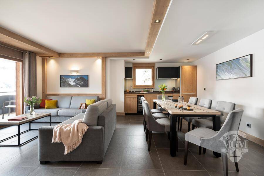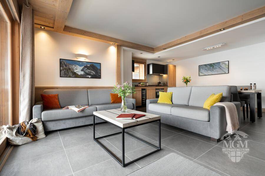 Fläche von ungefähr 85 m². Orientierung : Süd. Blick berg (Grande Rochette) ODER Blick station. Wohnzimmer mit Ausziehschlafcouch für 2 Personen. Schlafzimmer mit Safe, Dusche, Doppelbett, WC. 2 Schlafzimmer mit 2 Einzelbetten. Küche mit Wasserkocher, 2 Kaffeemaschinen (filtres et Nespresso), , kleiner Backofen mit Mikrowellenfunktion, Toaster, Geschirrspülmaschine, 2 Induktionsherdplatten, Kühlschrank. Badezimmer mit Badewanne, Handtuchtrockner. separates WC. Balkon mit Gartentisch und -stühle.