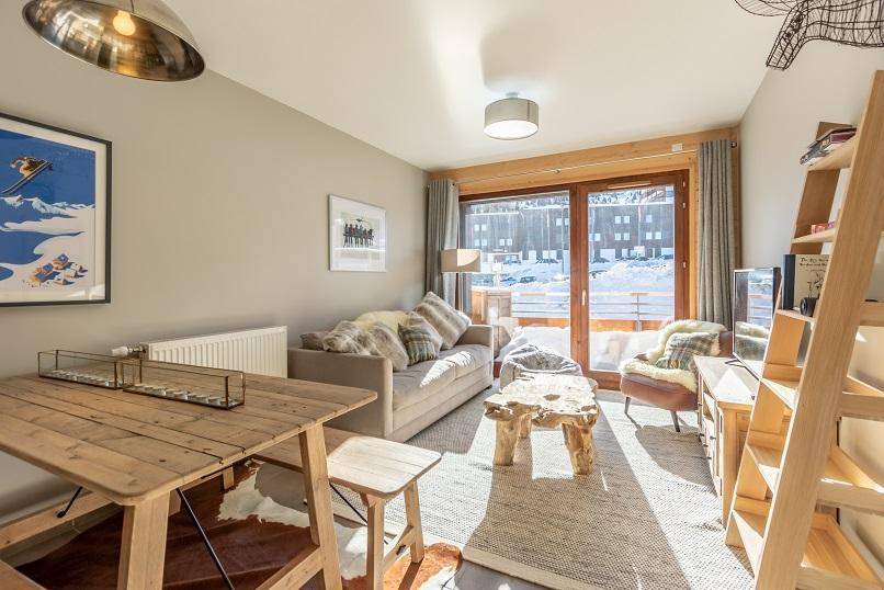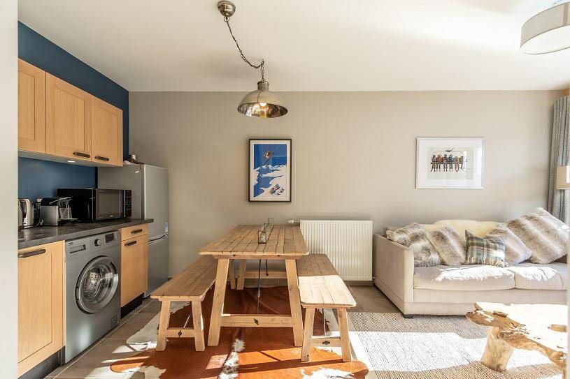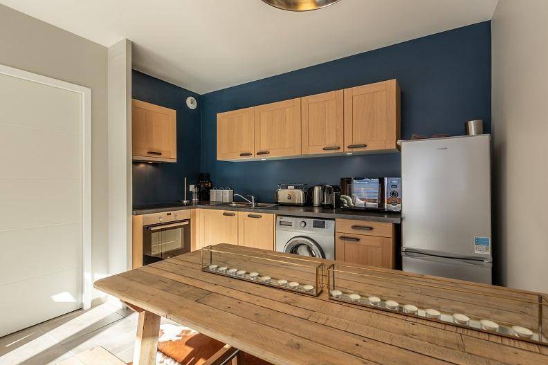Fläche von ungefähr 55 m². 5te Etage. Orientierung : Süd. Blick station. Diele. Wohnzimmer mit Heizkörper. Schlafzimmer mit Ausziehschlafcouch für 2 Personen, 2 Einzelbetten (90x190), Heizkörper. Schlafzimmer mit Doppelbett (160x200), Heizkörper. Küche mit Wasserkocher, Kaffeemaschine (Nespresso), Backofen, kleiner Backofen mit Mikrowellenfunktion, Toaster, Glaskeramikkochfelder, Kühl-Gefrier-Kombination. 2 Badezimmer. separates WC. Balkon mit Tisch.