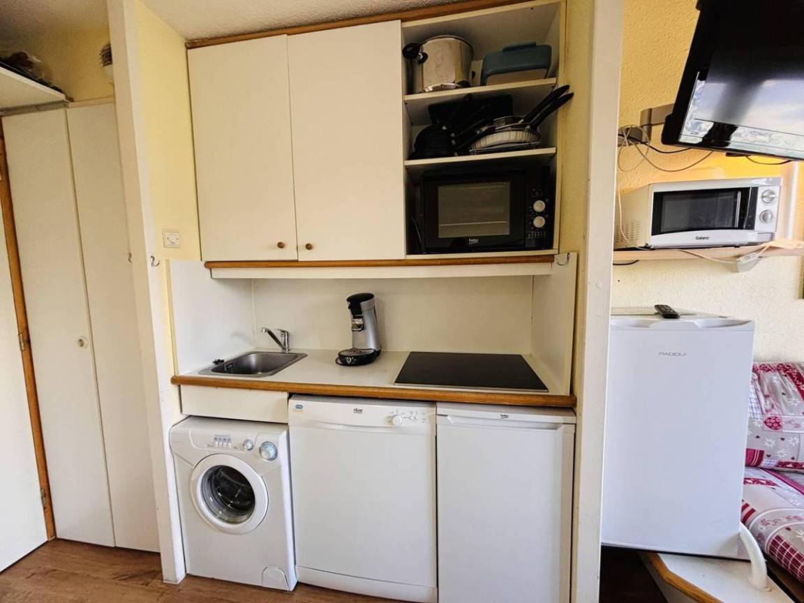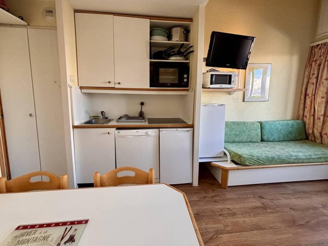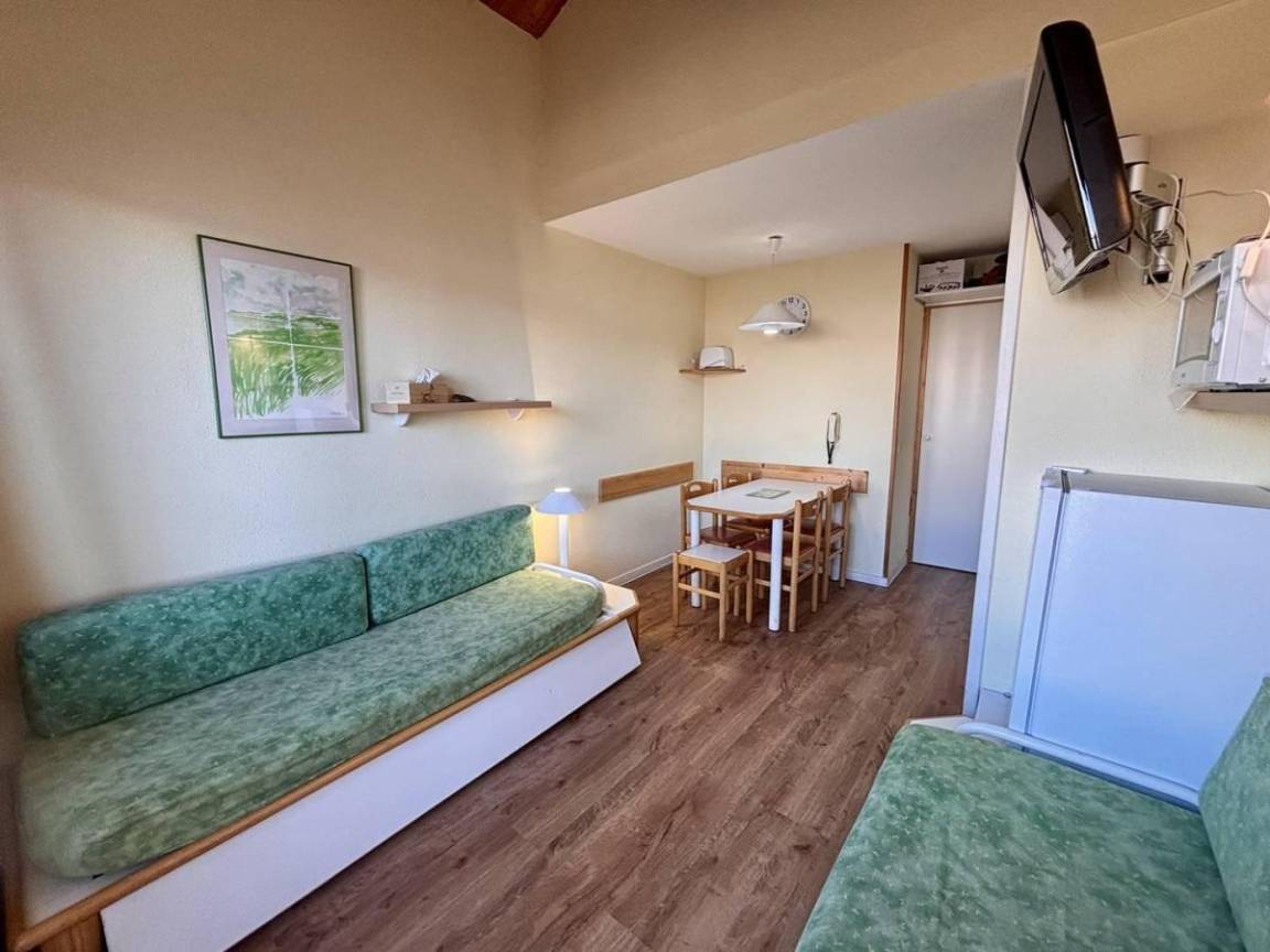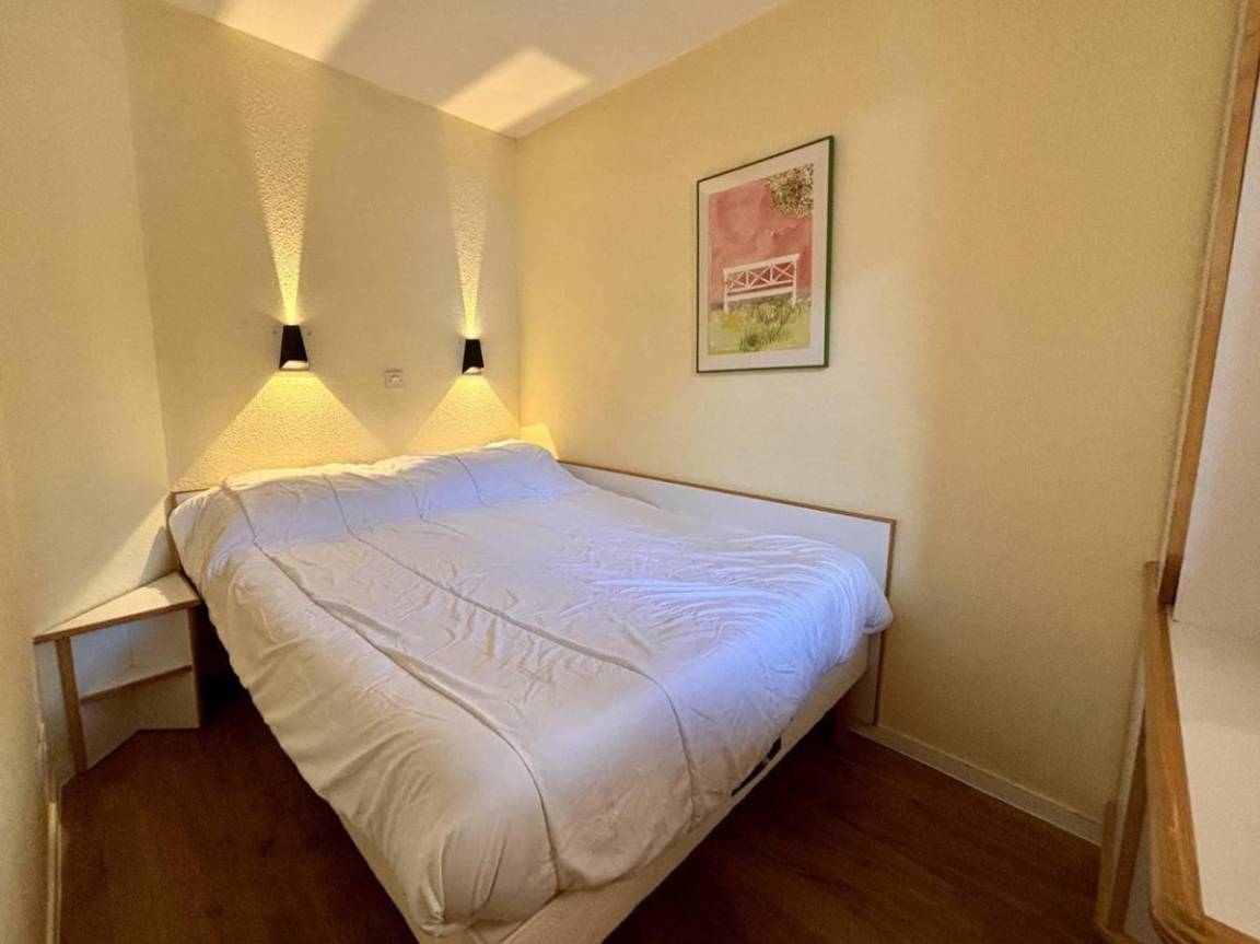 Fläche von ungefähr 28 m². 4te Etage. Orientierung : Nord. Diele mit Heizkörper. Wohnzimmer mit Ausziehschlafcouch für 2 Personen, 2 Einzelbetten (80x190), Heizkörper. Schlafzimmer mit Doppelbett (140x190), Heizkörper. Küche mit Raclettegerät, Wasserkocher, Kaffeemaschine (Senseo), Backofen, kleiner Backofen mit Mikrowellenfunktion, Toaster, Geschirrspülmaschine, Mixer, Induktionsherdplatten, 2 Kühlschränke. Badezimmer mit Haartrockner, Handtuchtrockner. WC. Balkon mit Tisch.