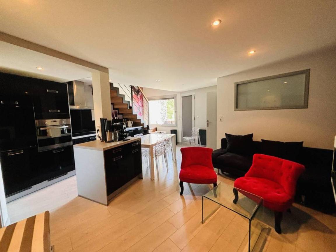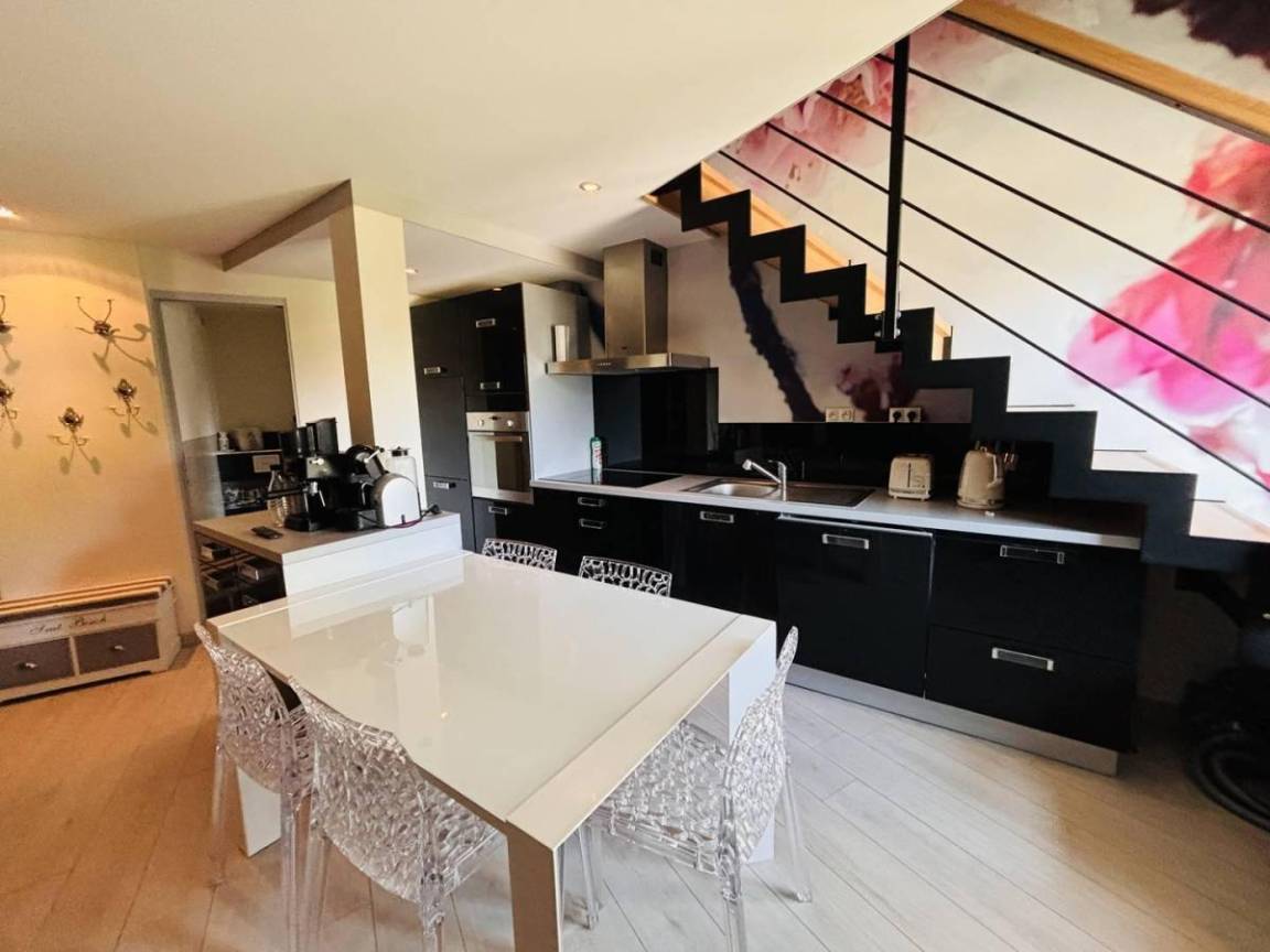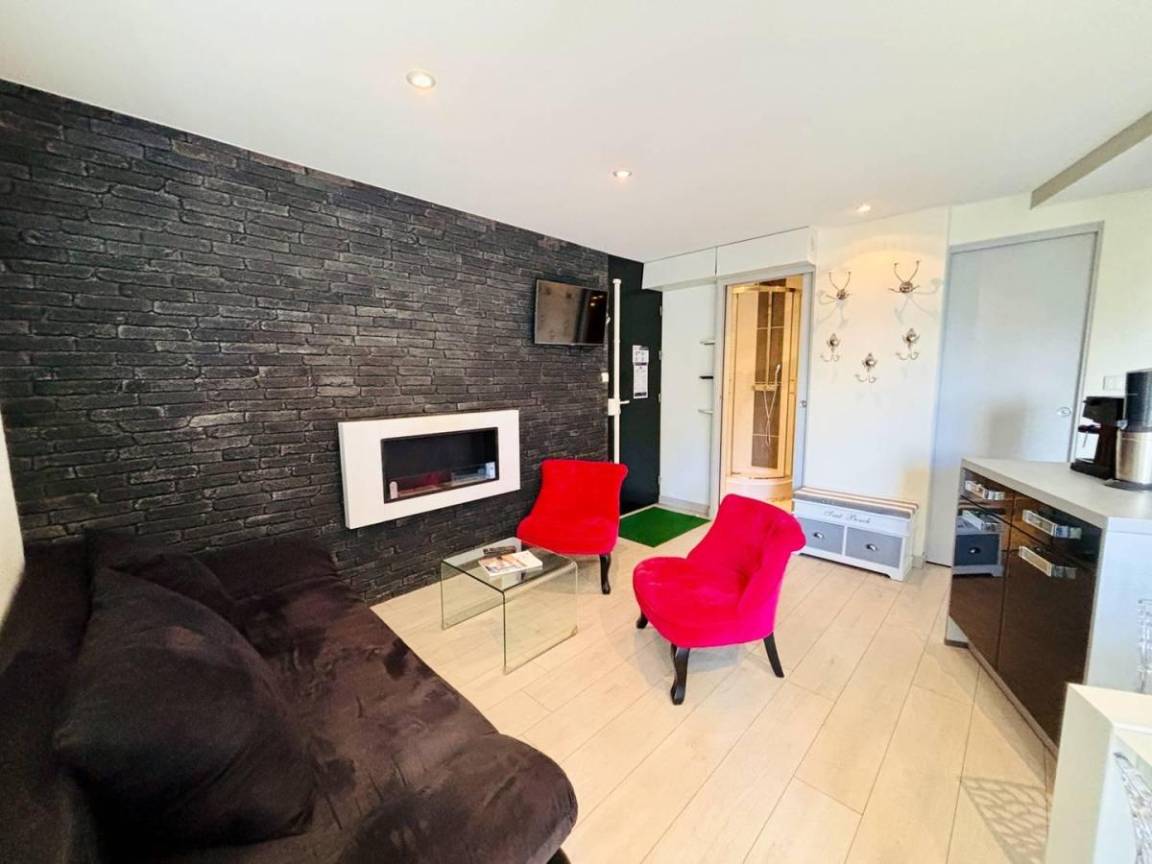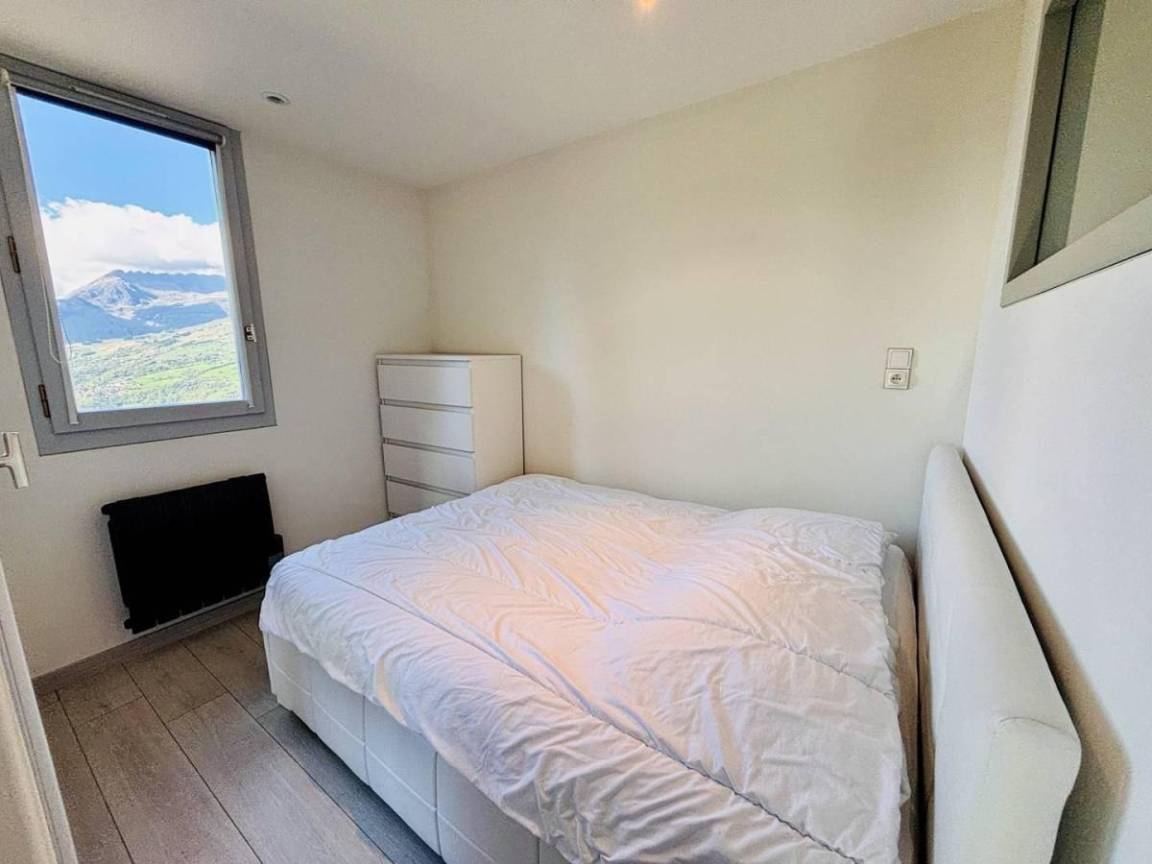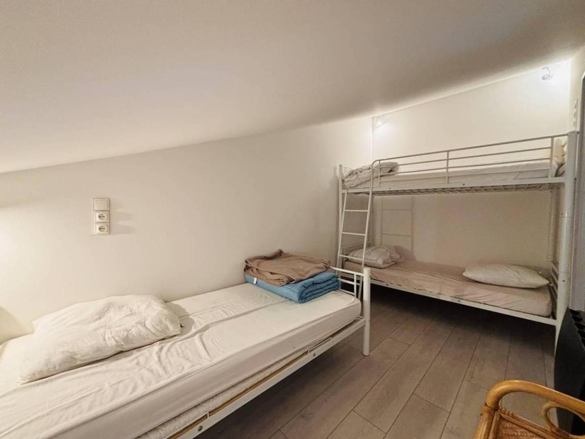 Fläche von ungefähr 42 m². 4te Etage. Orientierung : West. Niveau 0 : Wohnzimmer. Schlafzimmer mit Doppelbett (140x190). offene Küche mit Wasserkocher, Kaffeemaschine (électrique), Backofen, Toaster, Geschirrspülmaschine, Mikrowellenherd, 3 Induktionsherdplatten, Kühlschrank. Badezimmer mit . WC. Balkon. Niveau 1 : Schlafzimmer mit Einzelbett (90x190), 2 Stockbetten (90x190). Badezimmer mit Handtuchtrockner, WC. Niveau 2 : Zwischengeschoss mit BZ-Sofas (140). Die oberen Betten sind nicht für Kinder unter 6 Jahren geeignet.