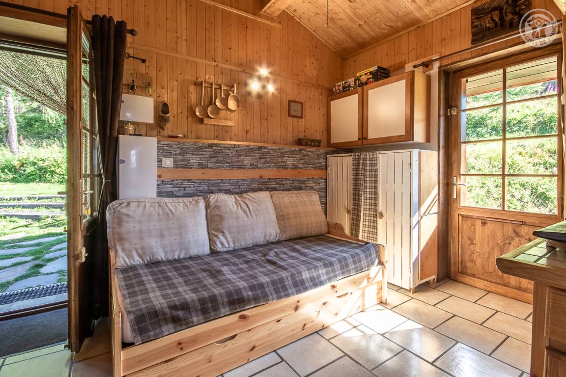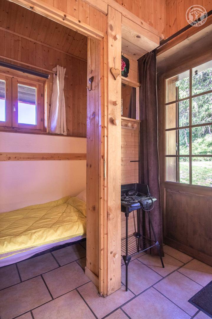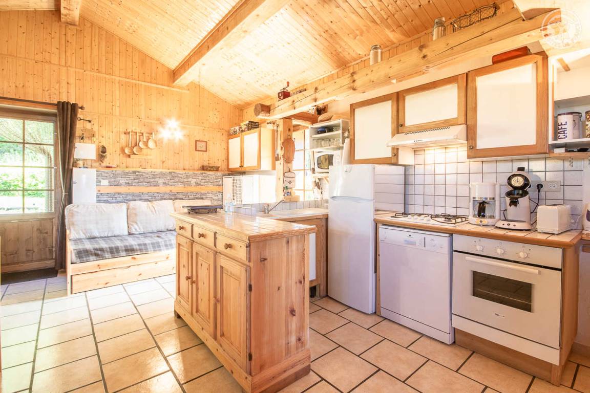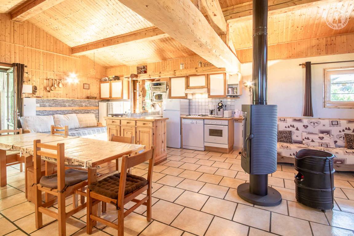 Komfortables Einzelchalet (Zugang auf gleicher Ebene über 3 Abstiegsstufen): Wohnzimmer-Küche-Lounge (1 Doppelschlafcouch / voll ausgestattete integrierte Küche), 1 Schlafzimmer (1 Doppelbett), 1 Schlafkabine (1 Einzelbett), Badezimmer (Dusche mit WC). Strom über EDF-Netz + Holzofen Terrasse. Landschaftlich gestaltetes flaches Grundstück (800m²). Direkter Zugang zum Chalet über befahrbare Forststraße über 3 km geöffnet vom 15.06. bis 19.09. Schwimmbad 23 km. Geschäfte 13 km.