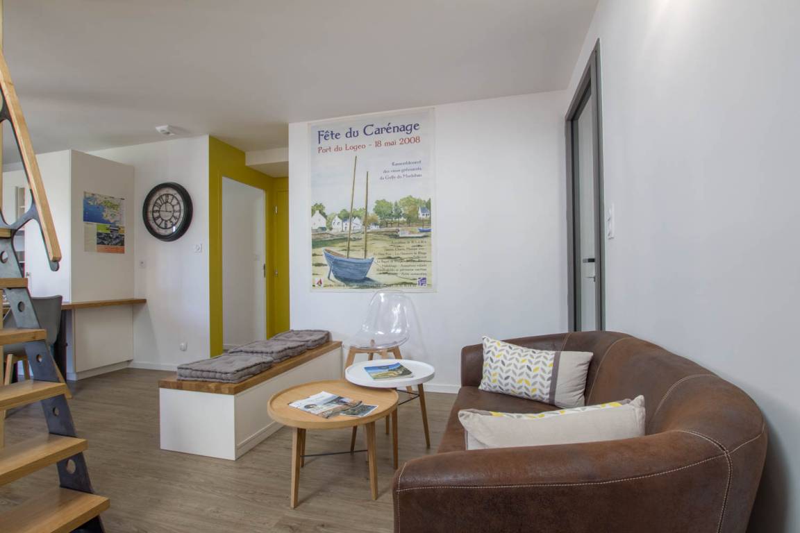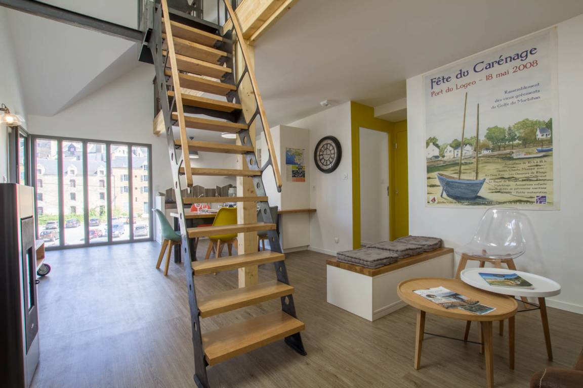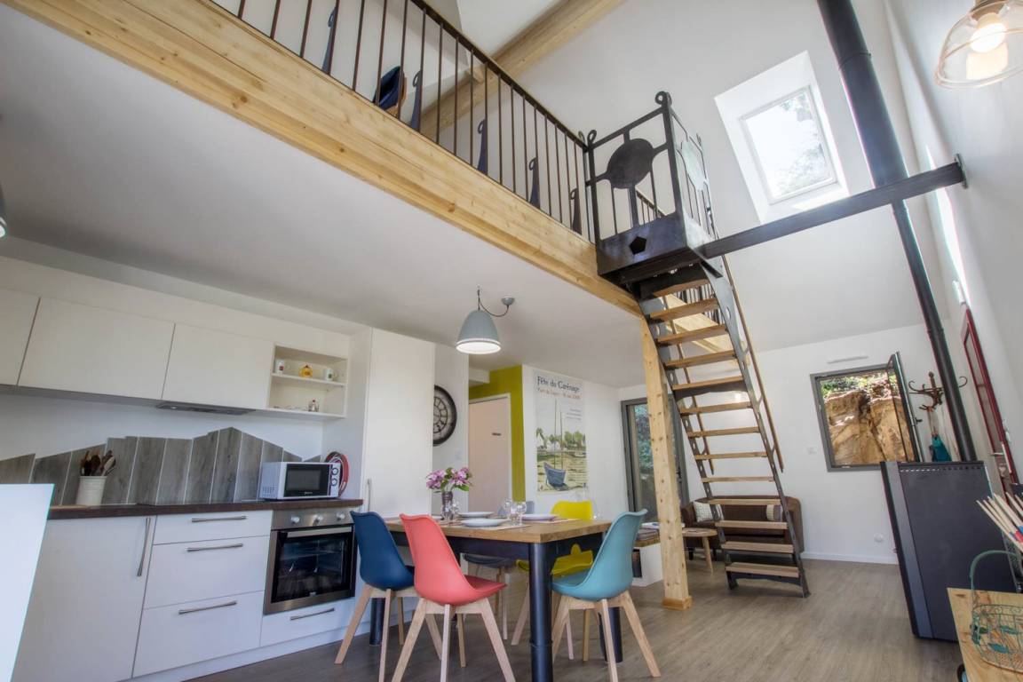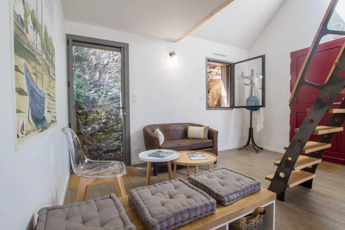 Die kleine Charakterstadt La Roche-Bernard (Label "Petite Cité de Caractère®") an der Vilaine besitzt einen zauberhaften Charme, er blieb ursprünglich und weist ein besonders schönes bauliches Kulturerbe auf. Bummeln Sie durch die hübschen Gassen und lassen Sie sich überraschen... viele Gebäude haben ungewöhnliche Details, Sie entdecken herrliche Ansichten und wunderbare kunsthandwerkliche Arbeiten. Der Golf von Morbihan, eine der schönsten Buchten der ganzen Welt, die Süd-Bretagne, die Atlantikküste, die Salzgärten von Guérande… alles ist leicht erreichbar. Ein kleiner Ort in guter Lage, ideal für einen perfekten Urlaub mit Erholung und Besichtigungen. Die Ferienwohnung Cabane de la Voûte liegt gleich bei dem ursprünglich gebliebenen kleinen Hafen von La Roche Bernard. Willkommen in dieser schönen Wohnung, eingebettet in einen Felsen, mit modernem und gepflegtem Dekor, von der Vermieterin selbst realisiert und inspiriert von der poetischen Welt des Vermieters... Hübscher Wohnbereich m