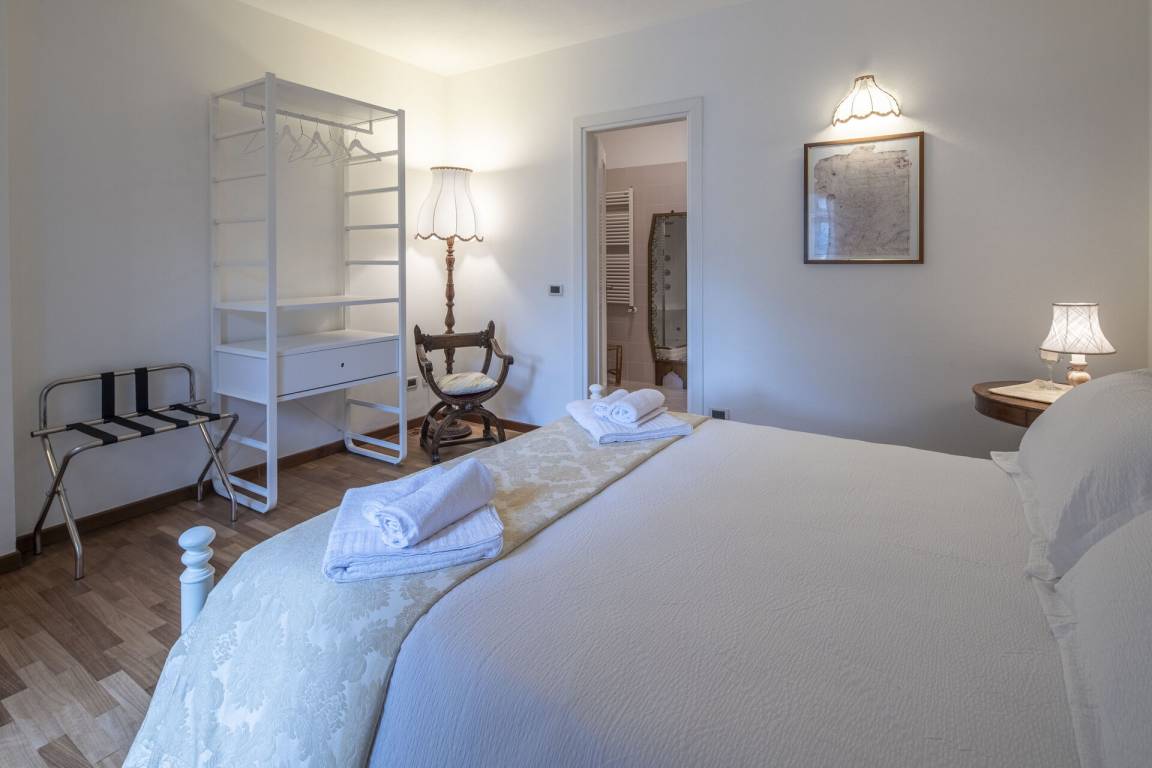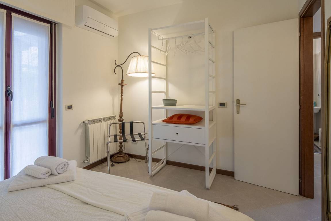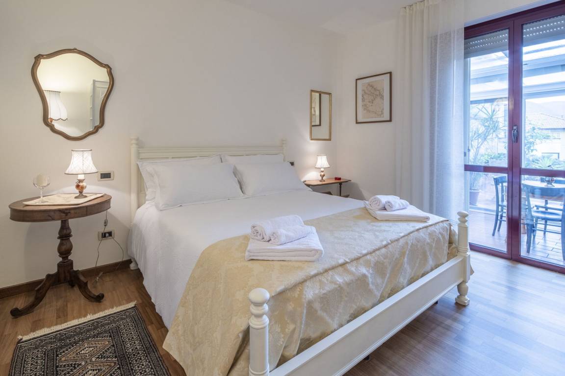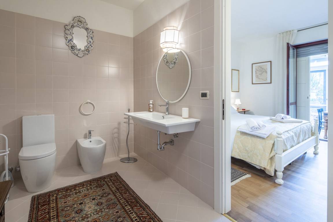 Schlafzimmer mit Bad: Doppelbett, WiFi Internet, Klimaanlage, Waschbecken, WC, Bidet, Dusche, Fön, Ausgang auf die Veranda.