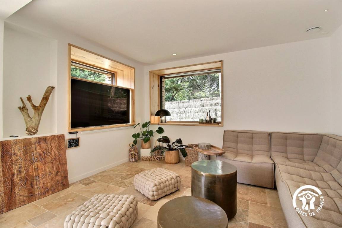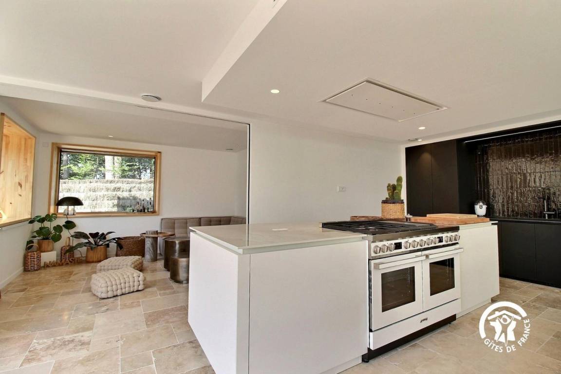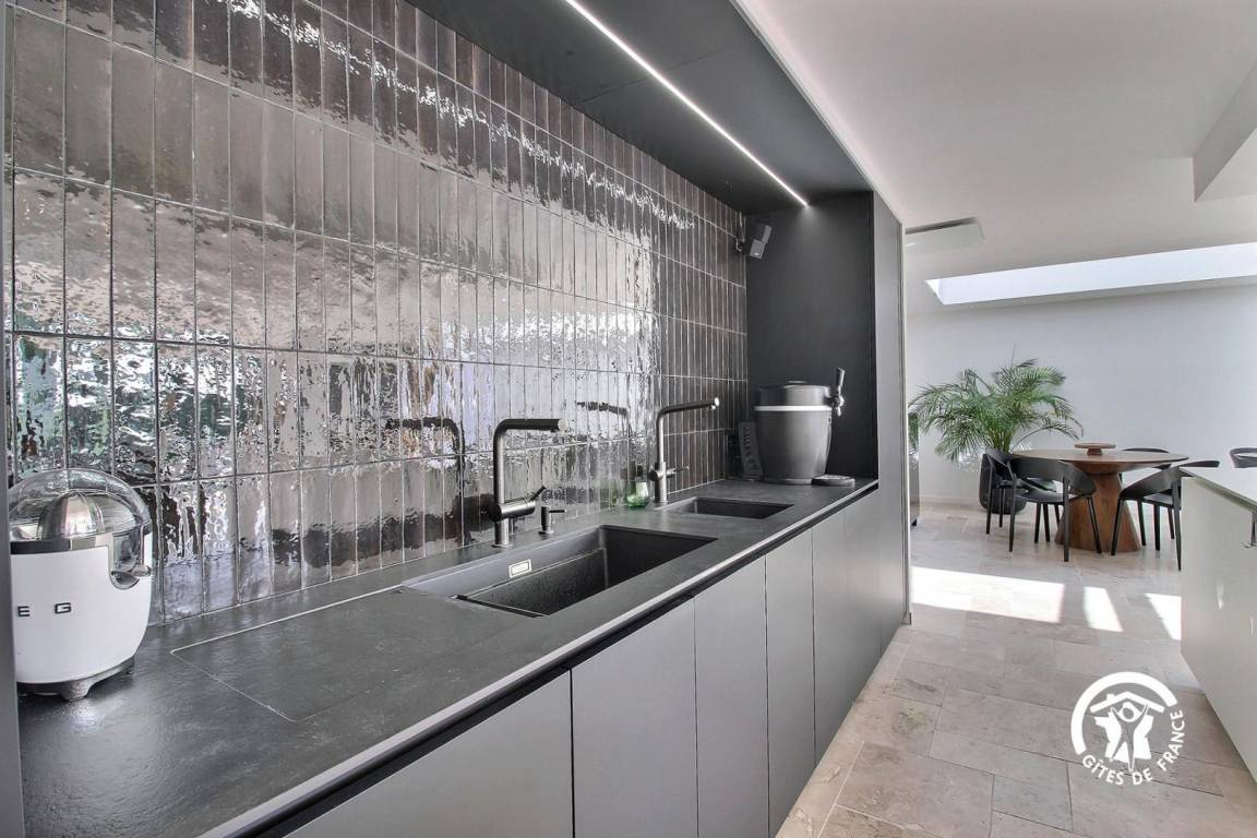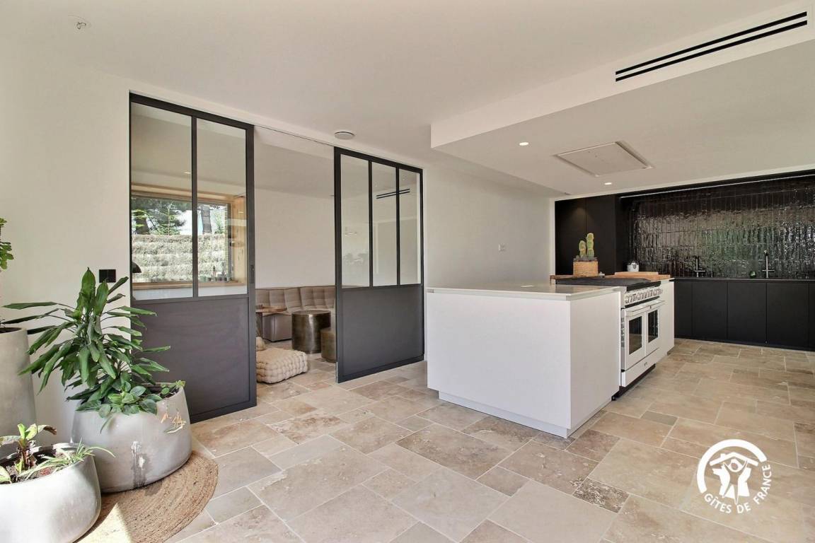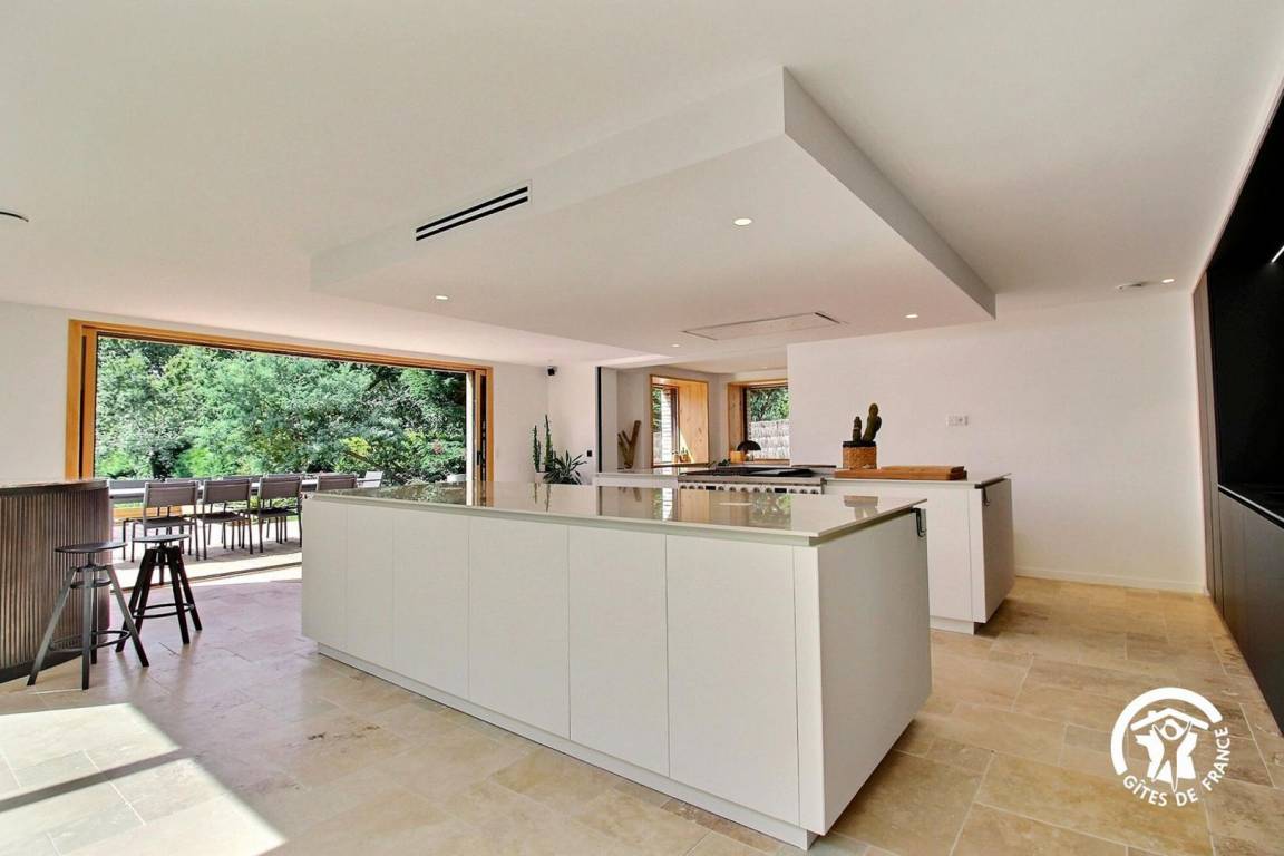 Das große 80 m² große Wohnzimmer ist mit Sonnenschirmen und einer voll ausgestatteten Küche mit einem SMEG-Kochfeld, zwei Geschirrspülern, einem Roboter, 2 Spülbecken, darunter eines mit gefiltertem stillem und kohlensäurehaltigem Wasser, und zahlreichen Geräten ausgestattet.