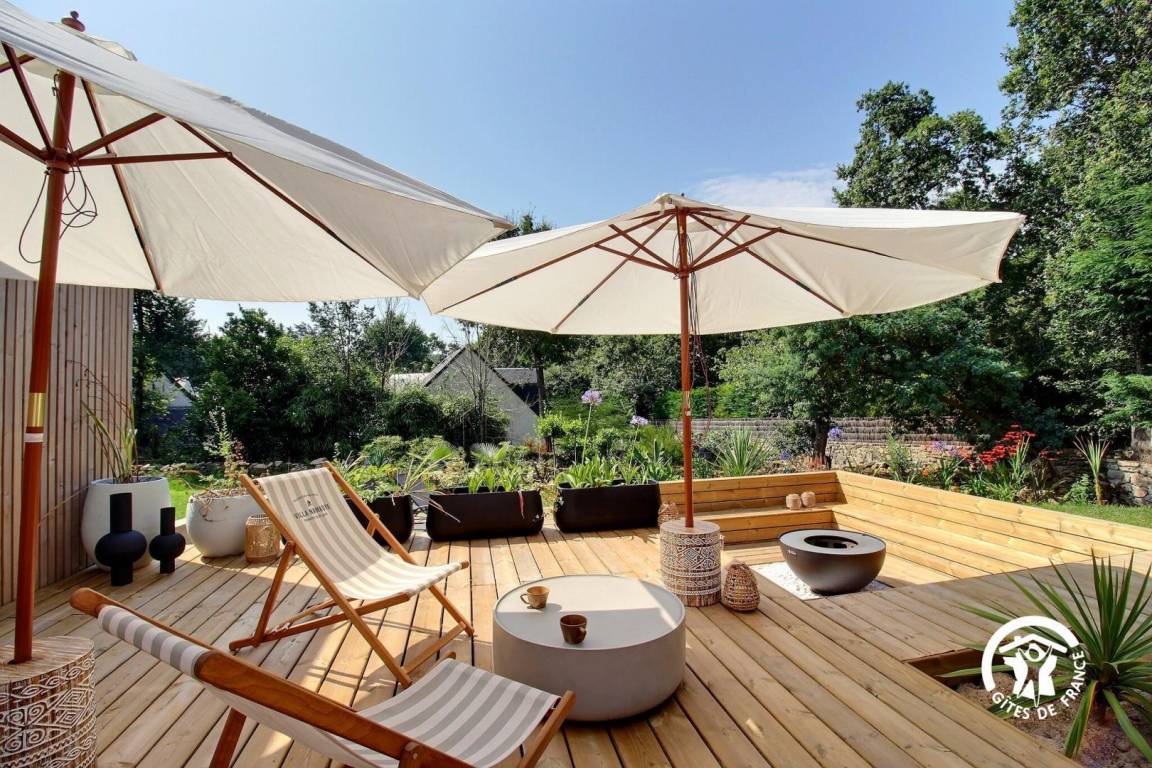 Genießen Sie eine herrliche Terrasse mit einem großen Esstisch, einem 7-Sitzer-Spa, einer Feuerstelle und einem Solarium.