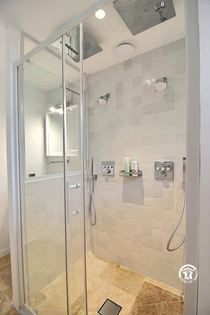 - Zwei Schlafzimmer mit jeweils einem 160x200-Bett + eigenem Bad mit Dusche + gemeinsamer Terrasse
