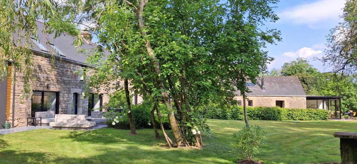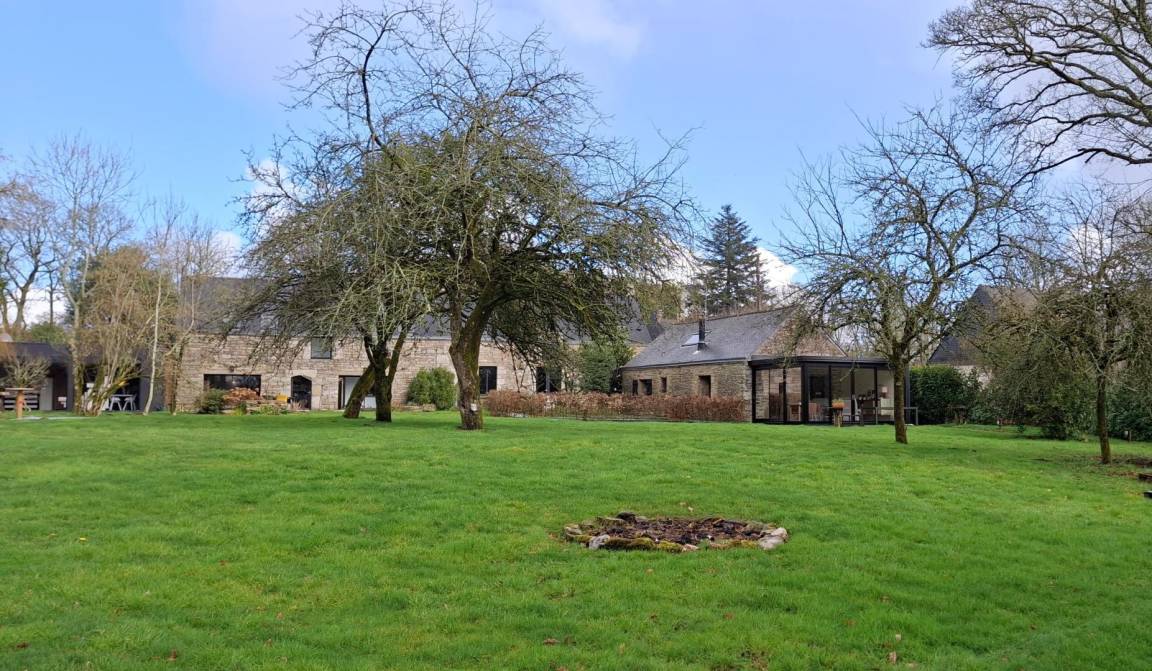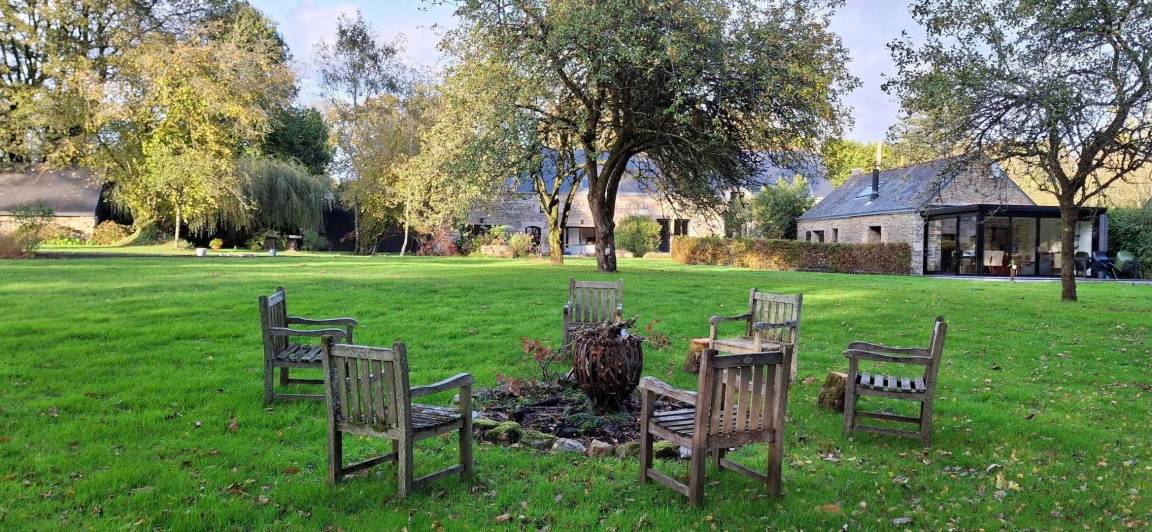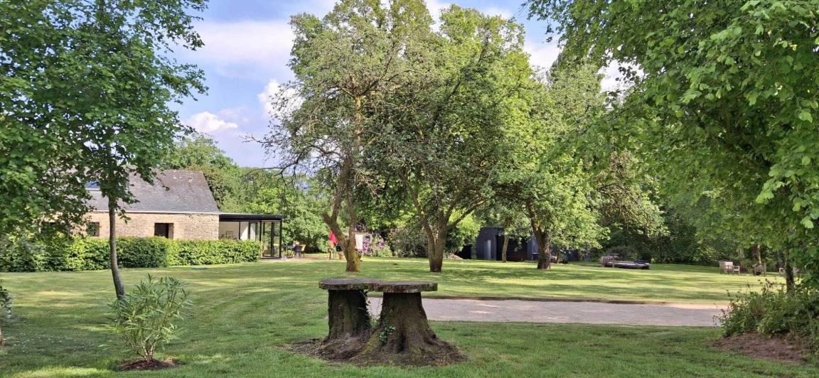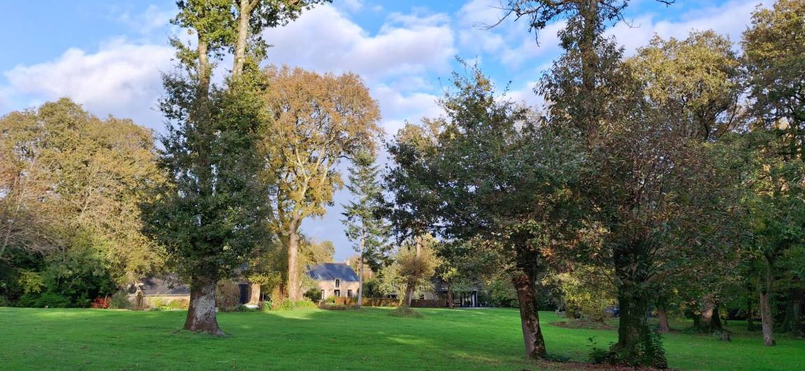Eingebettet in einen ruhigen Weiler, auf einem Hektar großen, von alten Eichen und Apfelbäumen beschatteten Grundstück, bietet das Ferienhaus den idealen Rahmen für einen erholsamen Aufenthalt in der Nähe des Golfs von Morbihan. Die friedliche Natur lädt zum Entspannen ein.