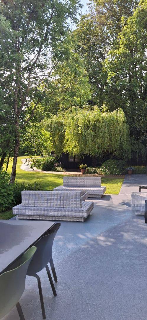 Private Terrasse mit Esstisch, Sonnenschirm, Grill und Gartenmöbeln.