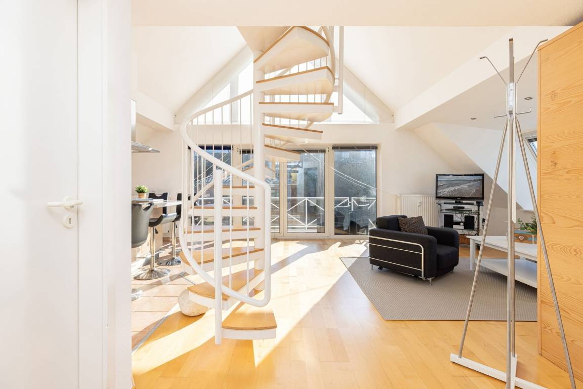 Wohnzimmer/DG: Doppelbett, Verdunkelung (Rollo), dieser Schlafbereich ist über eine Wendeltreppe erreichbar und zum Wohnbereich hin offen