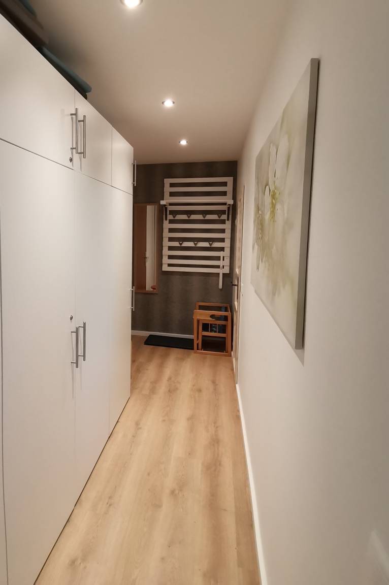 Durch den Flur erreichen Sie das Badezimmer und das modern eingerichtete Wohnzimmer, von dem die kleine Küche sowie die beiden Schlafzimmer abgehen. Die Wohnung bietet ausreichend Platz für vier Personen. Als Schlafgelegenheiten stehen in den beiden Schlafzimmern je zwei Einzelbetten zur Verfügung. Es stehen zwei Parkraumflächen neben dem Haus zur Verfügung. Die Plätze sind nicht fest zugeteilt (je nach Verfügbarkeit). Für Fahrräder stehen zwei abschließbare Räume zur gemeinschaftlichen Nutzung zur Verfügung.