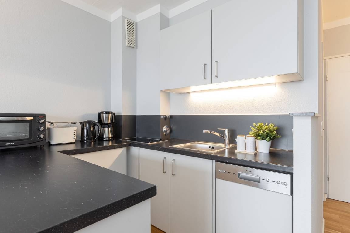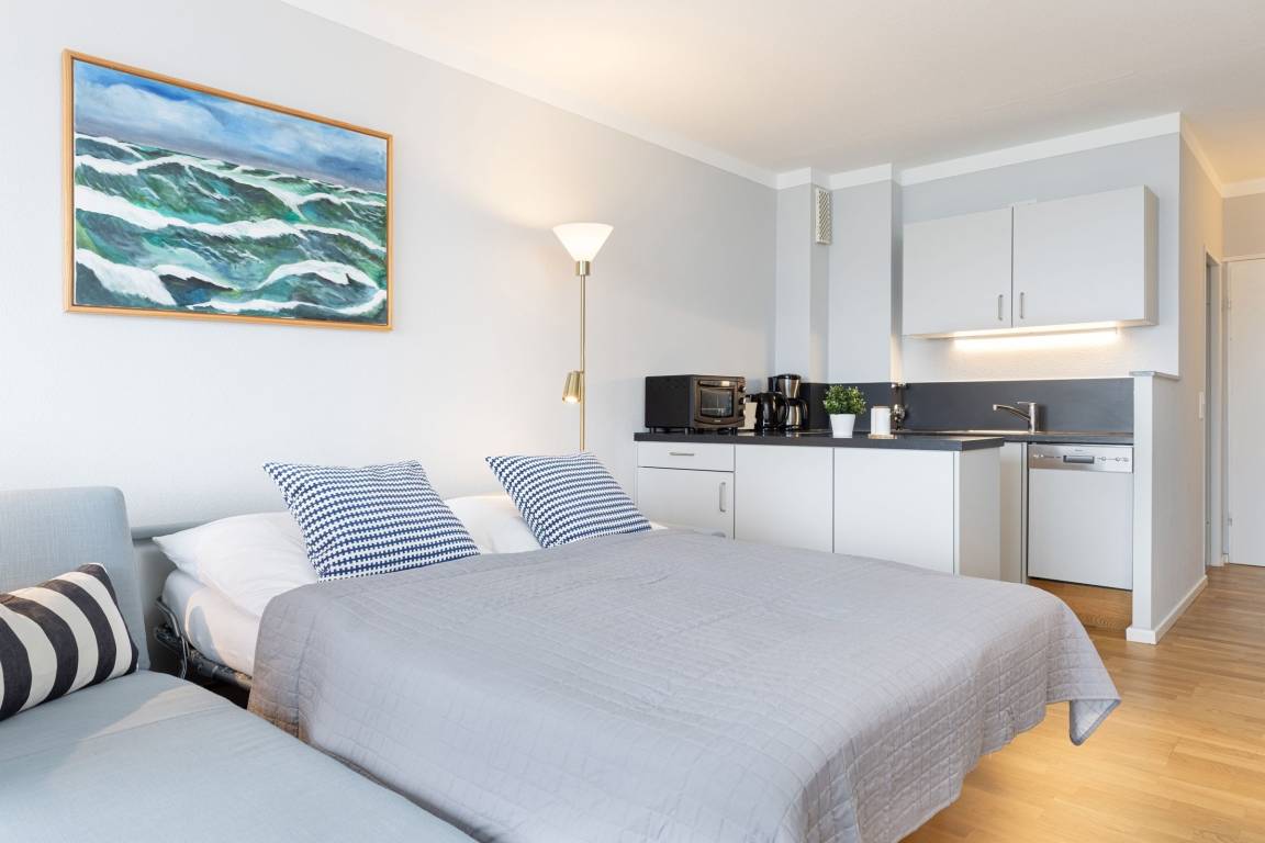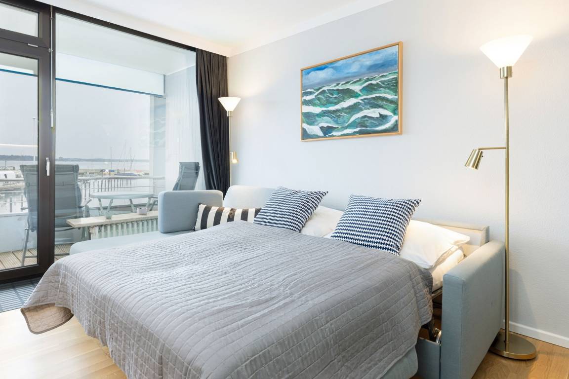 Die Wohnung Miesmuschel befindet sich unmittelbar am Yachthafen, nur wenige Schritte vom Wasser entfernt, und ist bequem mit dem Fahrstuhl (1x1 m) zu erreichen. Die geschmackvolle Einrichtung wird Sie sofort begeistern. Machen Sie es sich auf der bequemen Couch gemütlich - oder auf dem möblierten Balkon. So oder so haben Sie einen traumhaften Blick auf den Hafen und können wunderbar den Schiffsverkehr auf der Kieler Förde beobachten. Die offene, moderne Küche ist sehr gut ausgestattet und lädt zum gemeinsamen Kochen ein. Für die Nacht können Sie die Couch ganz einfach in ein Doppelbett verwandeln. Das innenliegende, hell geflieste Duschbad bringt Sie entspannt in den neuen Tag. Zum Yachthafen sind es übrigens keine 50 m. Für Ihre Ausflüge ist das kleine Appartement ein idealer Ausgangspunkt.