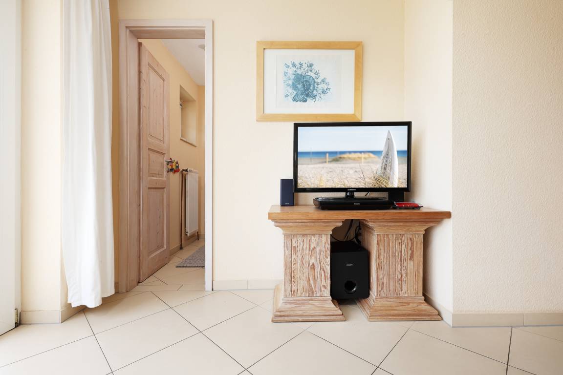 In diesem geschmackvoll eingerichteten Appartement werden Sie sich garantiert wohlfühlen. Der gemütliche Wohnbereich, mit Zugang zum Balkon, ist kombiniert mit einer offenen gut ausgestatteten Küchenzeile und einem großzügigen Esstisch. Das Schlafsofa (Breite 140cm) lässt sich schnell für 2 Personen aufbetten. Vom Wohnbereich aus gelangen Sie in das kuschelige Kinderzimmer mit Etagenbett. An der Küchenzeile vorbei ist ein kleiner Flur mit Garderobe, von da ab geht das helle große Schlafzimmer mit Doppelbett ab und das schöne großzügiges Duschbad.