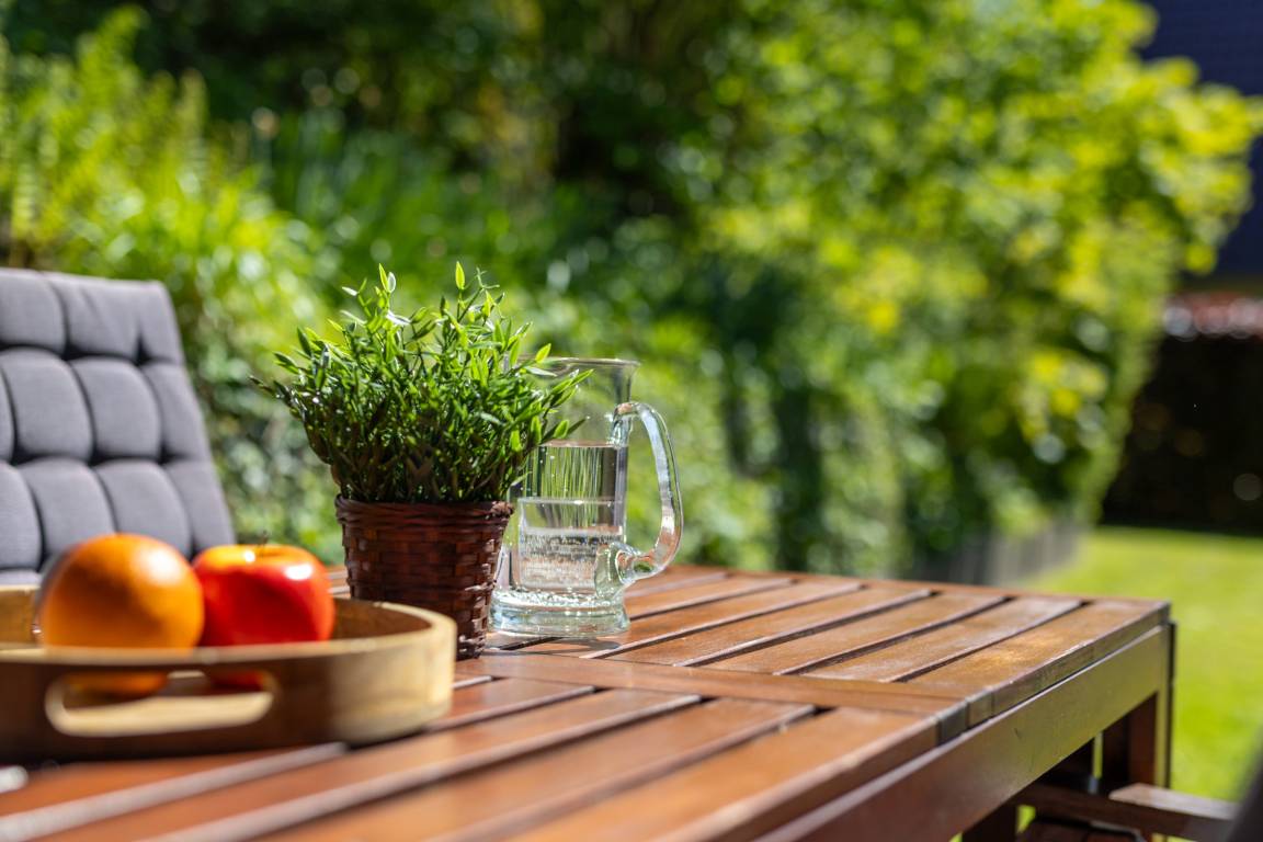 Die ca. 45 m² Wohnfläche bieten mit einem Schlafzimmer mit Doppelbett und einem weiteren Zimmer mit Etagenbett modernen Komfort. Der gemütliche Kaminofen lässt Sie an kühlen Tagen den Alltag vergessen. Der Smart-TV mit DVBT-2 HD (öffentlich-rechtliche + private Programme in HD), mit dem auch Online-Videotheken möglich sind, sorgt für Unterhaltung. Die Terrasse und der Garten sind nach Süden ausgerichtet. Der nur für Anlieger zugelassene Promenadenweg gehört zu den gefragtesten Lagen Laboes.