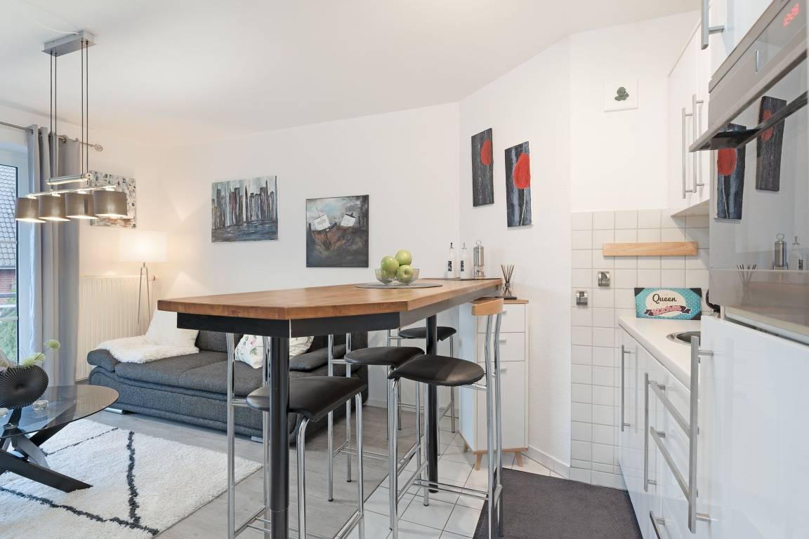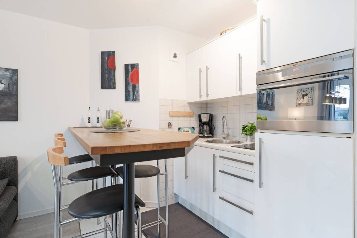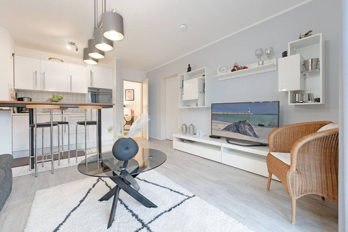 Erleben Sie die Ostseeküste hautnah und genießen Sie Ihre Auszeit in dieser charmanten Ferienwohnung in Laboe, die mit ihrer Nähe zur Ostseeküste punktet und gleichzeitig modernen Komfort bietet. Der lichtdurchflutete Wohnbereich lädt mit gemütlichen Sitzmöglichkeiten und einem TV zu entspannten Abenden ein. Vom Wohnbereich gelangen Sie direkt auf den überdachten Balkon, der mit Gartenmöbeln und einem Strandkorb ausgestattet ist und Ihnen die Möglichkeit bietet, die frische Ostseeluft zu genießen. Die gut ausgestattete Küche verfügt über einen 2-Platten-Herd, Mikrowelle, Kaffeemaschine, Wasserkocher und Mixer, sodass Sie hier Ihre Lieblingsgerichte problemlos zubereiten können. Der Essbereich, der sich harmonisch in den Wohnraum integriert, bietet Platz für gemeinsame Mahlzeiten. Das Schlafzimmer ist mit einem komfortablen Doppelbett (180x200 cm) ausgestattet, das Ihnen eine erholsame Nachtruhe garantiert. Verdunklungsmöglichkeiten sorgen dafür, dass Sie auch im Sommer tief und entspannt schlafen können. Im Wohnzimmer befindet sich ein Schlafsofa (ca. 150x200 cm), auf dem ein Erwachsener und ein Kind nächtigen können. Das Badezimmer ist samt Dusche und Haartrockner mit allem ausgestattet, um sie frisch in den Urlaubstag starten zu lassen.