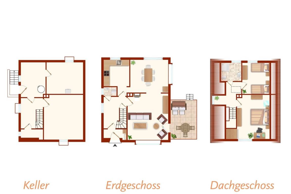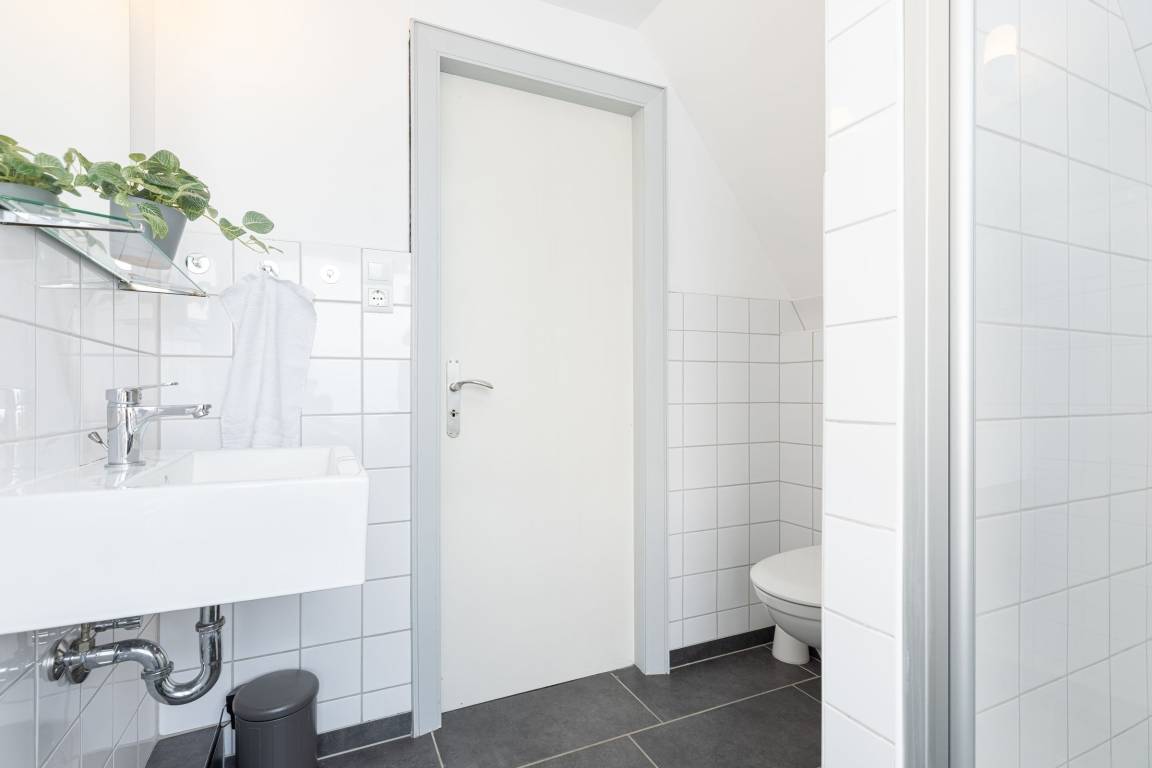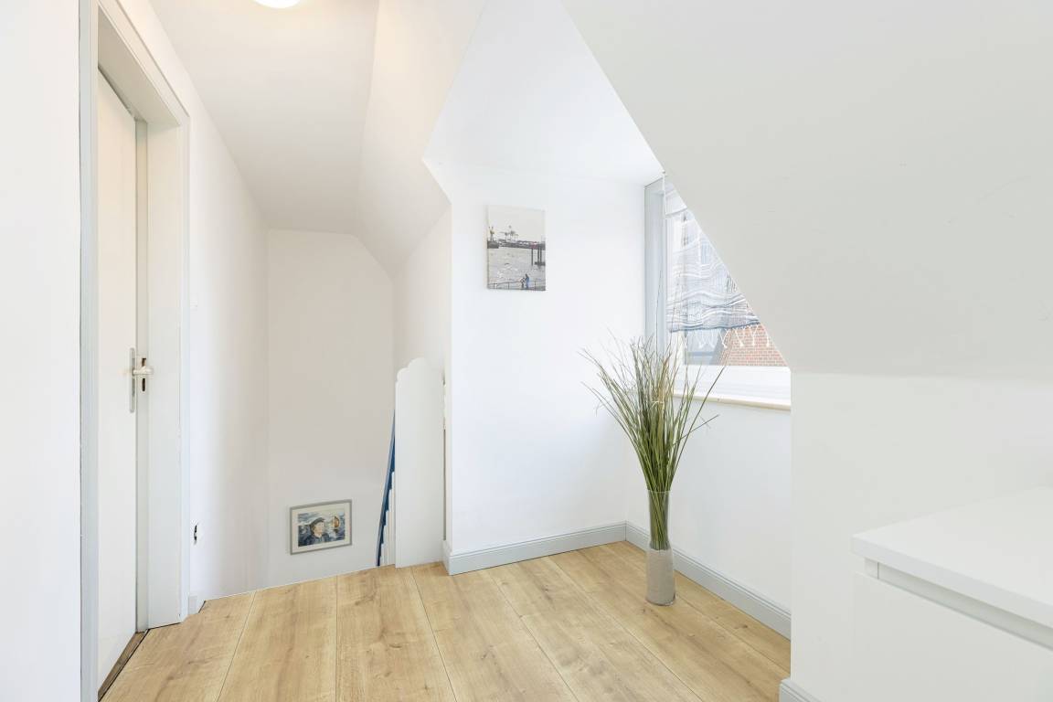 Im Erdgeschoss befinden sich 3 Zimmer, die miteinander verbunden sind. Die Küche ist mit einem Gas-Herd versehen und mit dem Essbereich verbunden. Es gibt im Anschluss ein Wohnzimmer mit Schlafcouch/ Sessel, einem TV mit DVBT-2 HD (Öffentlich-rechtliche + Private Programme in HD), großer Bücher- und DVD-Auswahl, Kaminofen und Zugang zur Terrasse, die eine herrliche Aussicht bietet. Zusätzlich ist ein Gäste-WC vorhanden. Das Bad im Dachgeschoss ist mit Dusche in der Schräge ausgestattet. Das Hauptschlafzimmer ist mit einem Doppelbett (180x200 cm), Kleiderschrank und Schreibtisch mit Fördeblick eingerichtet, das zweite Schlafzimmer verfügt über 2 Einzelbetten (je 90x200 cm).