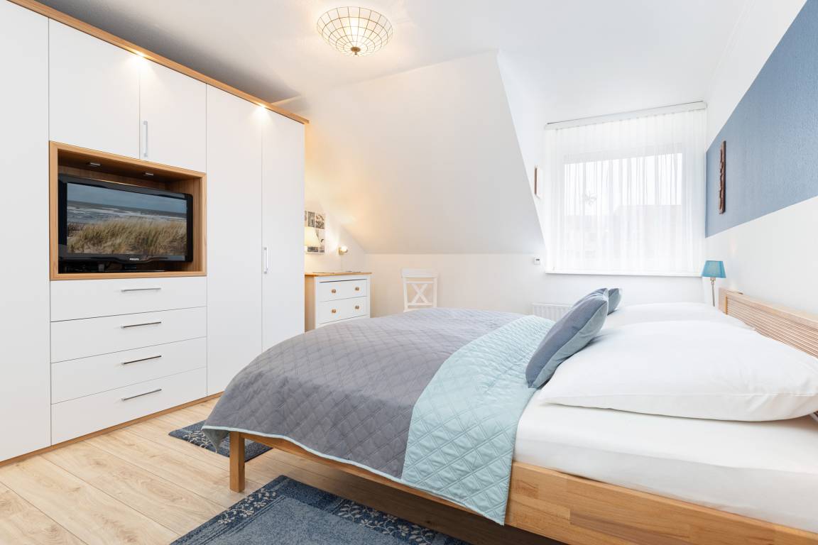 Schlafzimmer 1: Doppelbett (2x 90x200 cm), Kleiderschrank, TV, Verdunkelung: elektrische Außenrollläden