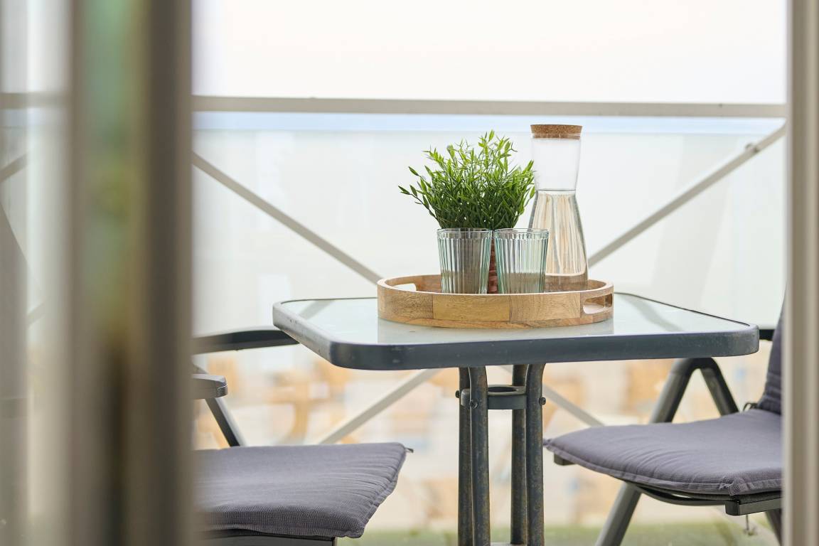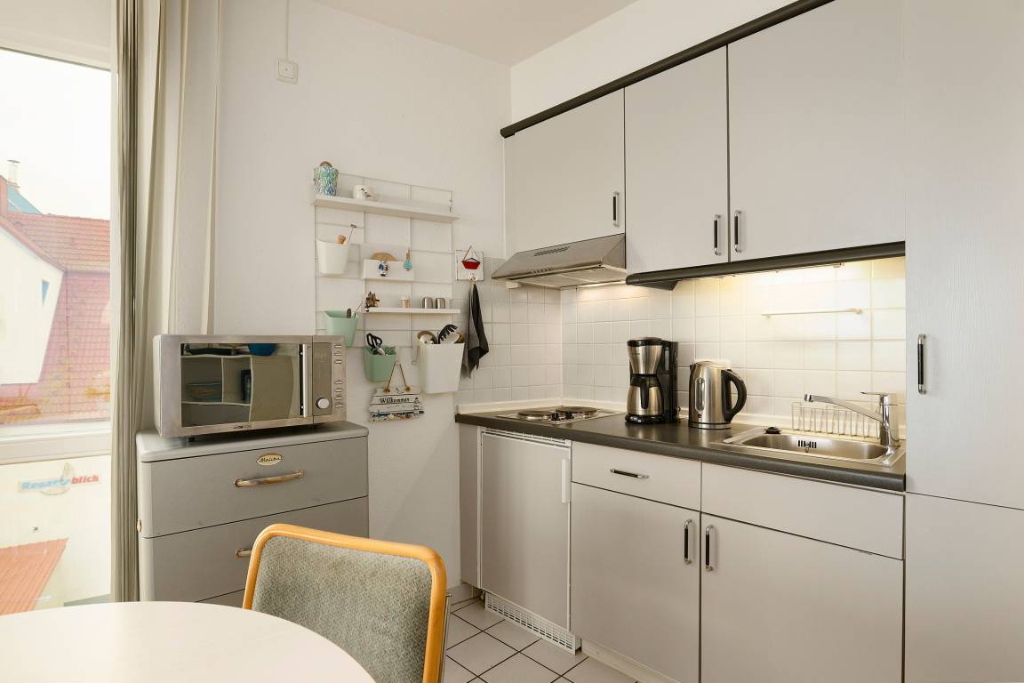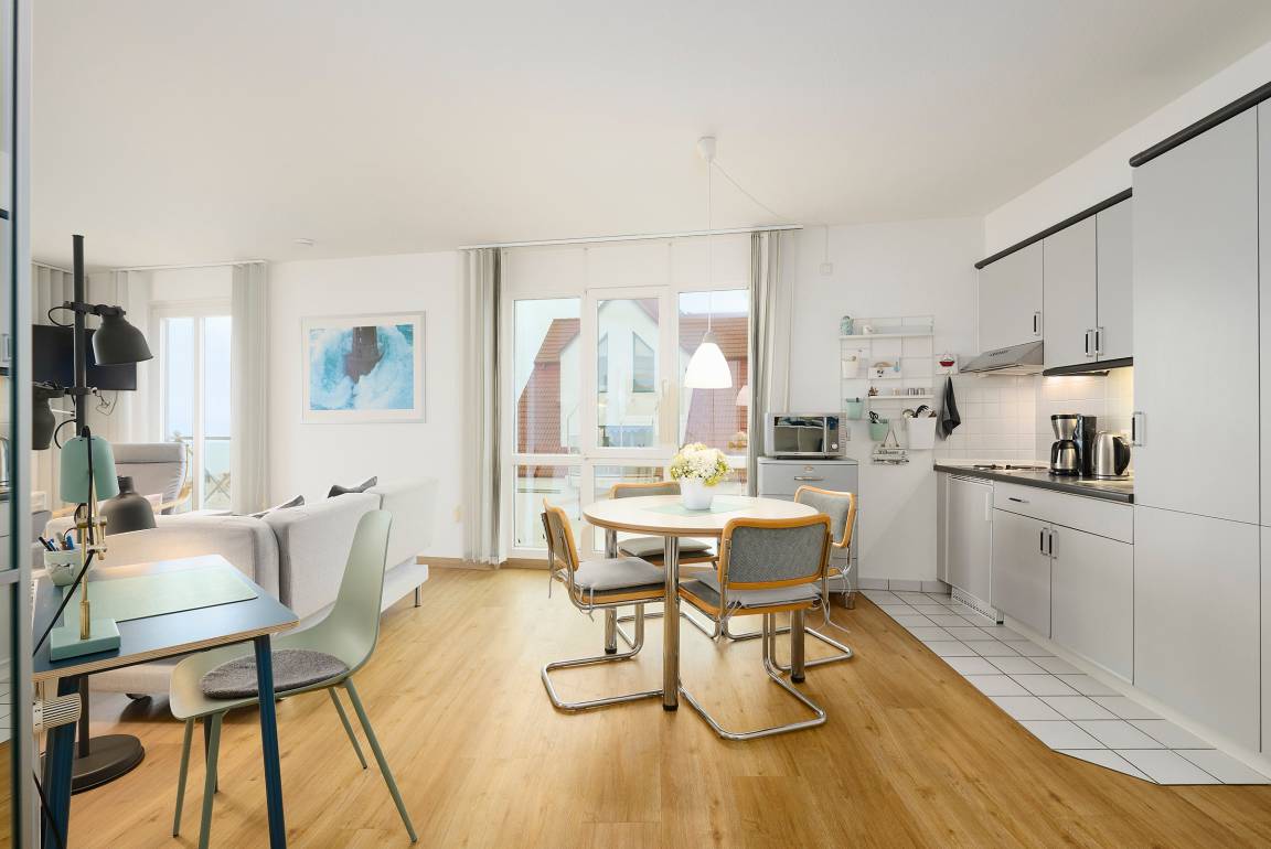 Der komfortabel aufgeteilte Wohn-, Ess- und Schlafbereich besticht durch die großen Fensterfronten. Für die Sommermonate gibt es sogar eine Außenmarkise zum Verdunkeln und gegen die Wärme. In der kleinen Küche des geräumigen Appartements lassen sich kleinere Gerichte prima zubereiten. Von dem hochwertigen Komfort-Schlafsofa aus lässt sich das bunte Treiben beobachten. Abgerundet wird diese Ferienunterkunft durch ein funktionales Duschbad. Für Ihre Urlaubswäsche stehen Ihnen gemeinschaftlich nutzbare Waschmaschinen und Trockner zur Verfügung (Münzgeräte).