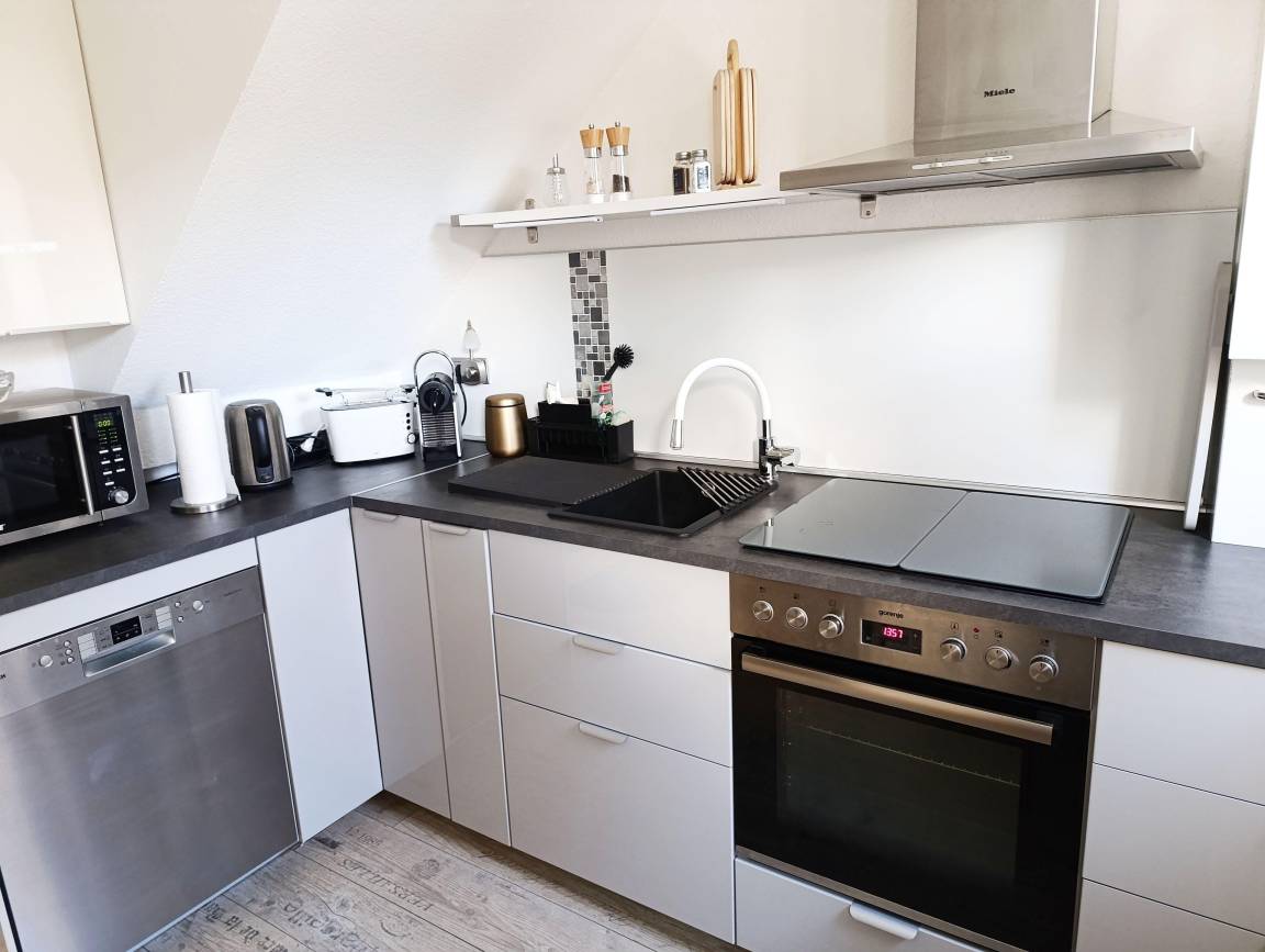 Die separate Küche ist modern eingerichtet und bietet Ihnen genügend Platz, um ein leckeres Essen zuzubereiten. Hierfür stehen Ihnen ein Induktionsherd, ein großer Kühlschrank mit Eisfach, ein Geschirrspüler, eine Mikrowelle und vieles vieles mehr zur Verfügung. Außerdem finden Sie ausreichend Geschirr und Besteck vor. Im Erdgeschoss finden Sie auch das Badezimmer mit Dusche und WC vor.