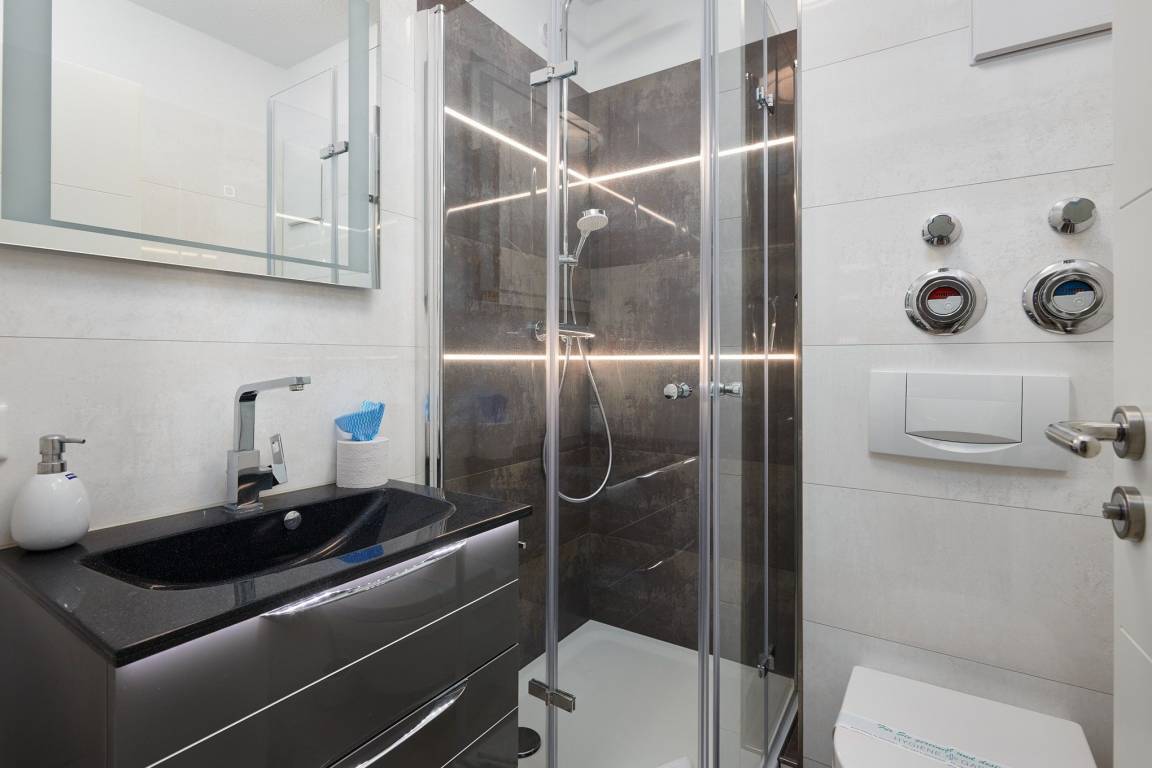 Die Wohnung besteht aus einer kleinen Küche mit Mikrowellengrill und Creanfeld, einem Badezimmer mit Dusche und einem Wohnbereich mit einer Schlafcouch. Das Schlafsofa hat komfortable Maße von 180x200 cm - hier können 2 Personen gemütlich träumen. Mit nur einem Handgriff verwandeln Sie die Couch in ein bequemes Bett, sogar mit Lattenrost. Das Schlafzimmer ist mit einem Polsterbett mit 7-Zonen-Taschenfederkern als Doppelbett (160x200 cm) ausgestattet. Die Matratzen haben unterschiedliche Härtegrade. Alle Fenster haben Verdunklungsplissees. Das Badezimmer mit Dusche/ WC verfügt über eine mit Glas verkleidete Duschkabine, eine Regendusche und einen Handtuchheizkörper. Im Untergeschoss befindet sich eine Waschkeller mit Münz-Waschmaschine, Trockner und Bügeleisen.