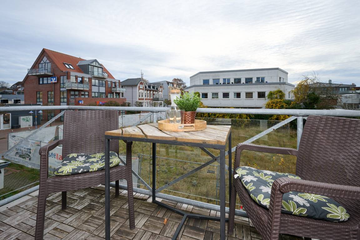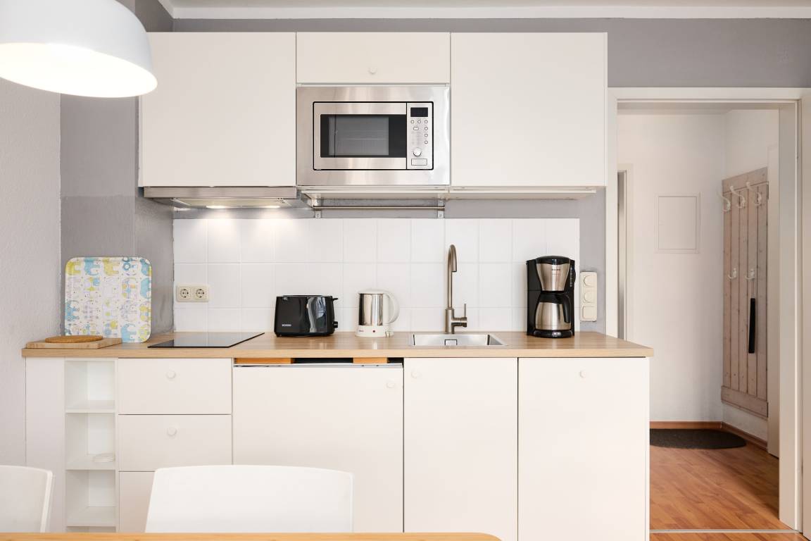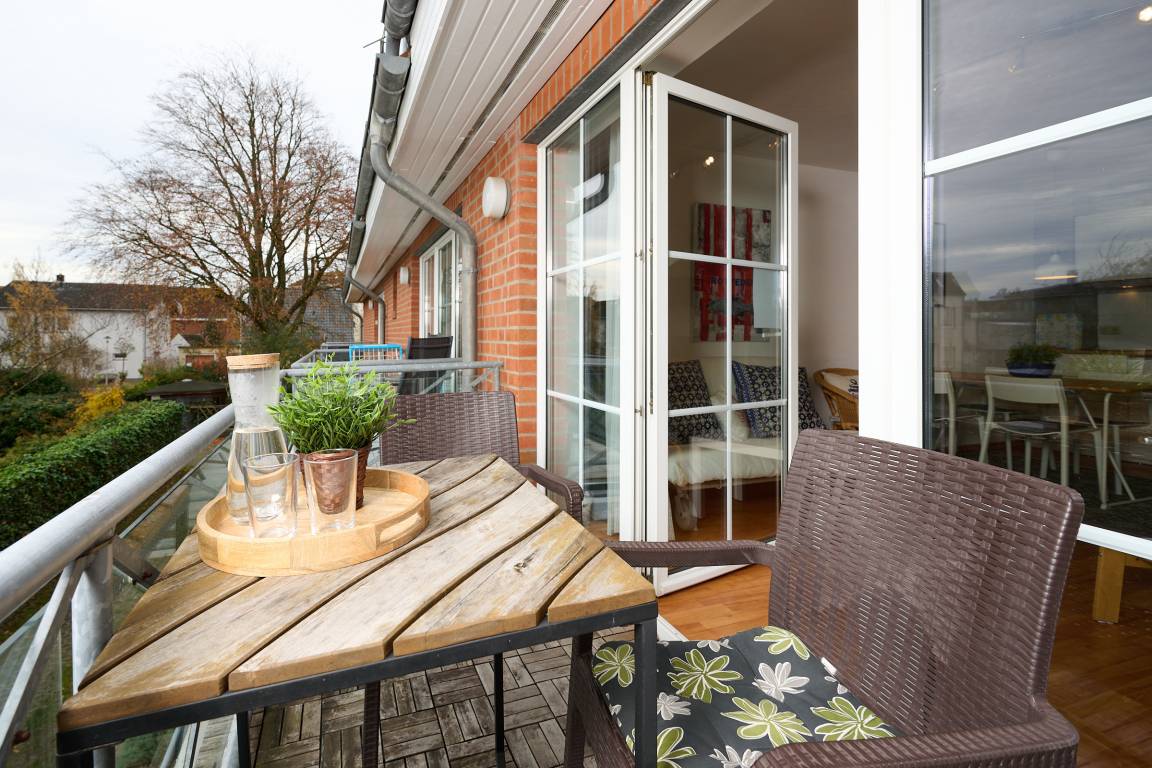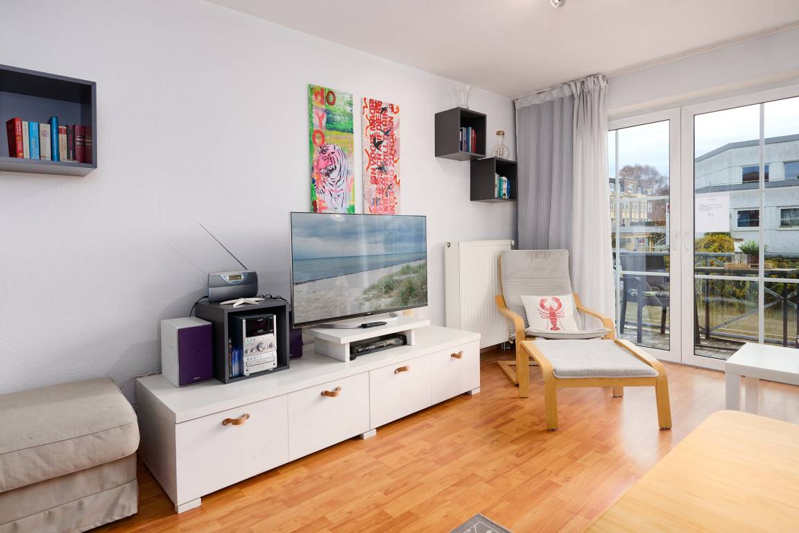 Die Wohnung befindet sich im Appartementhaus Altes Kapitänshaus am Probsteier Platz. Es verfügt über einen kombinierten Wohn-Schlafraum mit einer Schlafcouch (160x200 cm), einem Schlafzimmer mit Doppelbett, Küchenzeile mit Spülmaschine, Essecke und ein helles und geräumiges Bad mit Dusche.