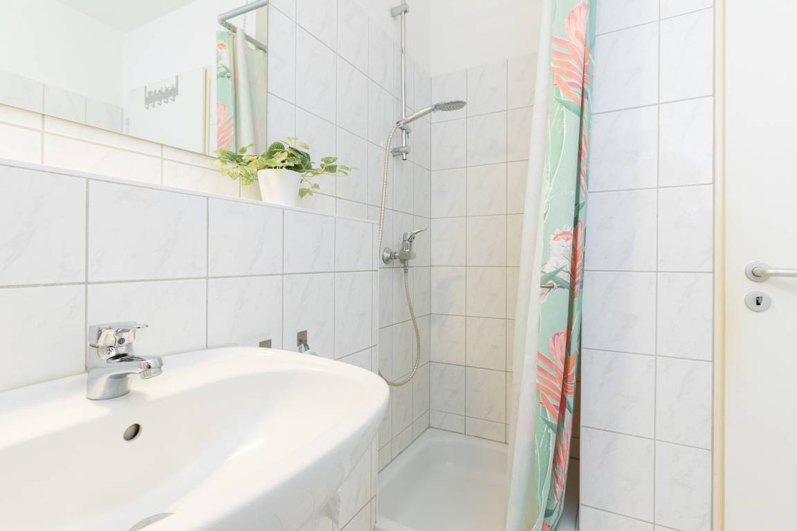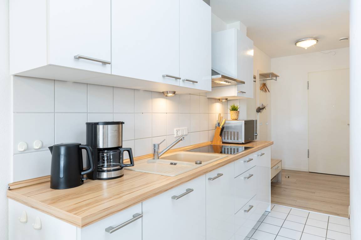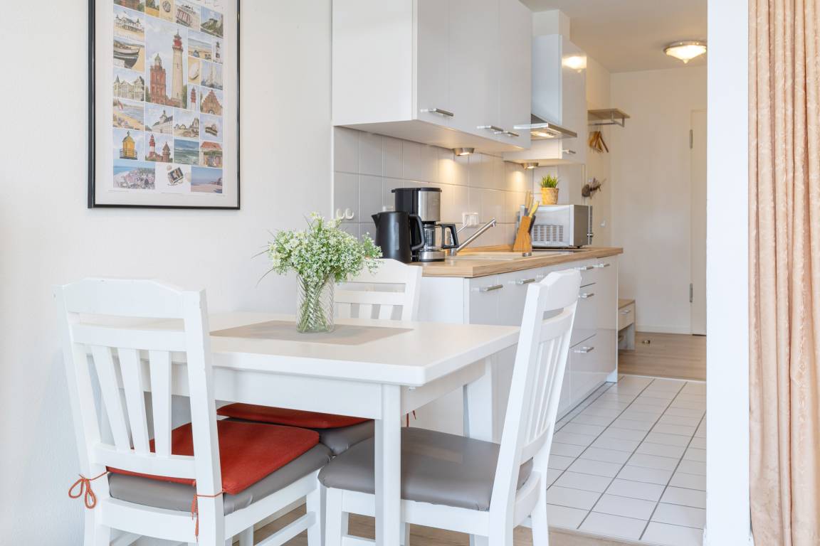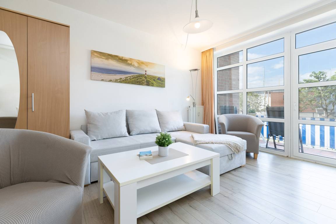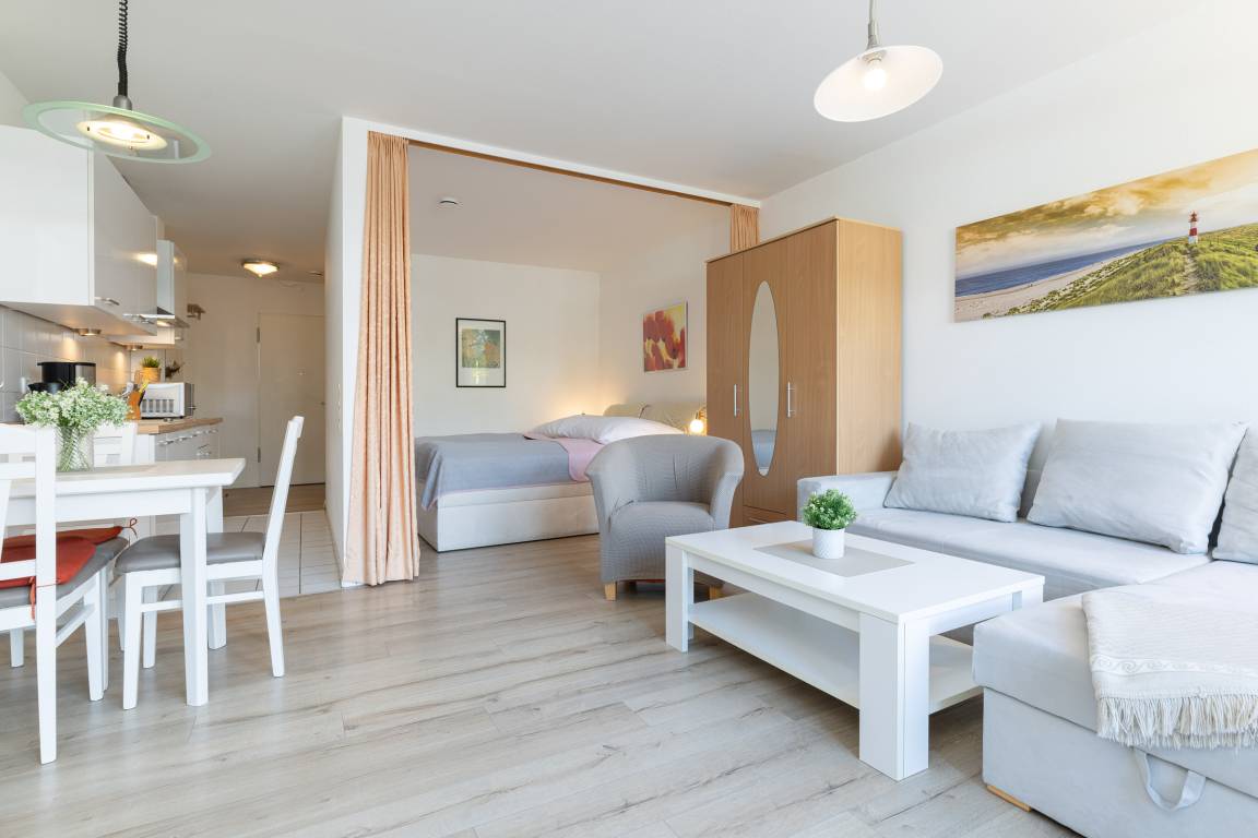 Die Wohnung ist hell und freundlich eingerichtet. Das Appartement verfügt über eine kleine Küchenzeile mit Induktionsherd, einem Essplatz sowie einer Schlafcouch und Doppelbett (180x200cm). Vom Balkon genießen Sie an lauen Sommerabenden und einem Gläschen Wein die etwas eingeschränkte Seesicht.