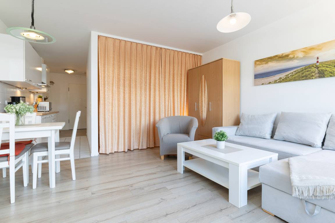 Herzlich Willkommen in der ca. 40 m² großen 1-Zimmer-Ferienwohnung im 1. Stock der Appartementanlage Hafenresidenz, nur wenige Schritte vom Hafen und Strand entfernt. Bis zu 3 Personen können hier in Ruhe einen wundervollen Ostseeurlaub genießen.