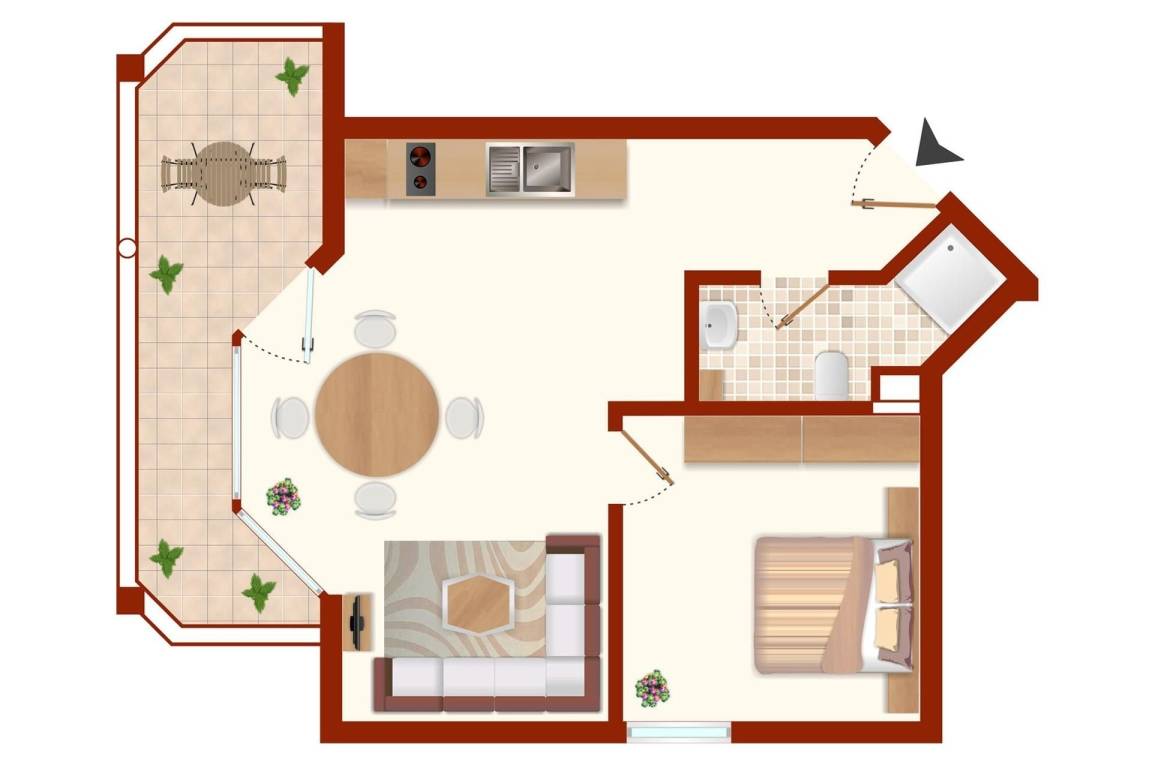 42 m² Ferienwohnung ∙ 1 Schlafzimmer ∙ 2 Gäste