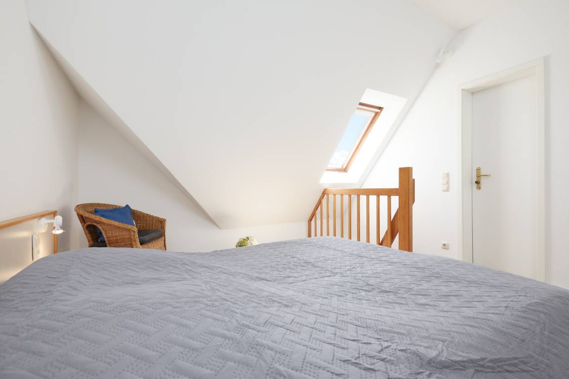 Der schöne Ausblick reicht von der Außenförde mit Leuchtturm, Surfrevier und Ehrenmal über das Stadtpanorama mit Windmühle bis zum Yachthafen. Der Schlafraum ist über eine Sambatreppe (Raumspartreppe) zu erreichen. Gäste, die es bequemer haben möchten, können auch den gesonderten Eingang direkt vom Treppenhaus mit Vorflur benutzen.