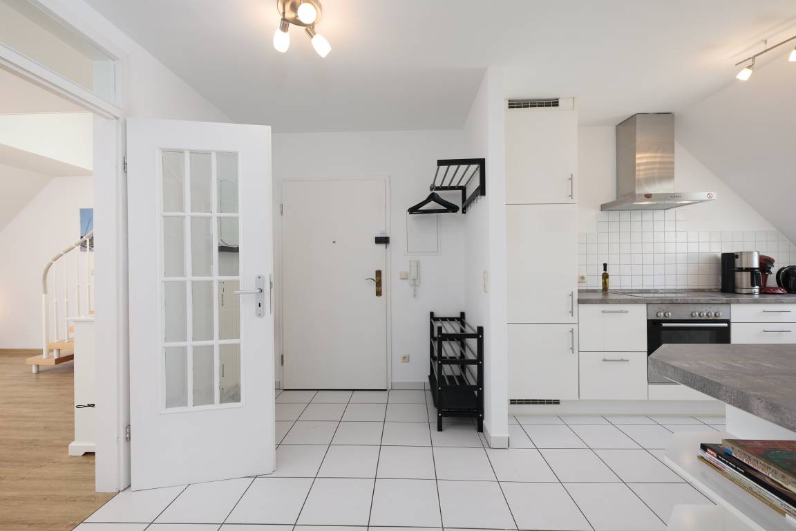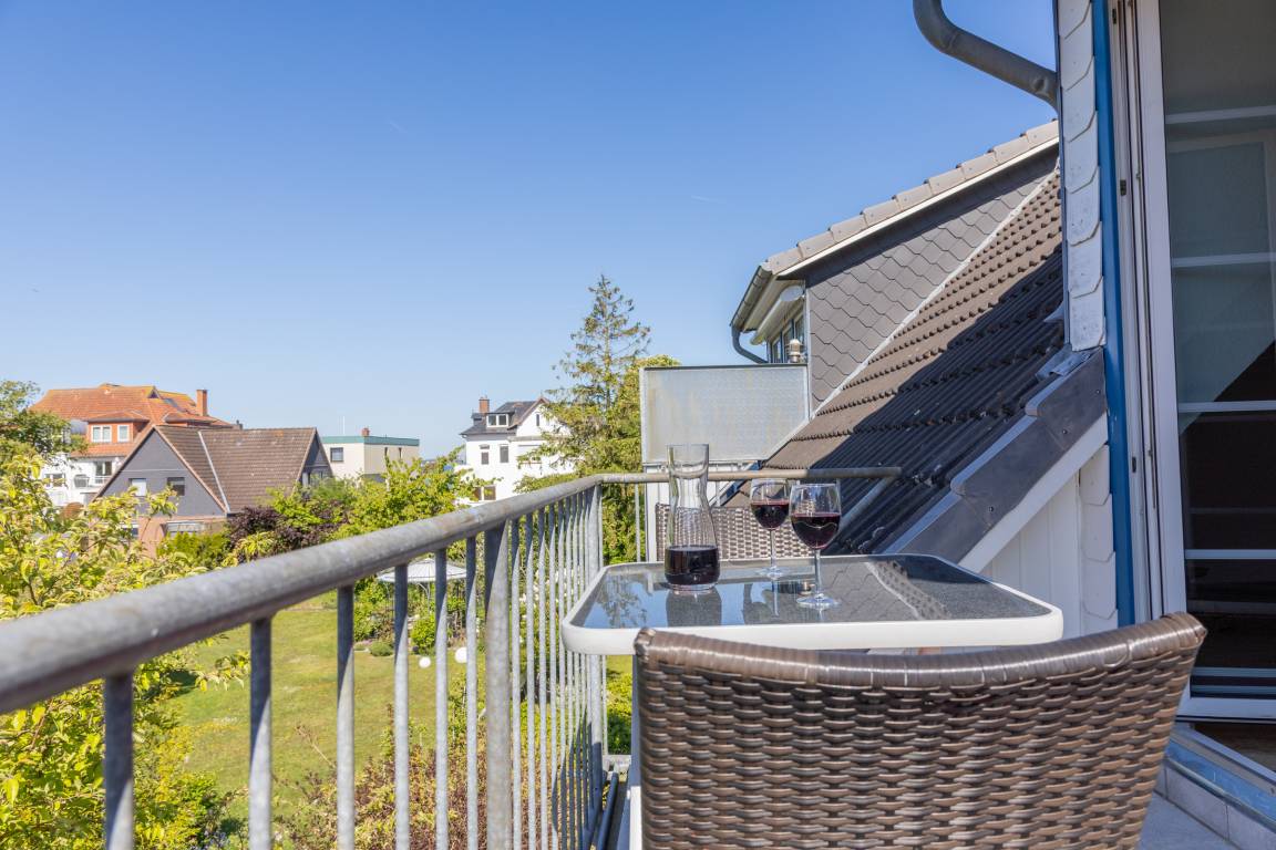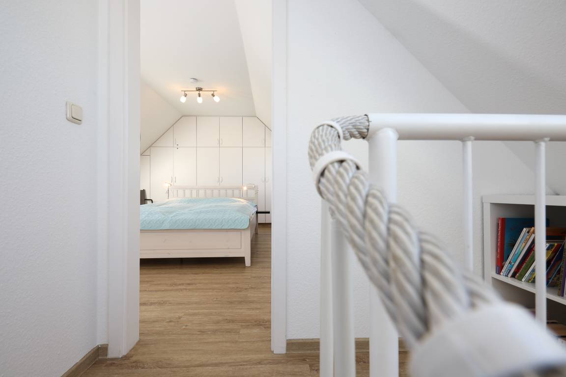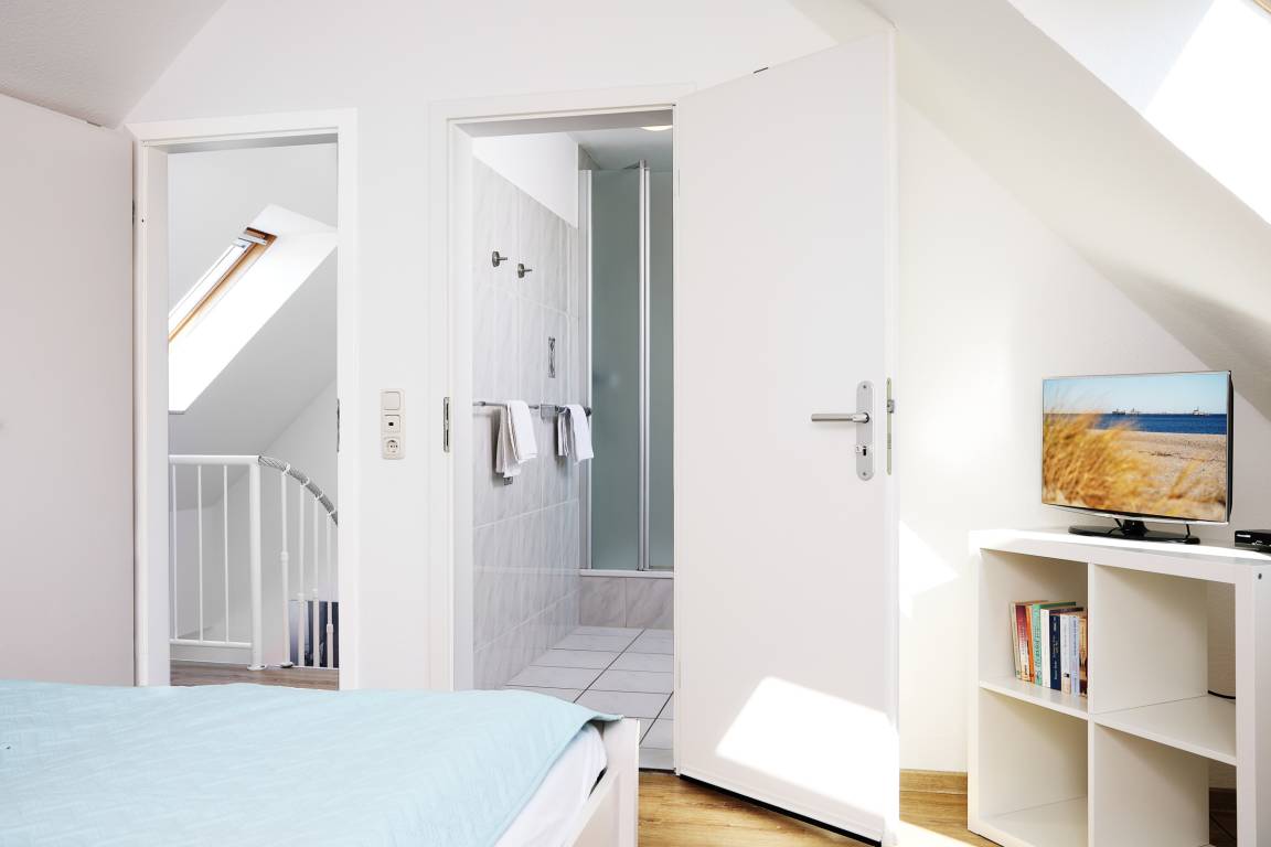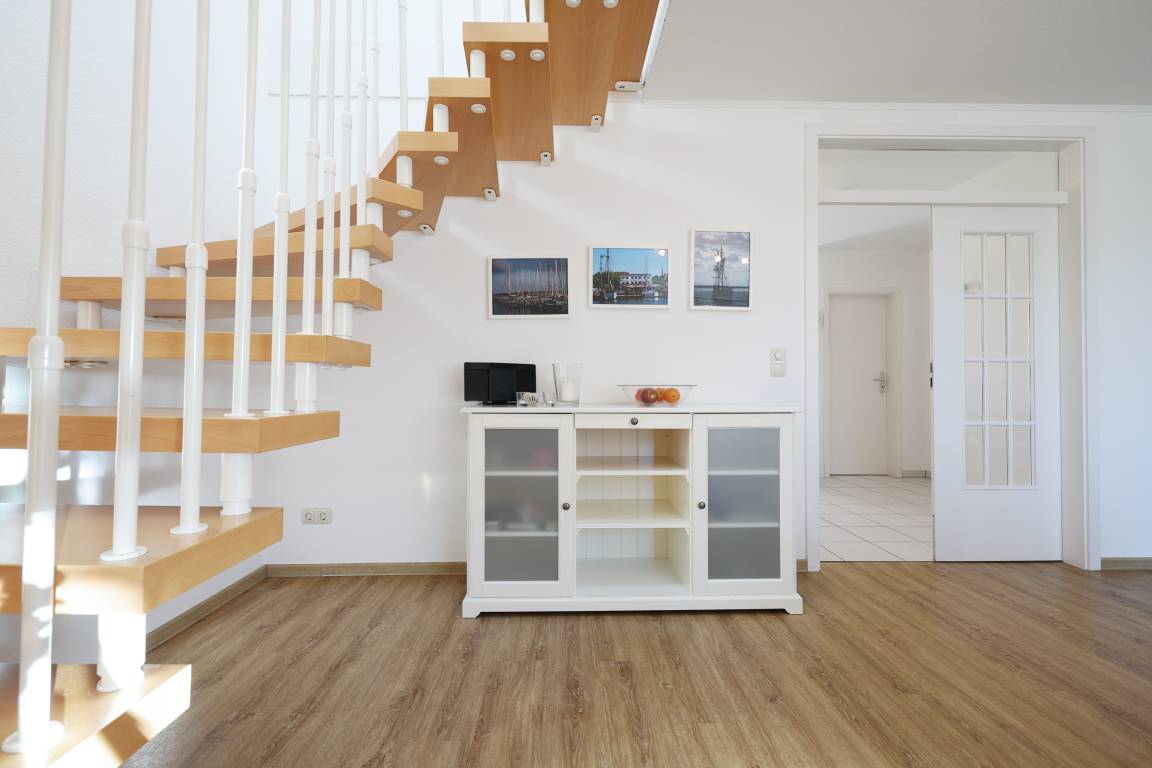 Die Wohnung verfügt insgesamt über 3-Zimmer. Das geräumige Wohn- Esszimmer hat eine Größe von fast 34 m² und ist von der Küche aus einzusehen. Die Küche ist mit allem ausgestattet, was das Herz eines oder mehrerer Köche erfreut. Auf der gleichen Etage befindet sich auch noch ein kleines, gemütliches Schlafzimmer. Auf beiden Ebenen finden Sie jeweils ein Bad, ausgestattet mit Dusche und Haartrockner. Zur oberen Ebene gelangen Sie über eine Buchenholztreppe aus dem Wohnzimmer. Durch seine Schrägen und die Fenster im Giebel ist es ein besonders heimeliger und lichtdurchfluteter Raum. Viele Fenster fangen das Licht ein und gewähren Ihnen einen schönen Weitblick ins Grüne. Sogar die Ostsee ist, im Winter mehr und im Sommer weniger, zu sehen. Der Balkon ist nach Süd-West ausgerichtet, sodass Sie den ganzen Tag die Sonne und den schönen Blick genießen können. Der kleine Ostseeblick zwischen den Häusern der Strandstraße bietet eine willkommene Abwechselung!