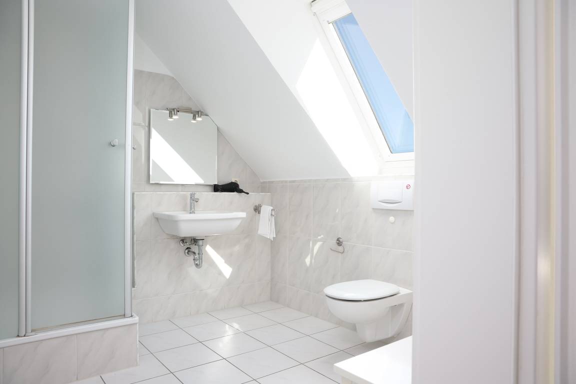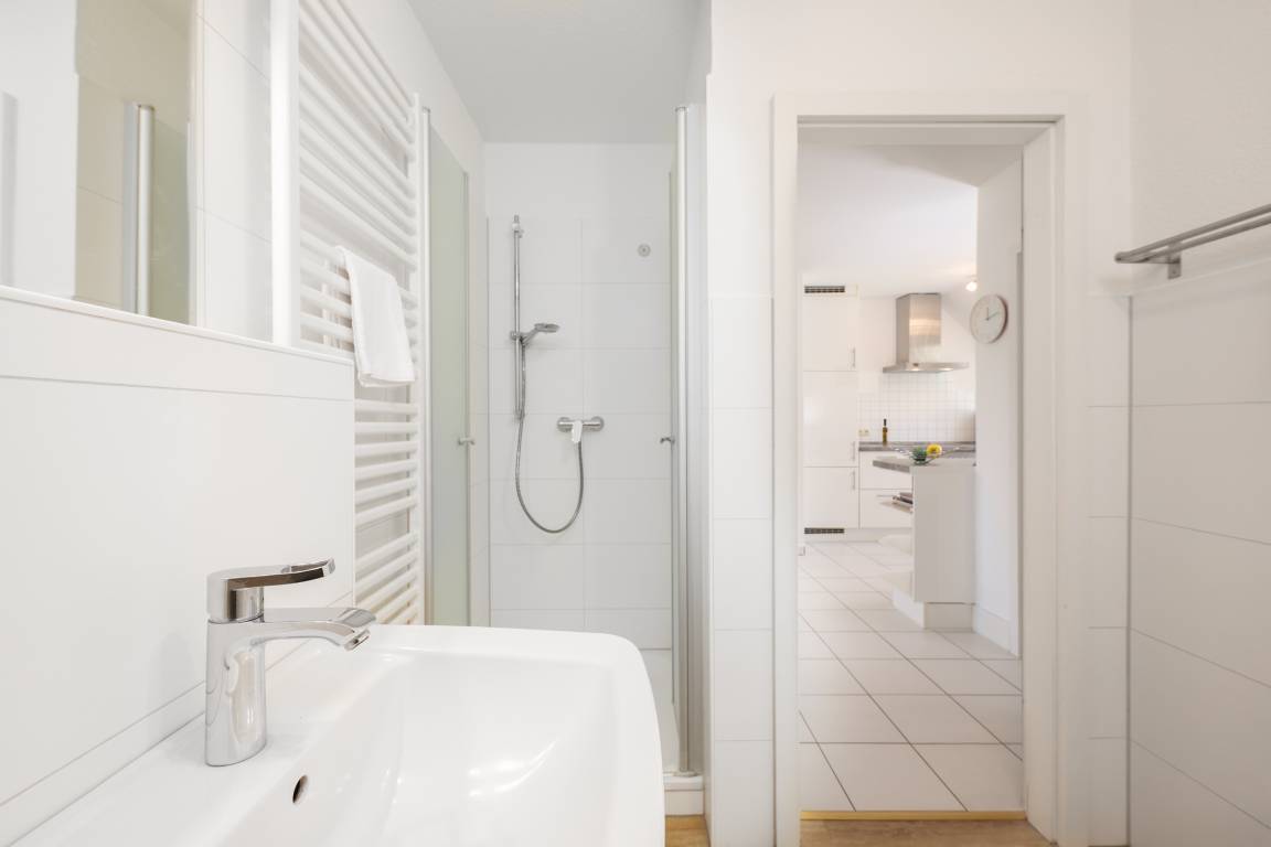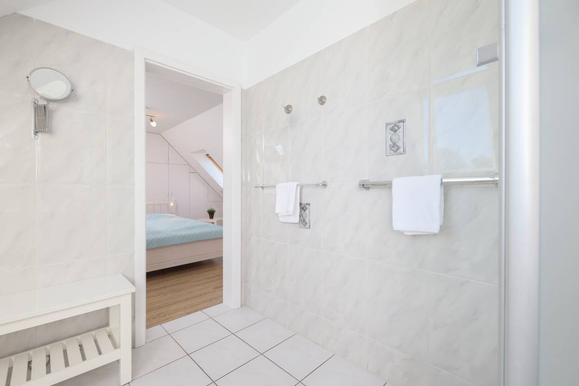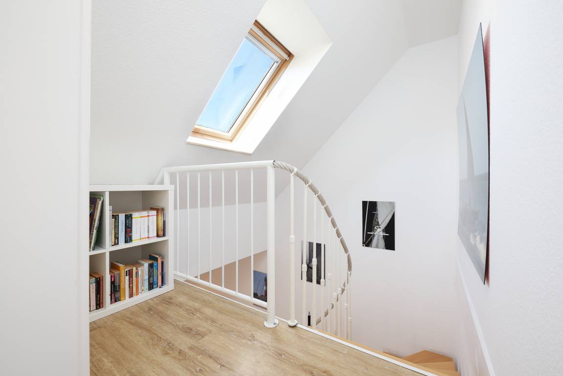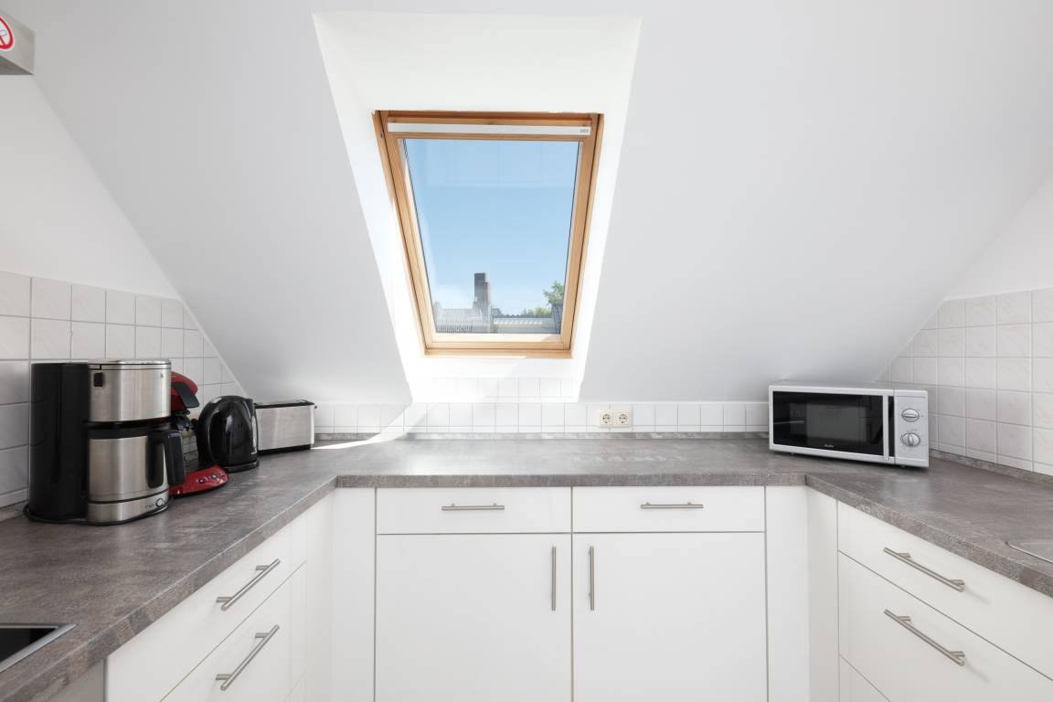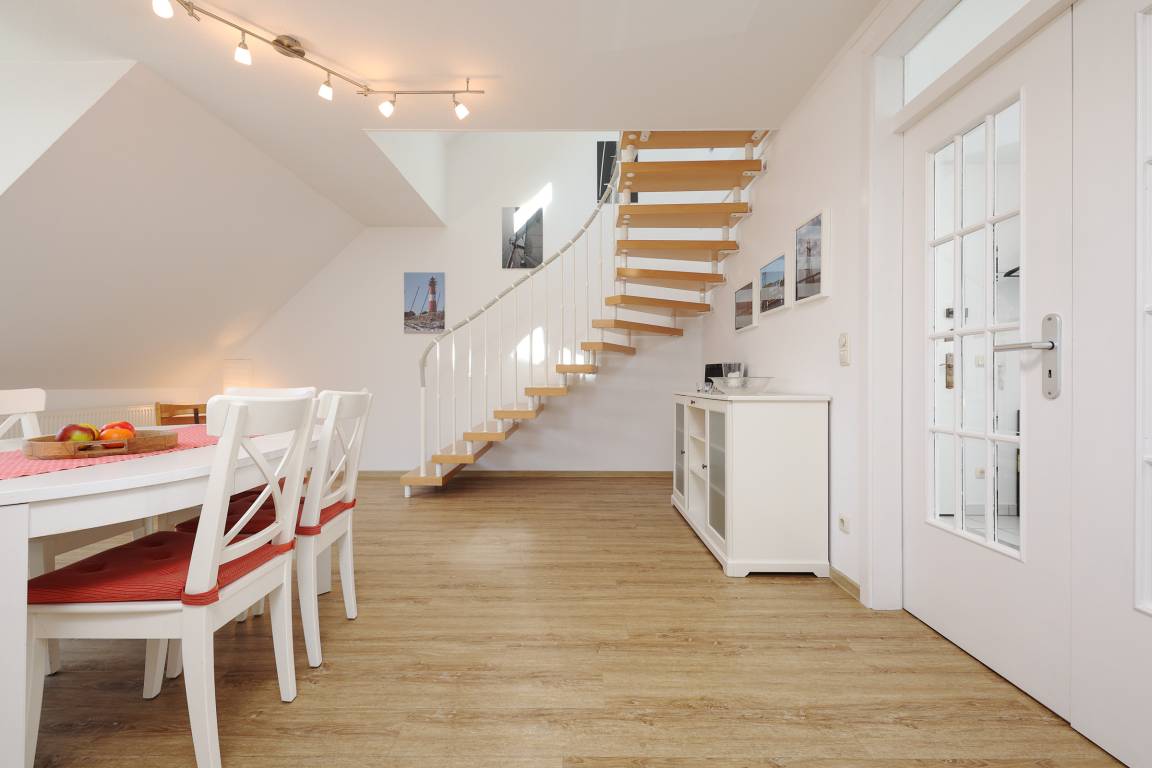 Die Wohnung verfügt insgesamt über 3-Zimmer. Das geräumige Wohn- Esszimmer hat eine Größe von fast 34 m² und ist von der Küche aus einzusehen. Die Küche ist mit allem ausgestattet, was das Herz eines oder mehrerer Köche erfreut. Auf der gleichen Etage befindet sich auch noch ein kleines, gemütliches Schlafzimmer. Auf beiden Ebenen finden Sie jeweils ein Bad, ausgestattet mit Dusche und Haartrockner. Zur oberen Ebene gelangen Sie über eine Buchenholztreppe aus dem Wohnzimmer. Durch seine Schrägen und die Fenster im Giebel ist es ein besonders heimeliger und lichtdurchfluteter Raum. Viele Fenster fangen das Licht ein und gewähren Ihnen einen schönen Weitblick ins Grüne. Sogar die Ostsee ist, im Winter mehr und im Sommer weniger, zu sehen. Der Balkon ist nach Süd-West ausgerichtet, sodass Sie den ganzen Tag die Sonne und den schönen Blick genießen können. Der kleine Ostseeblick zwischen den Häusern der Strandstraße bietet eine willkommene Abwechselung!