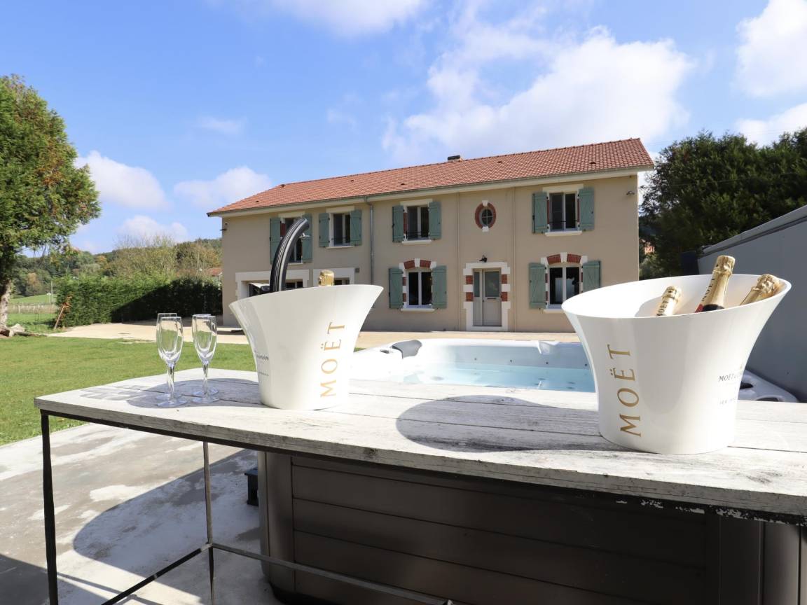 Hausbeschreibung : Willkommen in diesem hübschen, komplett renovierten Landhaus in der ländlichen Umgebung der Champagne Ardennes! Es bietet 6 schöne, geräumige Schlafzimmer mit eigenem Bad und Klimaanlage. Im Erdgeschoss haben Sie eine sehr schöne, voll ausgestattete Küche mit Kühlraum, ein gemütliches Wohnzimmer und ein Spielzimmer mit Billard und Darts. Im Außenbereich finden Sie eine große Terrasse mit Jacuzzi, Außendusche, OFYR-Grill, 2 Bouleplätze und bequeme Gartenmöbel.