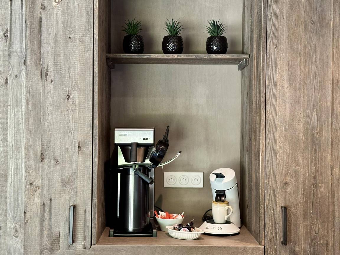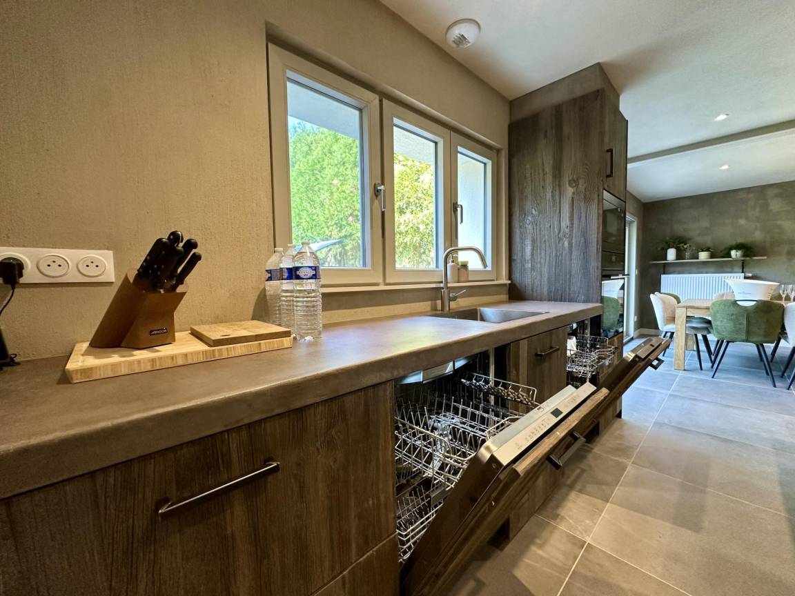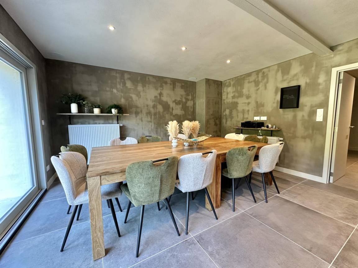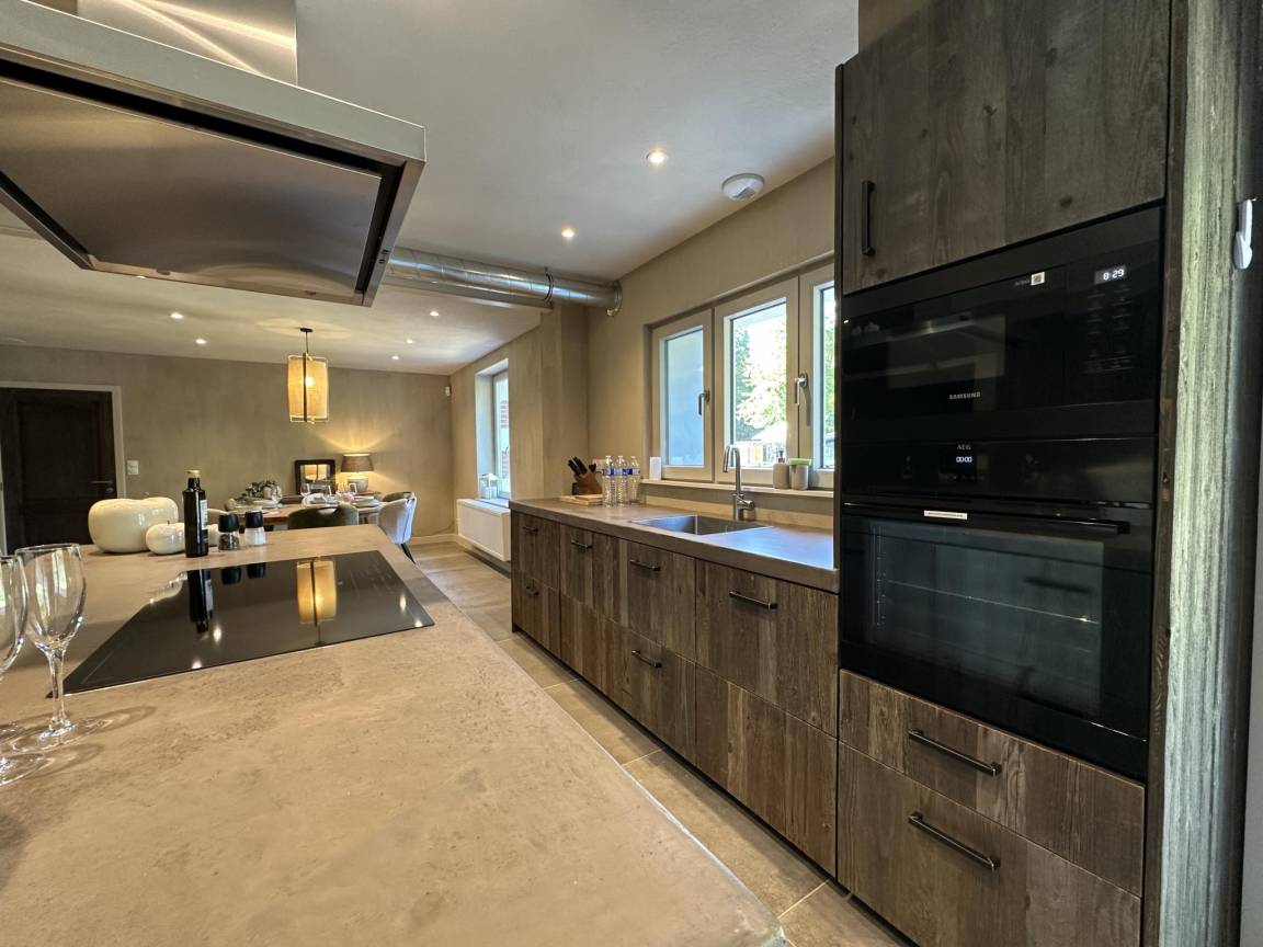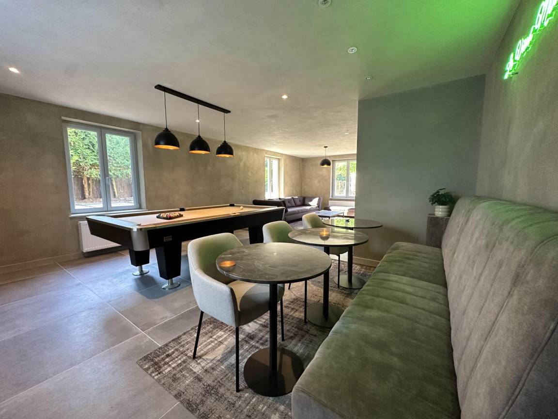 Layout : Parterre: Eingang, Aufenthaltsraum mit TV, Dekokamin, Stereoanlage , Esszimmer, Küche mit Kochplatte(5 Kochplatten, Induktion), Wasserkocher, Kaffeemaschine(Filter), Kaffeemaschine(senseo pads), Backofen, Mikrowelle, 2x Geschirrspüler, Kühlschrank, Tiefkühlschrank , Toilette, Waschraum mit Wäschetrockner, Waschmaschine , Freizeitraum mit Dart, Billard , Fahrradabstellraum