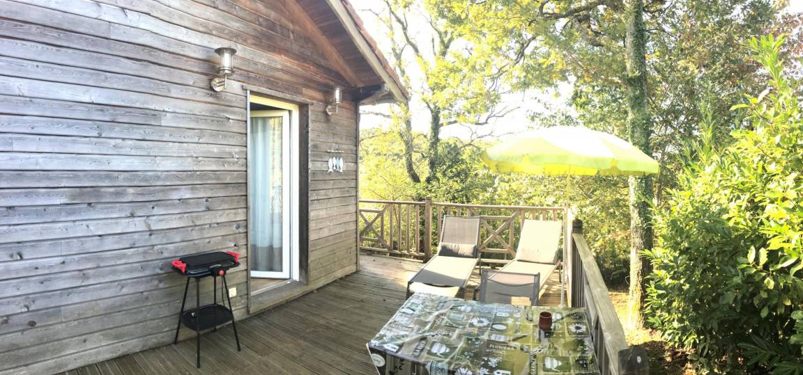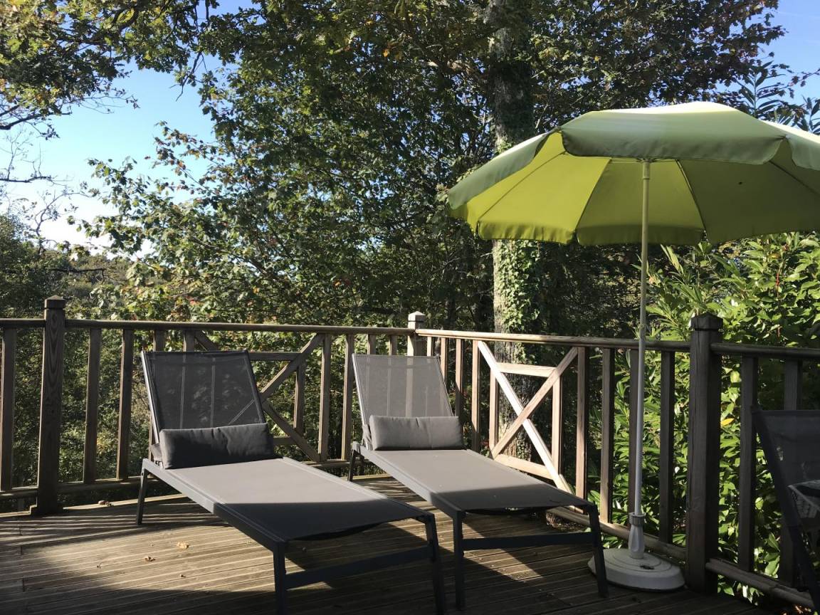 Private Terrasse mit Blick auf den Eichen- und Ahornwald. Gartenmöbel, Liegestühle, Elektrogrill, Plancha.