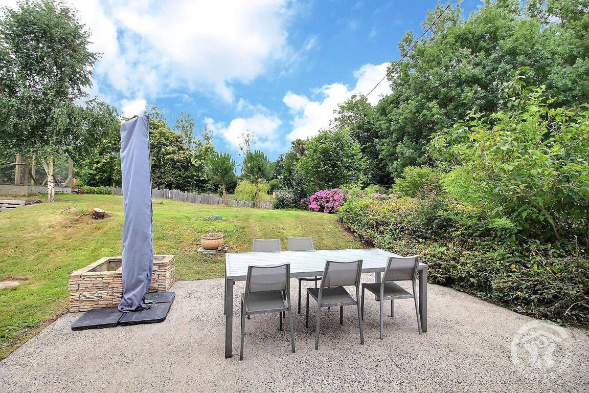 Ein Innenhof mit einem nach Osten ausgerichteten Parkplatz und einem 250 m² großen privaten Grundstück mit Blumen und Bäumen mit einer privaten, nach Westen ausgerichteten Terrasse.