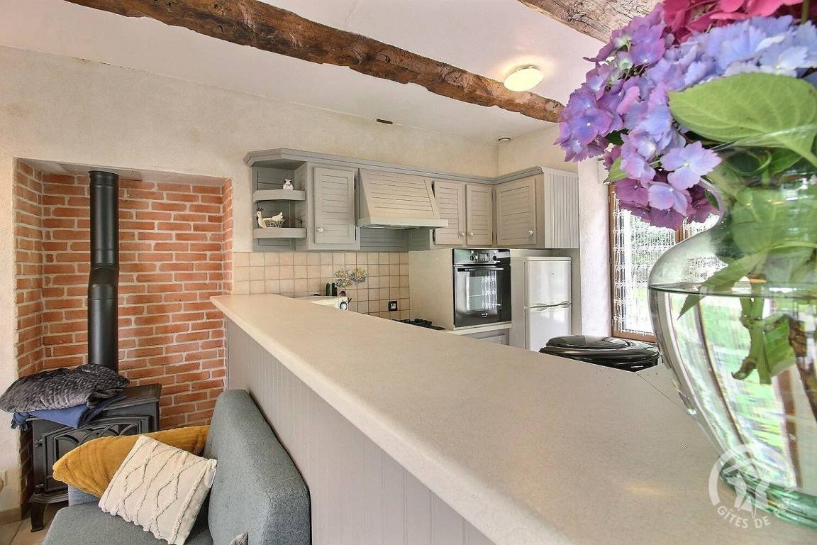 - Wohnzimmer, Aufenthaltsraum mit Einbauküche, Holzofen