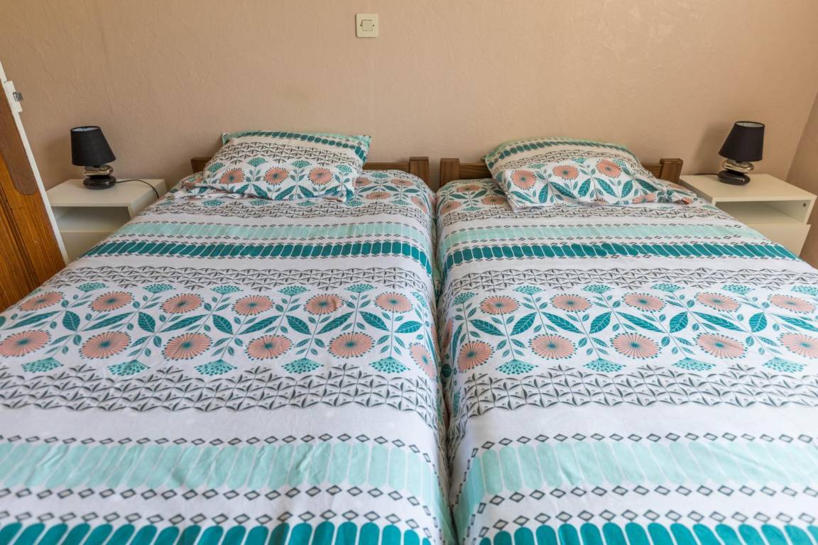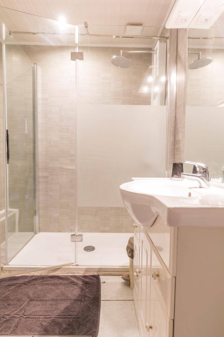 Der Schlafbereich umfasst drei Schlafzimmer: zwei mit Doppelbetten (140 cm) und zwei mit Einzelbetten (90 cm). Die Badezimmer verfügen über eine große Dusche mit Massagedüsen und beheiztem Handtuchhalter sowie ein separates WC. Die Waschmaschine befindet sich im Hauswirtschaftsraum, der auch ein Waschbecken bietet.