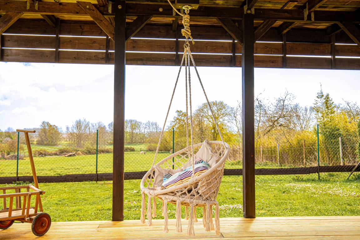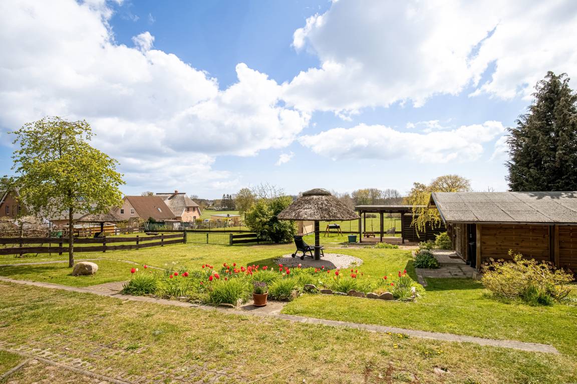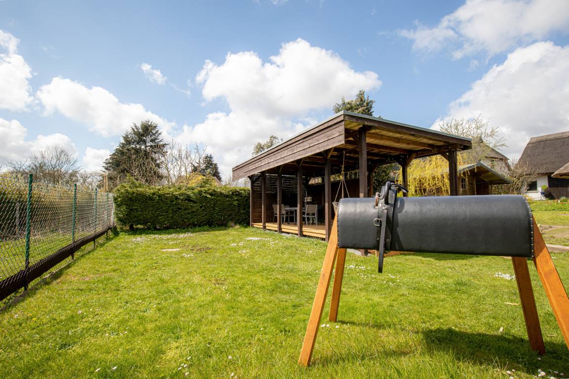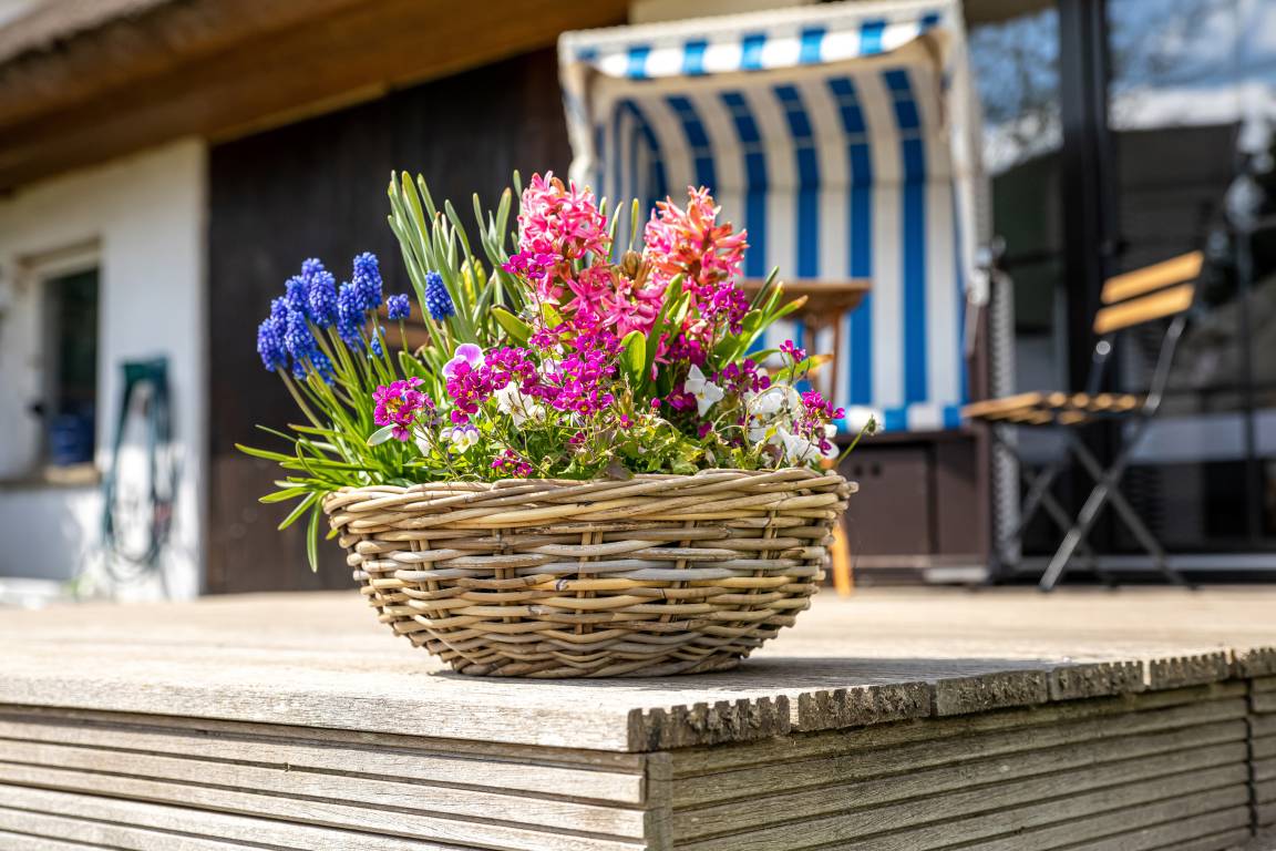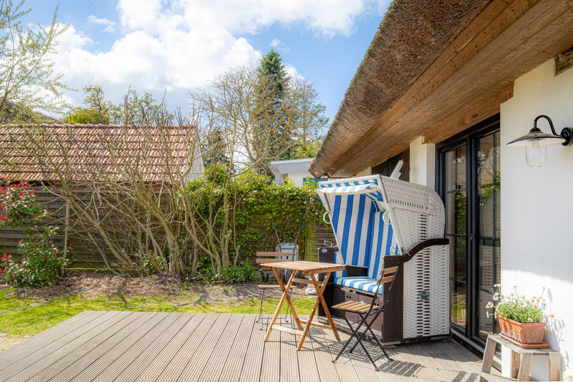 Ein weiteres Plus ist das ca 1000qm große und gepflegte Grundstück. Neben einer privaten Sauna (separat buchbar) und einer Terrasse mit Strandkorb, punktet das Grundstück mit einer weiteren, überdachten Terrasse. So können Sie entweder Schatten im Hochsommer, oder Schutz bei Witterung suchen und sind trotzdem inmitten der Natur.