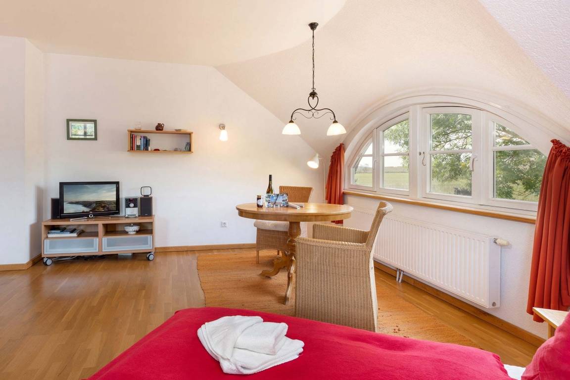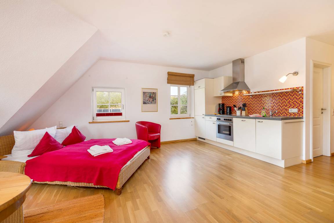 „Die kleine Rote" ist die ideale Ferienwohnung für ruhesuchende Alleinreisende, aber auch für frisch Verliebte und Paare, die inmitten herrlicher Natur Harmonie und Zweisamkeit genießen möchten. Romantische Dachschrägen, angenehme Naturtöne und das traumhafte Gaubenfenster lassen Ihr Urlaubsdomizil in einladendem Licht erstrahlen. Und damit Sie sich hier auch außerhalb der sommerlichen Badesaison so richtig wohlfühlen können, haben Ihre freundlichen Gastgeber an alles gedacht: Auf den rund 40 liebevoll eingerichteten Quadratmetern Wohnfläche erwarten Sie neben einem kuschligen Doppelbett (140x200cm), einer komplett ausgestattete Küchenzeile und einem schönen Wannenbad auch ein moderner Flachbild-TV, Radio/CD-Player und kostenfreies W-LAN.
