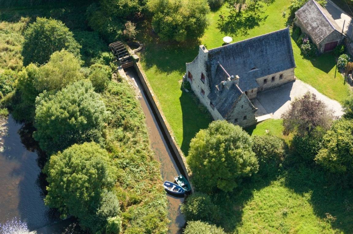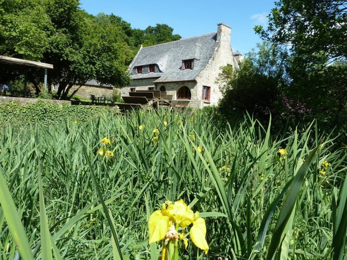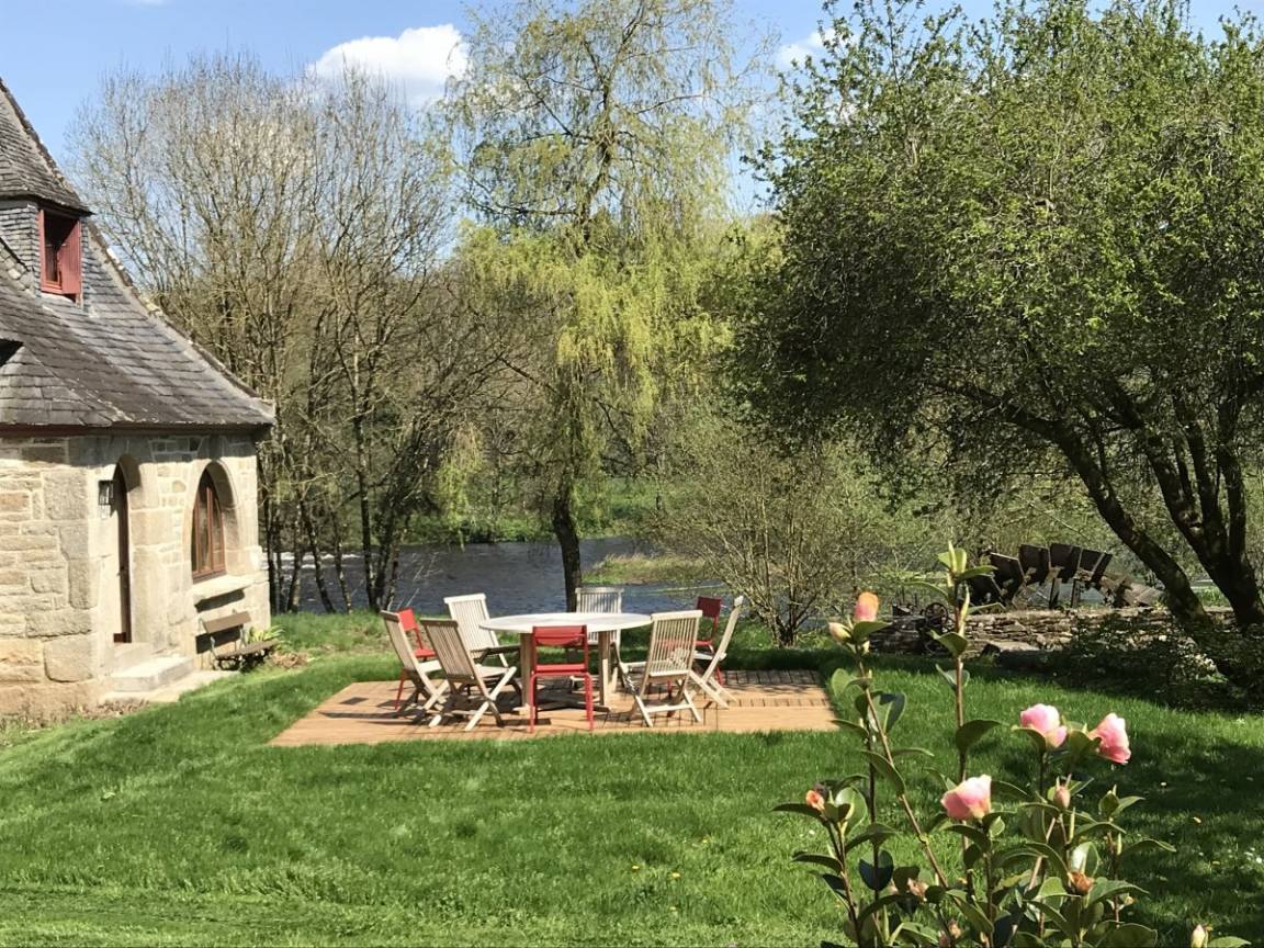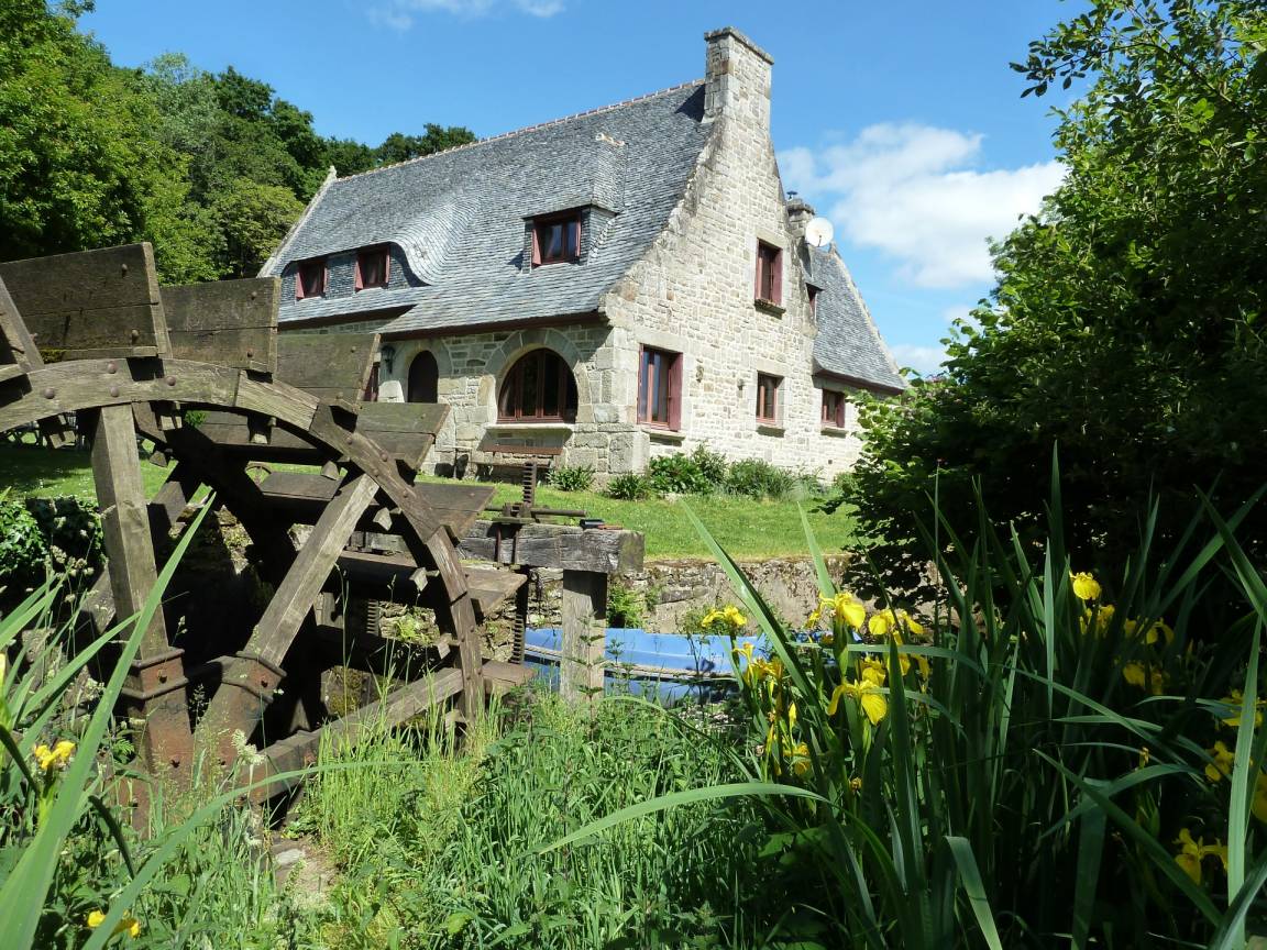 Eine ehemalige Mühle mit viel Charme am Ufer des Flusses Aulne Gîte (für 8 bis 9 Personen) in grüner Umgebung / Bettwäsche wird gestellt. EG: Küche, Wohn-/Esszimmer mit Kamin, 2 Doppelzimmer (jeweils mit Bettbreite 1,60m), Dusche, sep. WC. 1.Stock: 2 Doppelzimmer (jeweils mit Bettbreite 1,60m),Dusche/WC. Ölzentralheizung. WiFi. Garten, Gartenmöbel, Grill. Überdachter Platz.