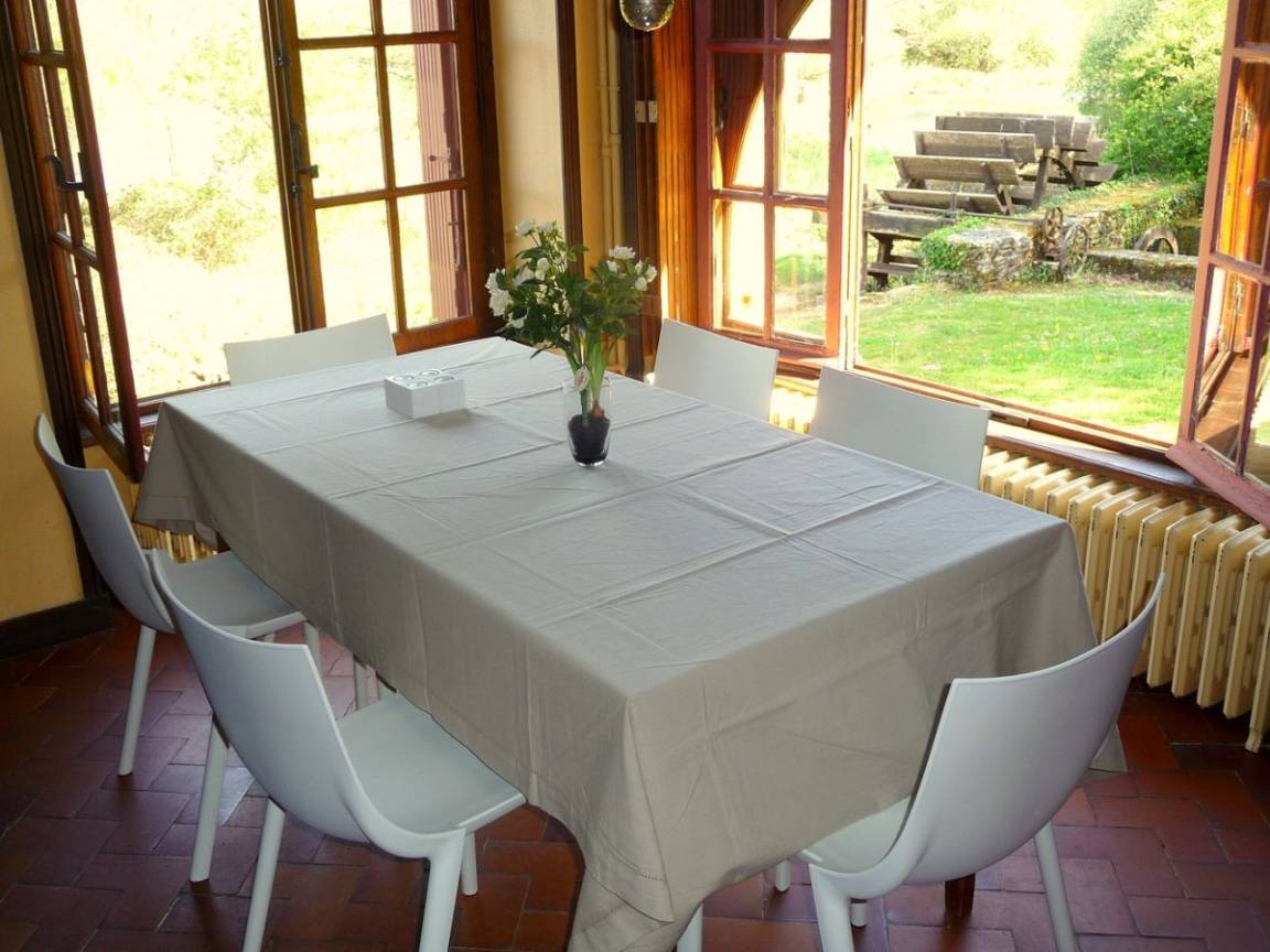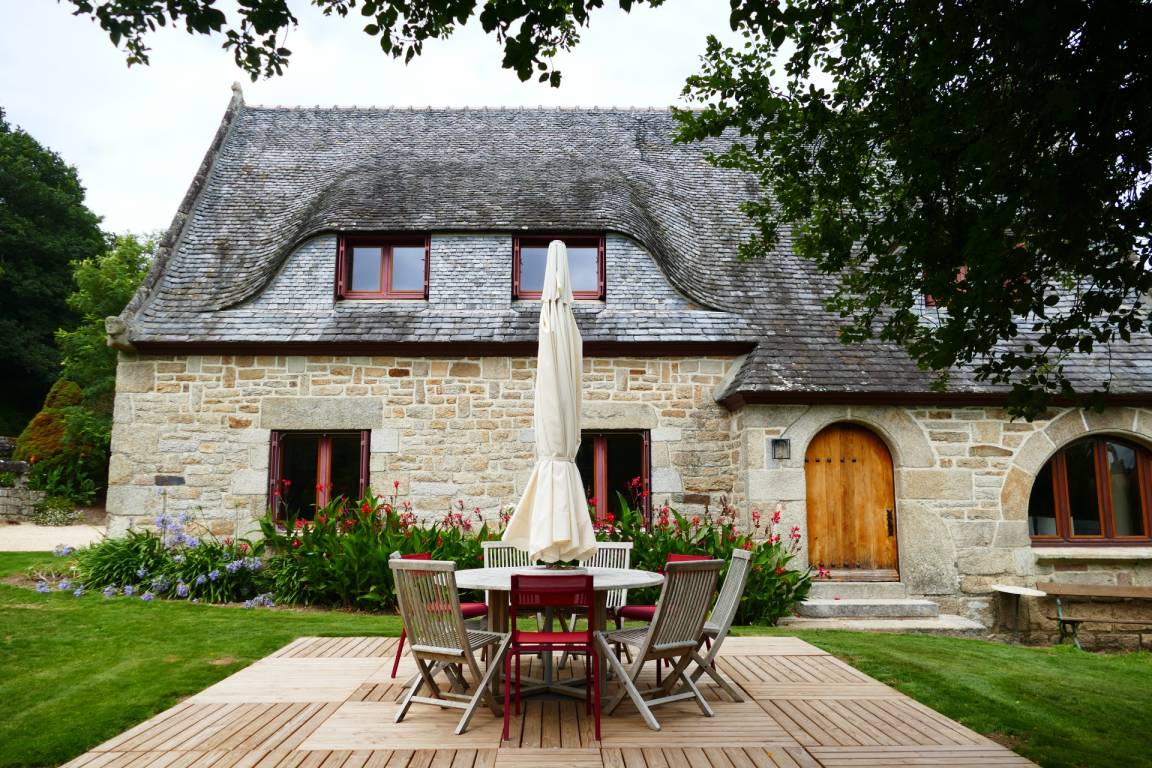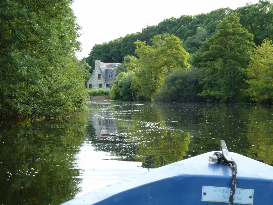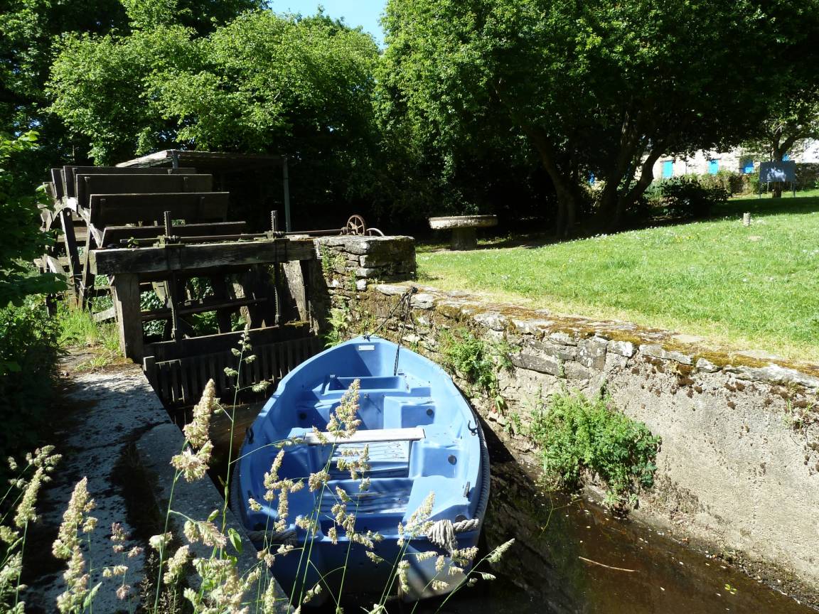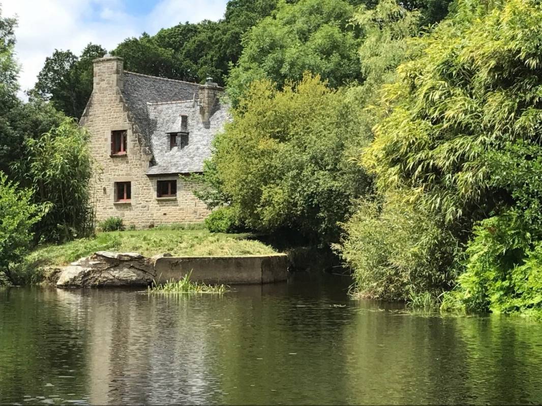 Eine ehemalige Mühle mit viel Charme am Ufer des Flusses Aulne Gîte (für 8 bis 9 Personen) in grüner Umgebung / Bettwäsche wird gestellt. EG: Küche, Wohn-/Esszimmer mit Kamin, 2 Doppelzimmer (jeweils mit Bettbreite 1,60m), Dusche, sep. WC. 1.Stock: 2 Doppelzimmer (jeweils mit Bettbreite 1,60m),Dusche/WC. Ölzentralheizung. WiFi. Garten, Gartenmöbel, Grill. Überdachter Platz.