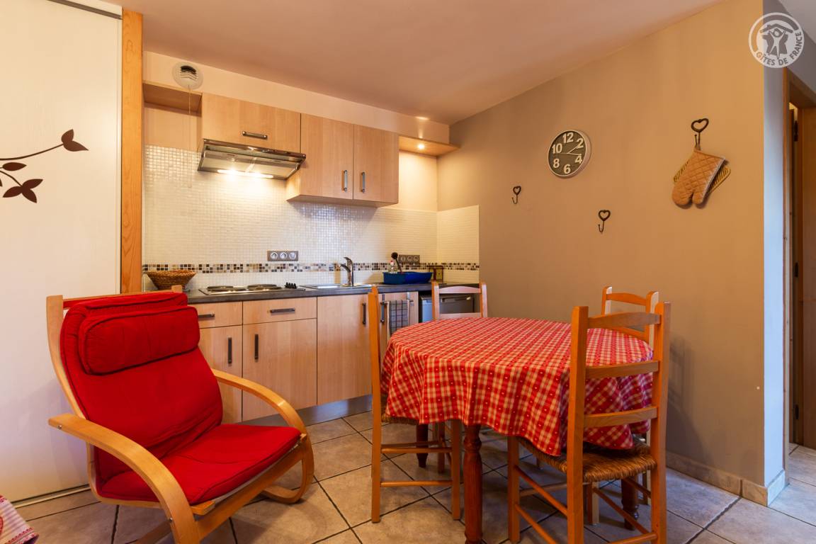 Ferienhaus im 1. Stock einer Residenz mit einem weiteren Ferienhaus und 2 Unterkünften: Wohnzimmer-Küchen-Loungebereich (1 Schlafsofa für 2 Personen), ein Schlafzimmer (2 Einzelbetten) mit Fernseher und Bluetooth-Lautsprecher, ein Badezimmer (Dusche), separat TOILETTE. Balkon.