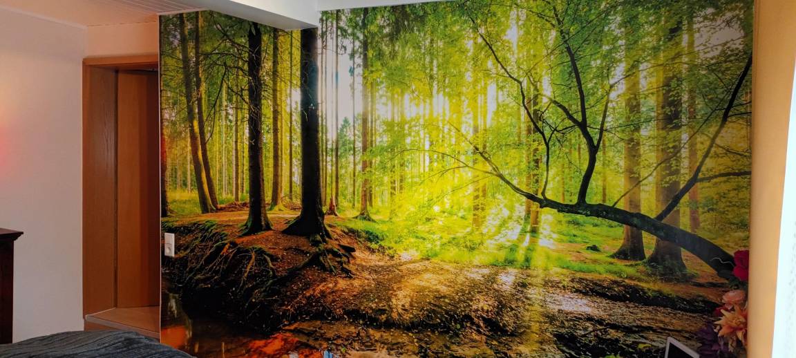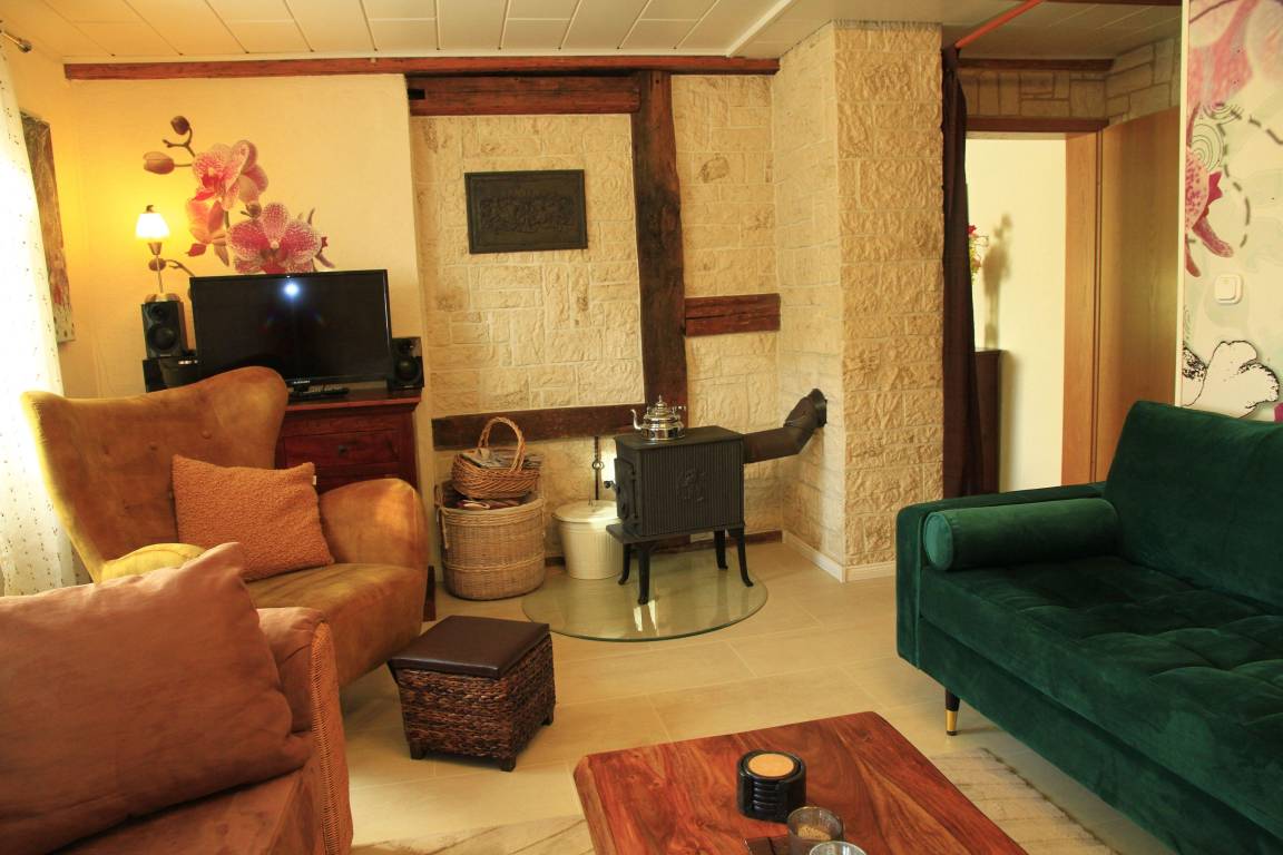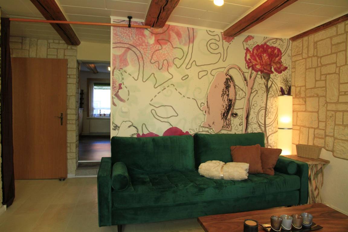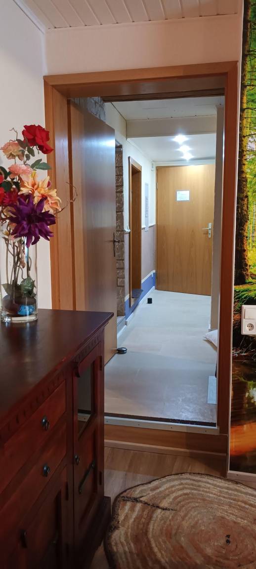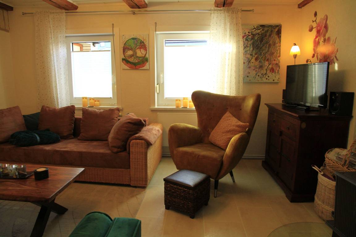 Zu den Annehmlichkeiten gehören ein skandinavischer Holzofen, der gerne für Sie vorbereitet wird, ein LED Flachbildfernseher, eine kleine Musikanlage, aktuelle Harzkrimis, Spiele, diverses Informationsmaterial. Im Wohnzimmer befindet sich ein ausklappbares Rattansofa mit Federkernmatratze, Liegefläche 1,40 m x 2,00 m und ein zweites grünes Sofa aus Samt. Das Wohnzimmer ist durch einen Vorhang vom Flur getrennt.