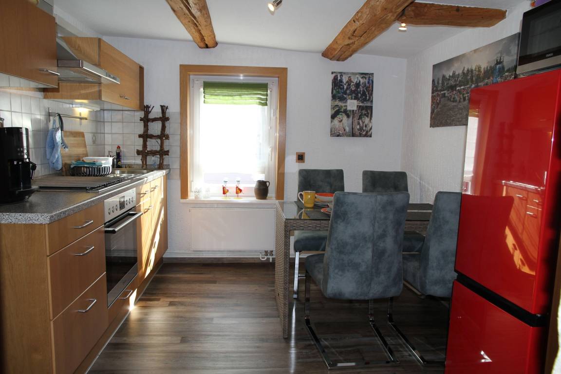 In die Küche führen zwei kleine Stufen. Dort finden Sie eine komplette Einbauküche vor, mit 4-fach Ceran-Feld, Dunstabzugshaube, Backofen, Kühl- und Gefrierkombination, Mikrowelle, Kaffeemaschine, Wasserkocher, Toaster, Eierkocher, umfangreiche Küchenutensilien und einer Sitzgelegenheit für vier Personen.