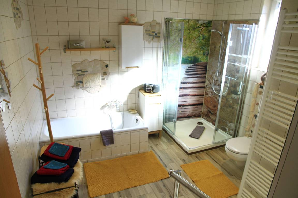 In unserem Bad befinden sich sowohl Badewanne, als auch eine große Dusche mit Faltglaswand für einen bequemen Einstieg , eine Sitzmöglichkeit, ein Wandheizkörper für Ihre Handtücher und ein Fön. Es führen drei Stufen hinunter in das großzügige Badezimmer und ein Geländer ist vorhanden. Im Preis enthalten sind: eine Erstausstattung an Handtüchern und Badelaken.